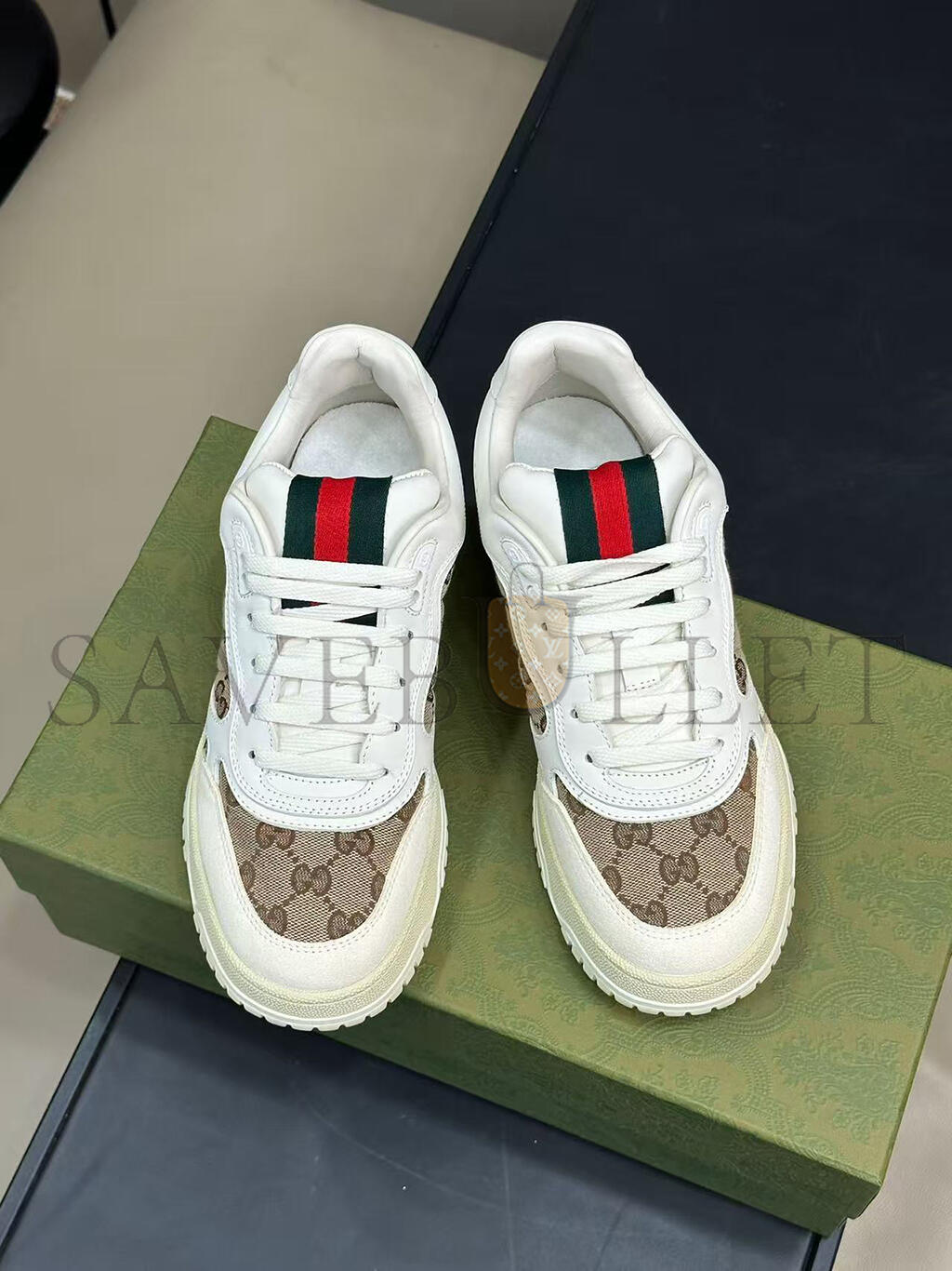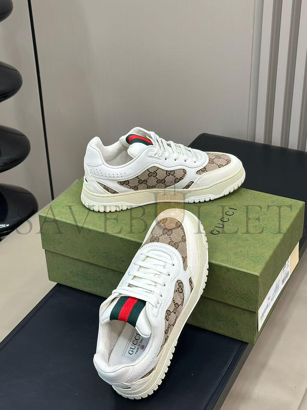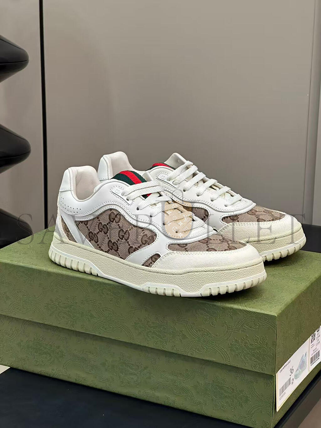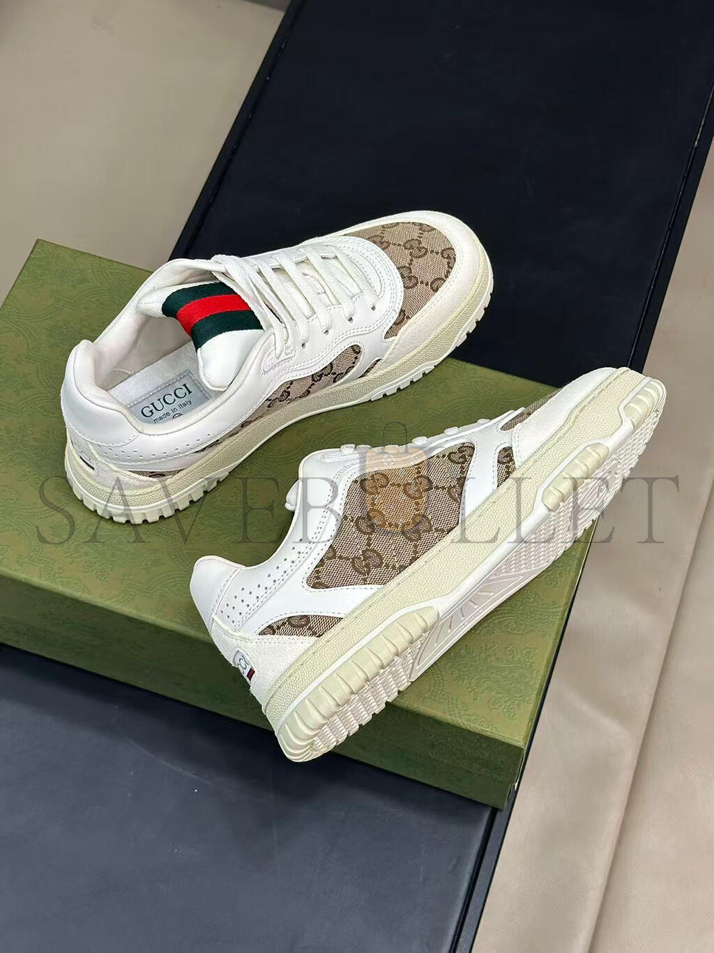 The Re-Web sees Guccis heritage stripes as a bold statement detail on a contemporary silhouette. This pair is crafted from the iconic Original GG canvas and white leather. Defined by multiple iconic details, this new sneaker takes center stage with the bold green and red Web tongue.