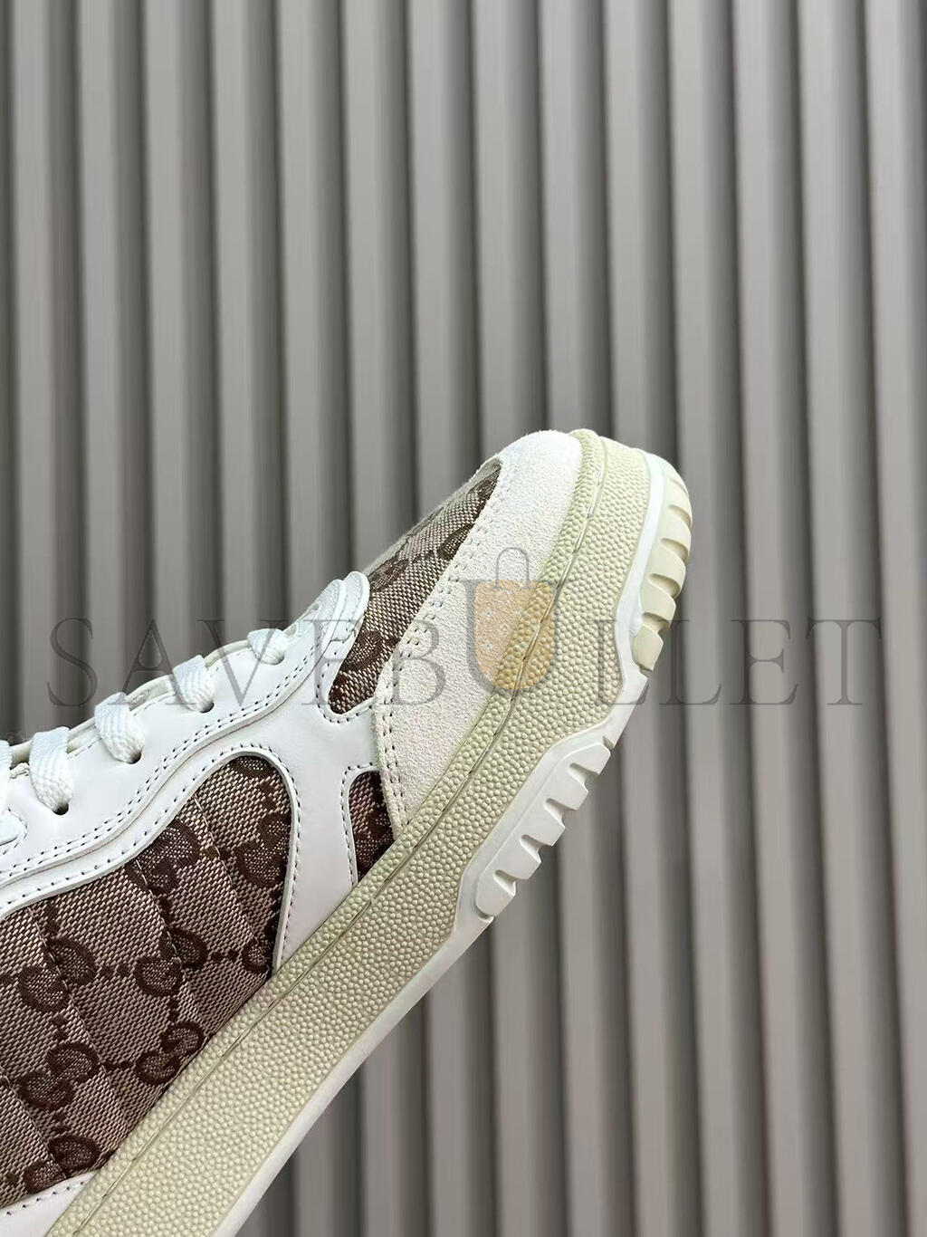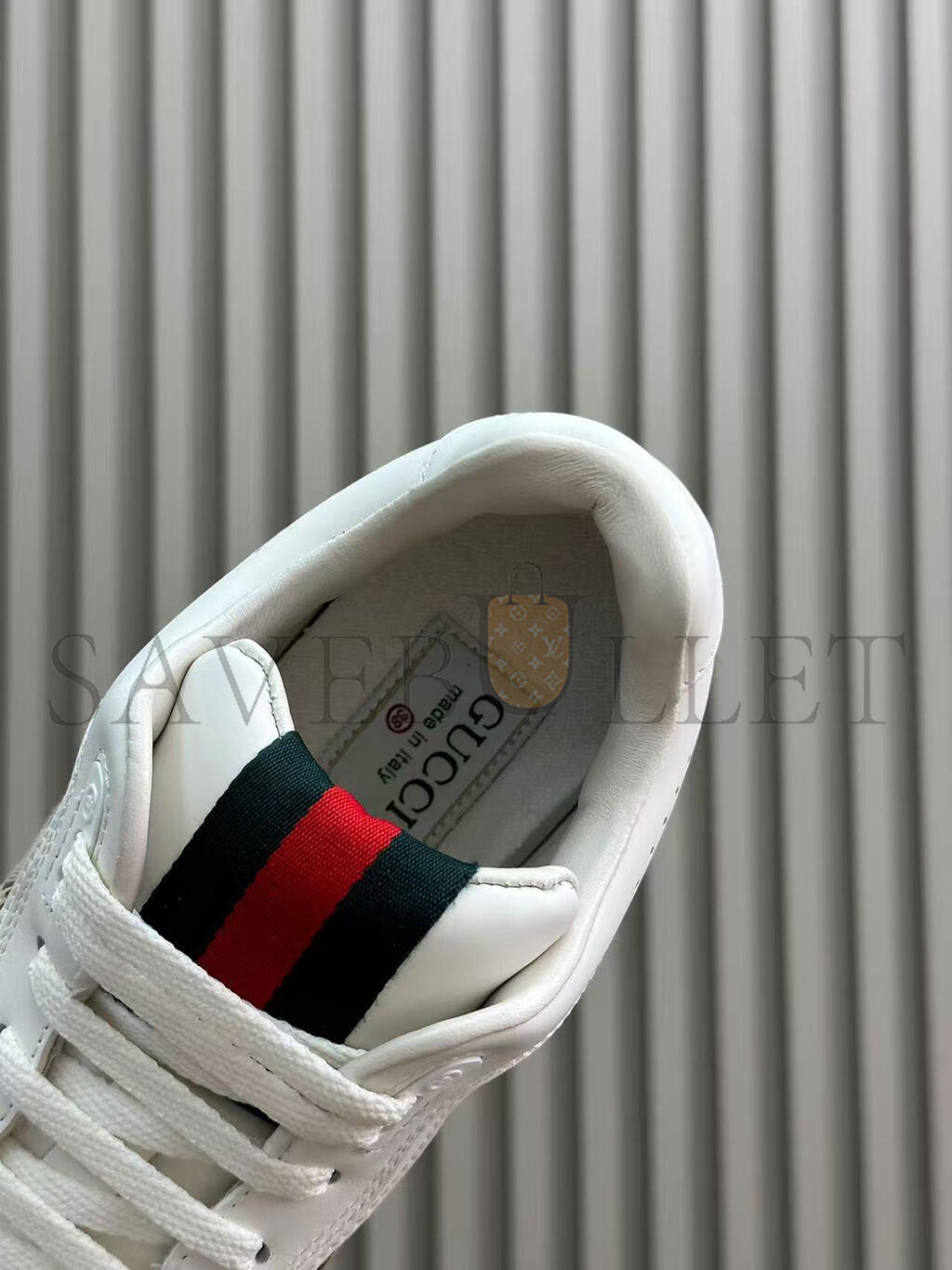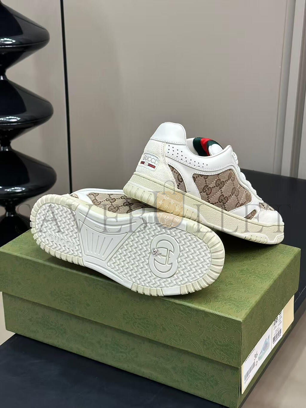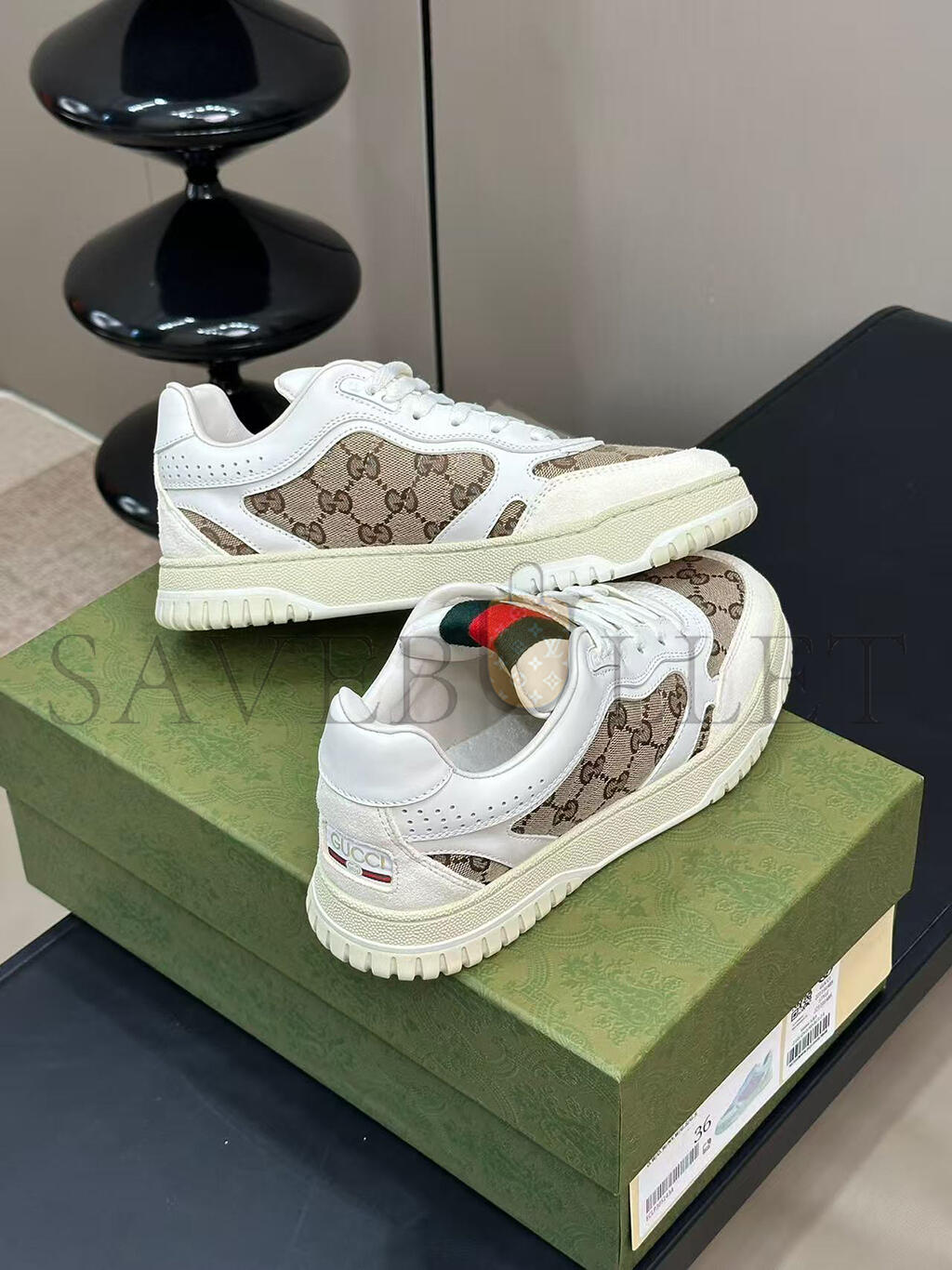 The Re-Web sees Guccis heritage stripes as a bold statement detail on a contemporary silhouette. This pair is crafted from the iconic Original GG canvas and white leather. Defined by multiple iconic details, this new sneaker takes center stage with the bold green and red Web tongue.