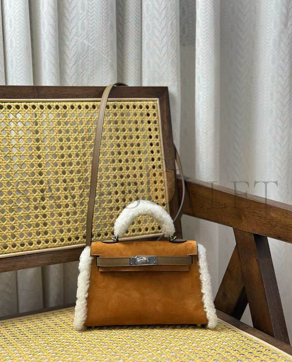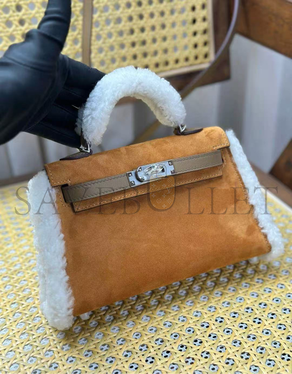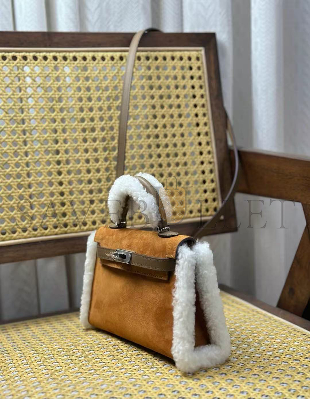 HERMES LIMITED EDITION ALEZAN SWIFT, CHAMOIS GRIZZLY AND ECRU SHEARLING TEDDY PLUSH MINI KELLY II 20 PALLADIUM HARDWARE H084115CKAC (19*12*6cm)