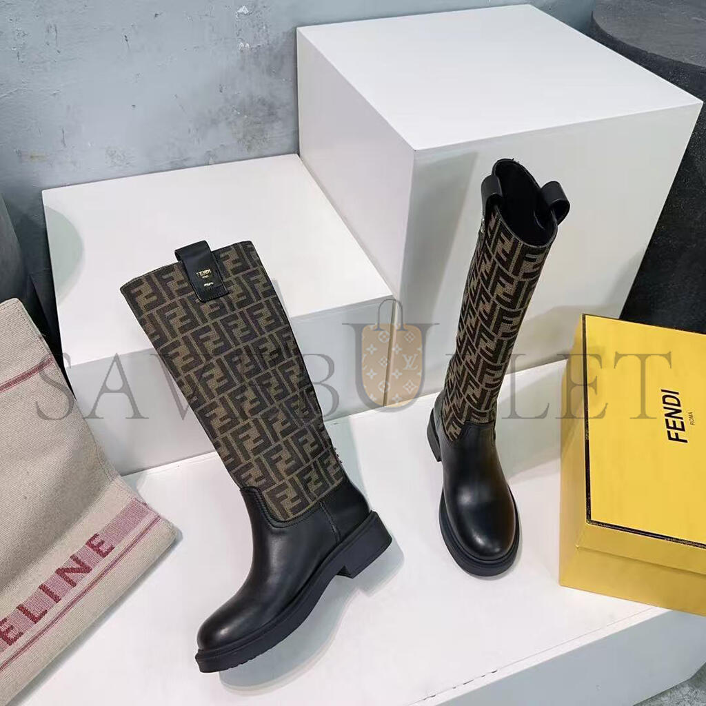 Tubular leg boots with round toe. Made of black leather. Leg made of jacquard fabric with an iconic brown FF motif. Embellished with metal Selleria stitching and metal embossed Fendi Roma lettering. Rubber sole and heel with Fendi lettering on the side. Gold-finish metalware.
