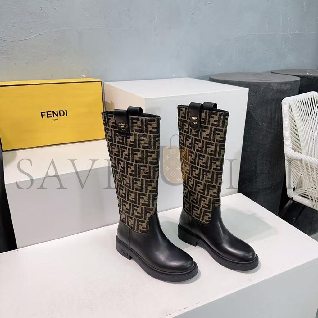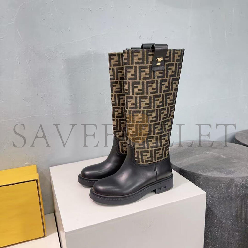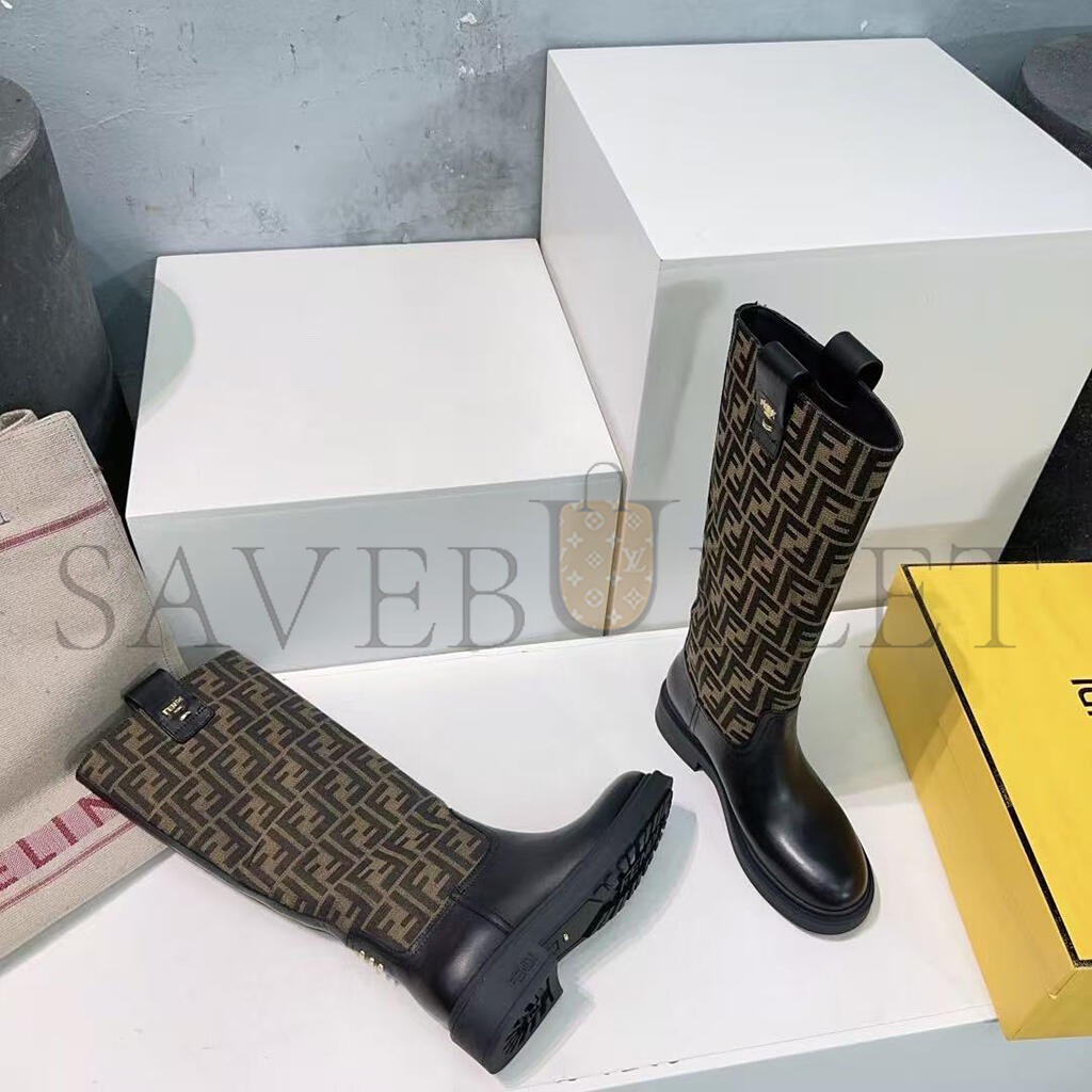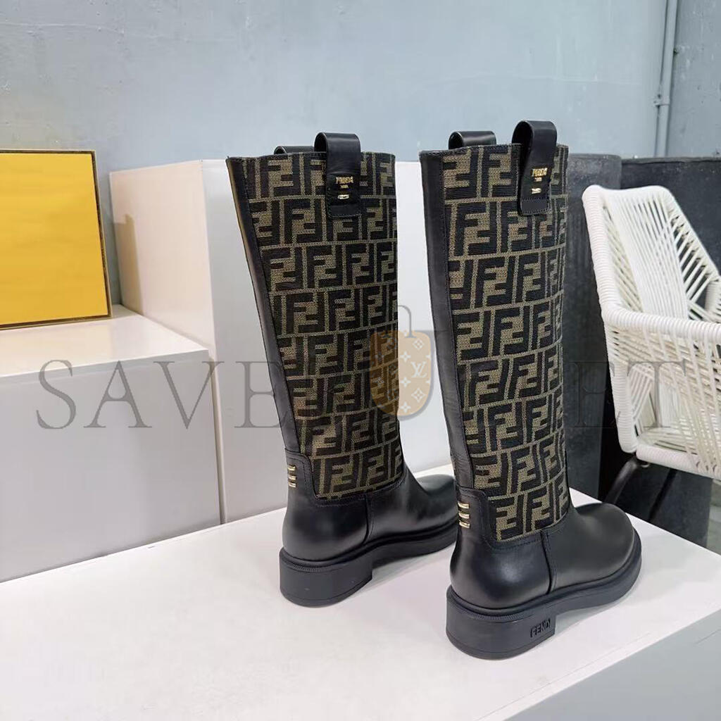 FENDI FILO BLACK LEATHER AND BROWN FF FABRIC BOOTS 8W8574AHGYF0PMM