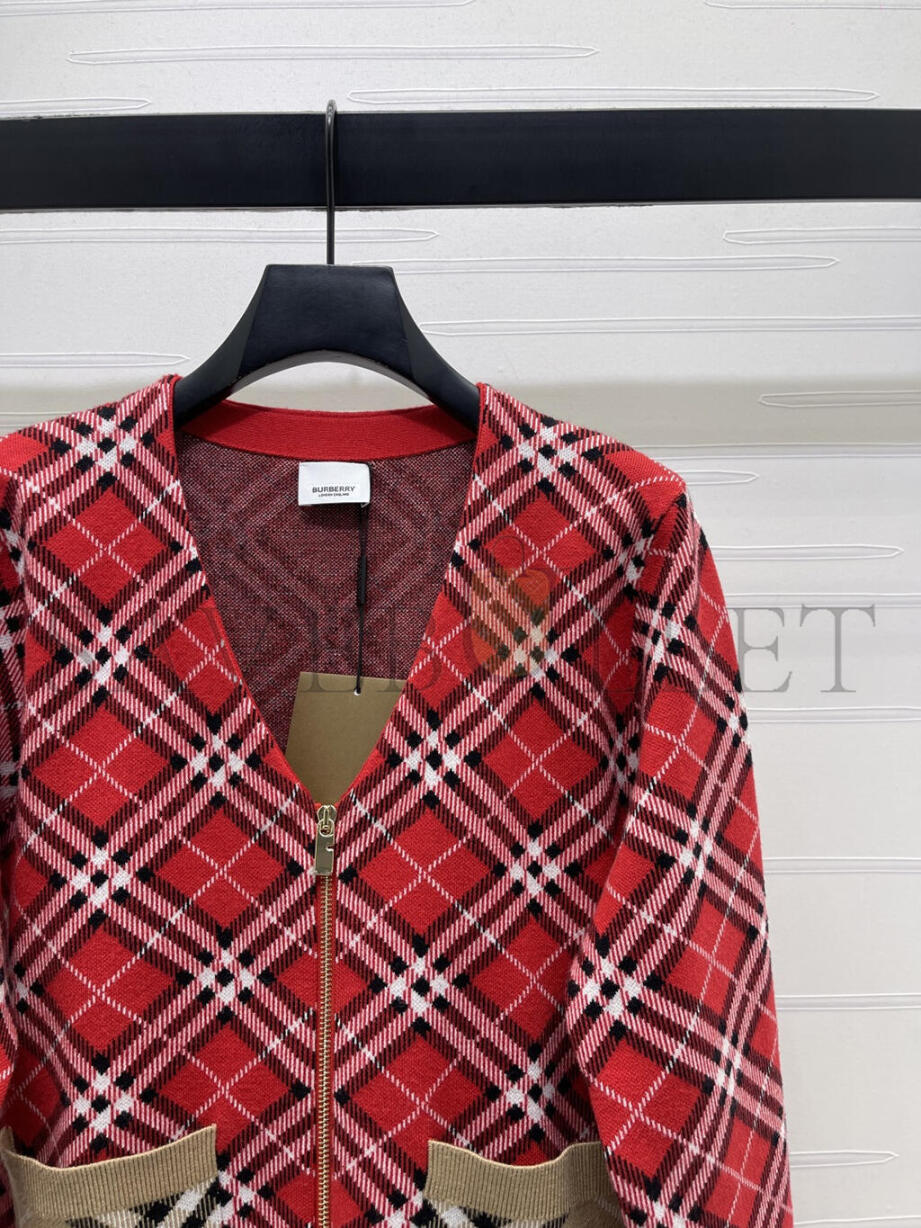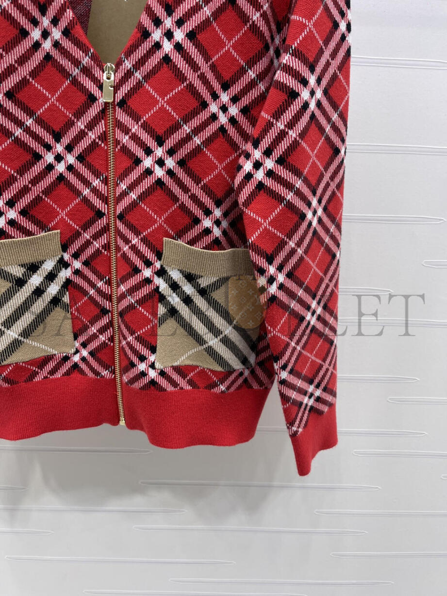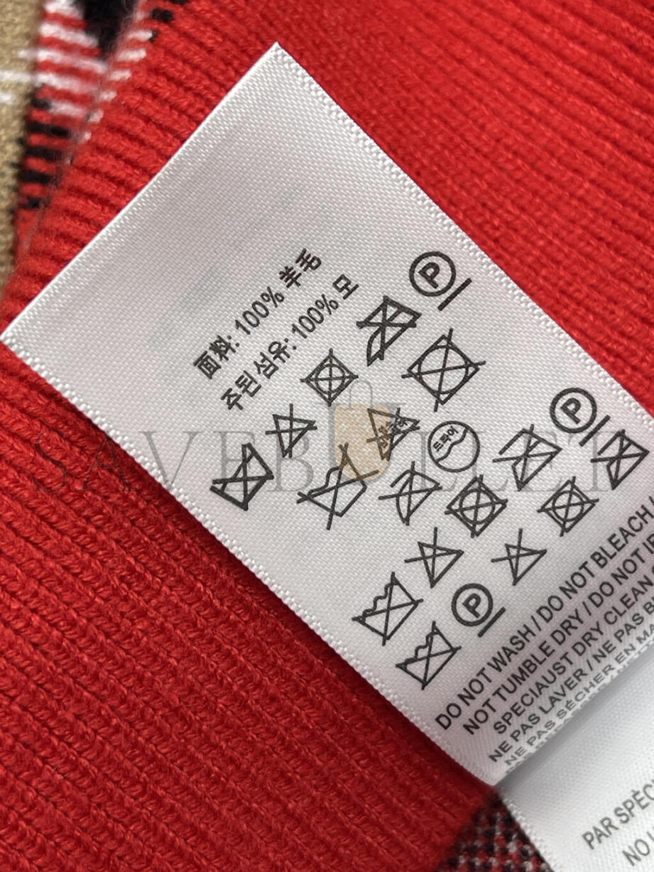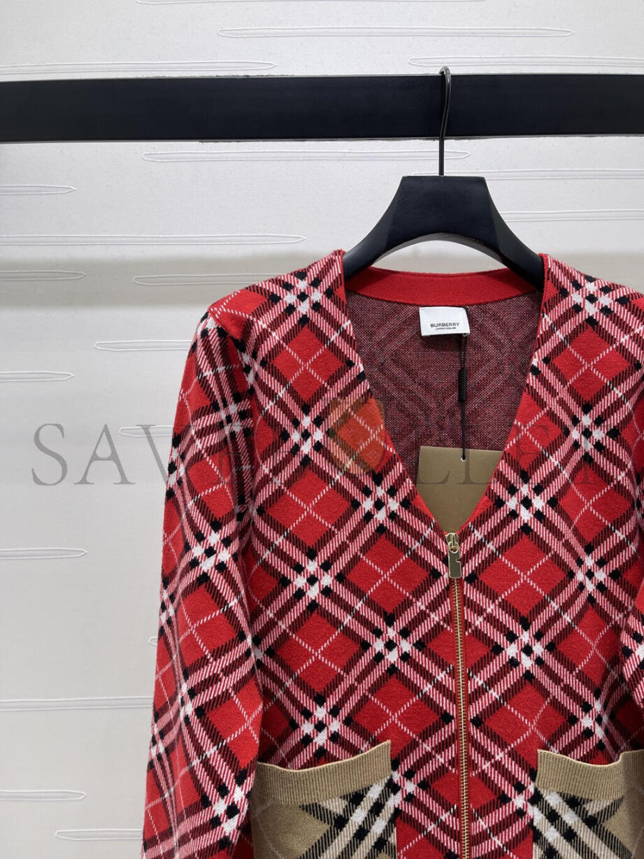 Cardigan in cozy wool, knitted in the Burberry Check pattern in our seasonal Crayon Red. V-neck style. Contrasting pockets in our signature Sand Beige hue and B-shaped zip pulls complete the design