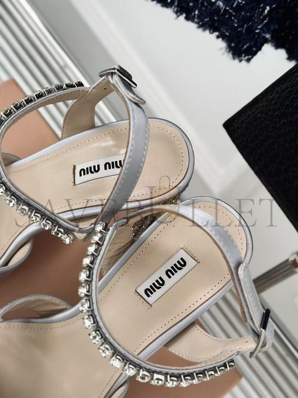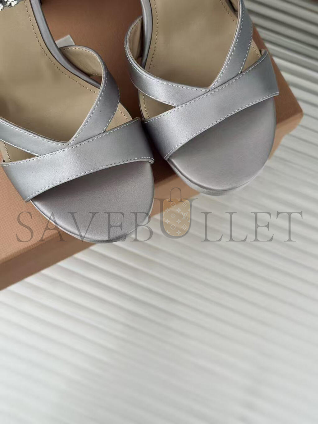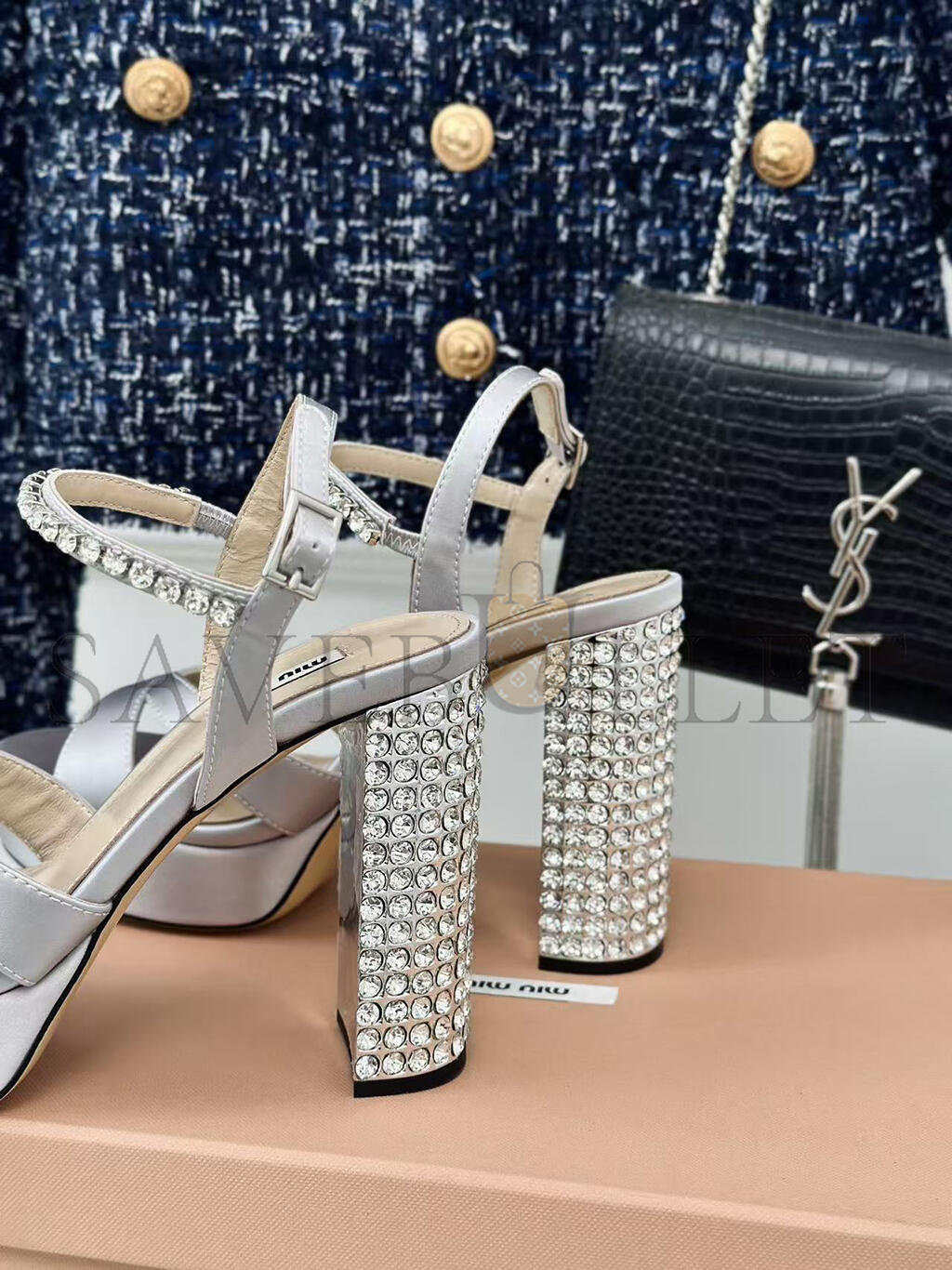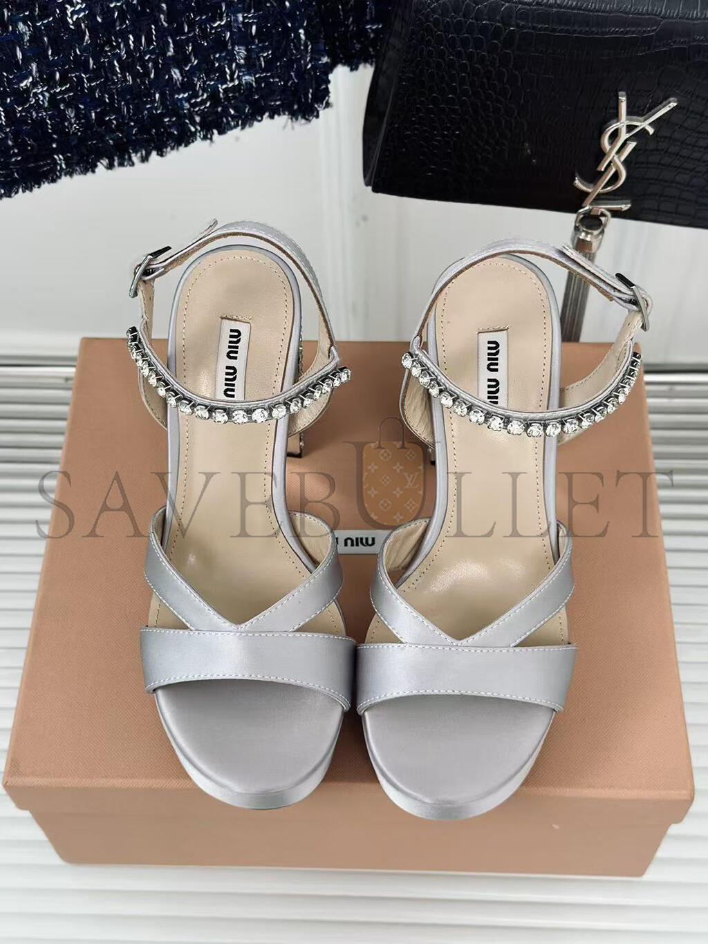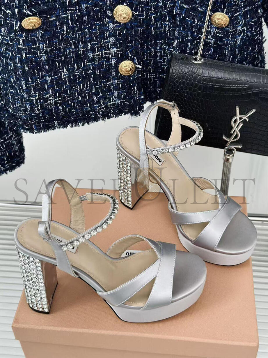 MIU MIU SILVER LEATHER CRYSTAL EMBELLISHED ANKLE STRAP PLATFORM SANDALS