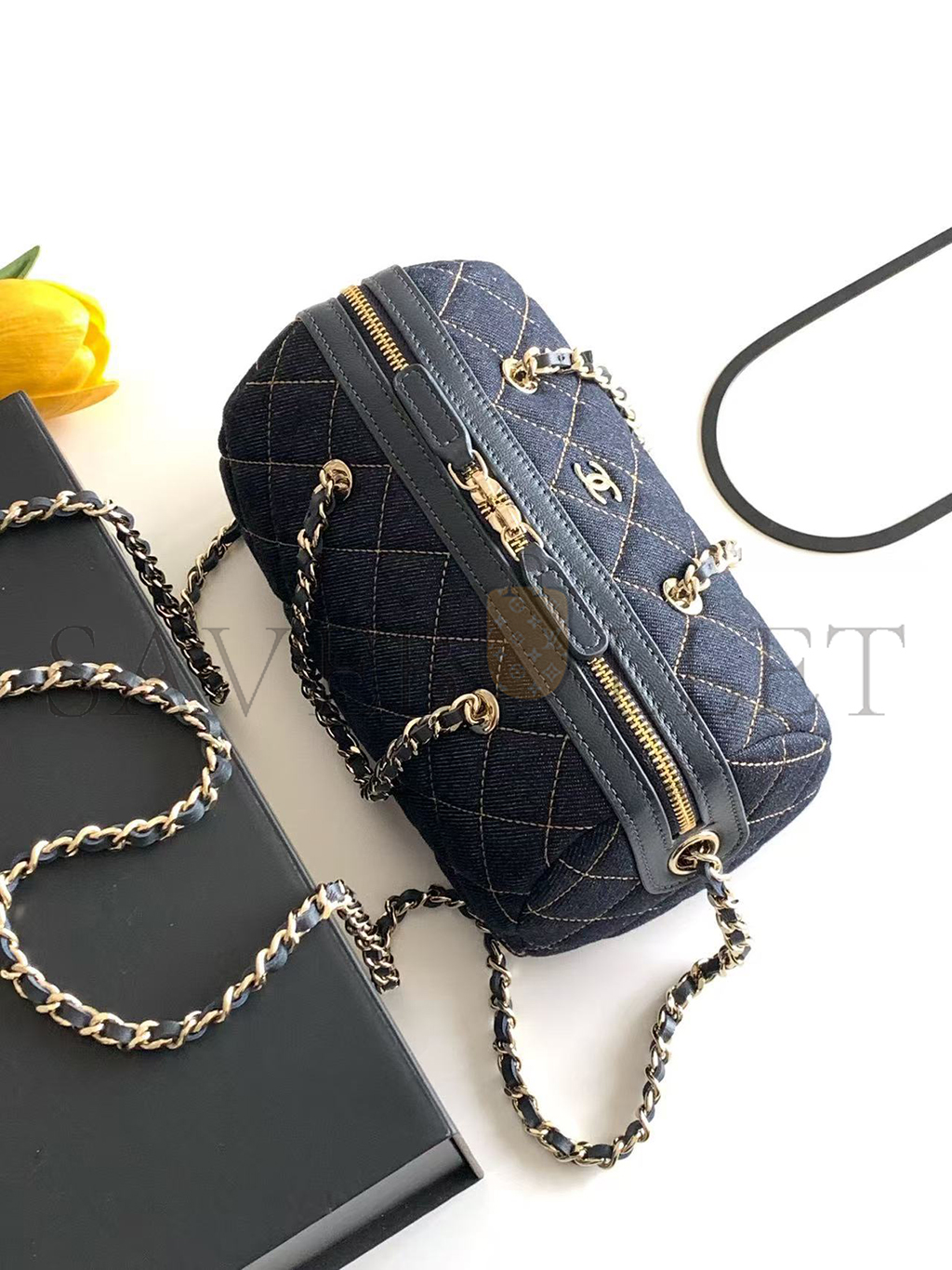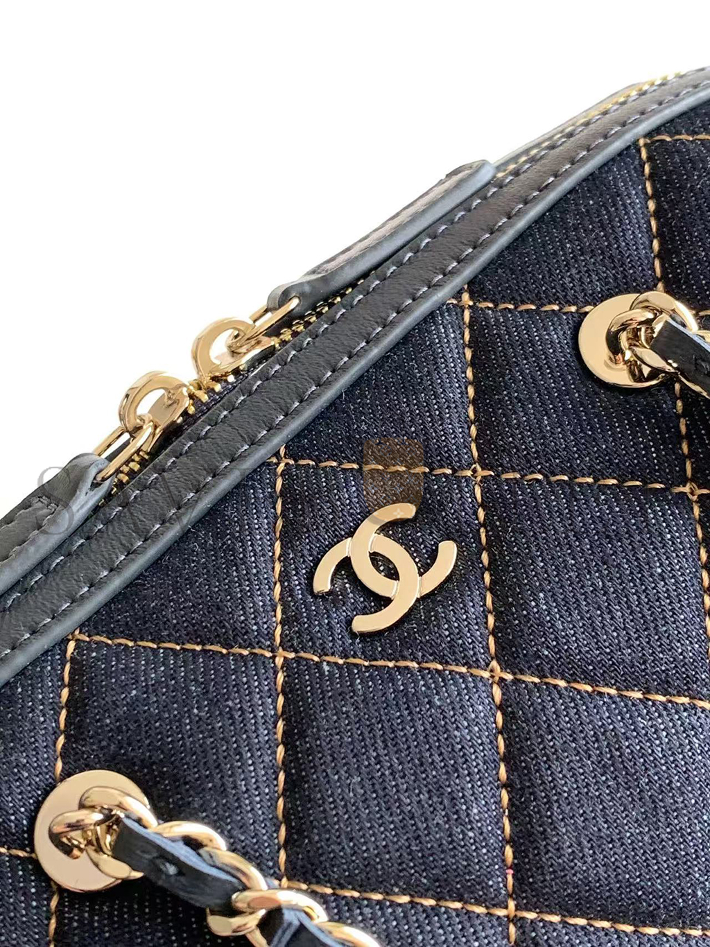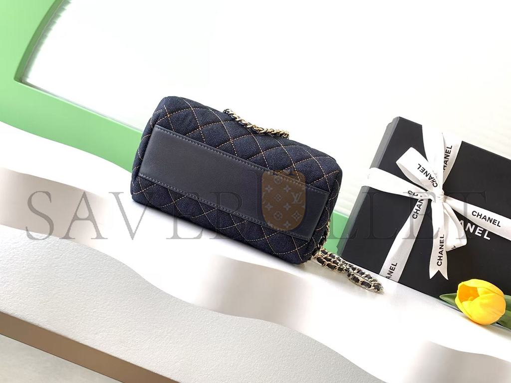 CHANEL MINI TIMELESS CLASSIC BARREL BAG WITH CHAIN DARK BLUE DENIM LIGHT GOLD HARDWARE AP4474 (19*13*10cm)
