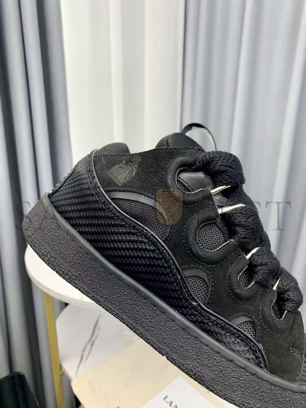 Quilted tongue with a Lanvin label and an embossed Mother and Child Daughter logo