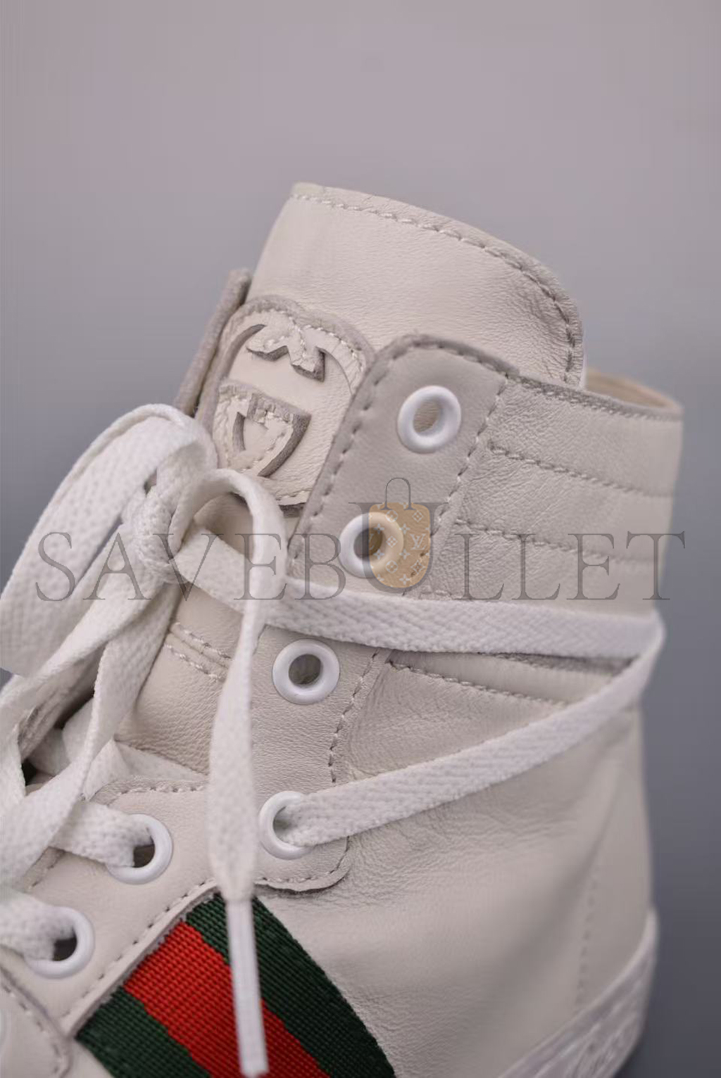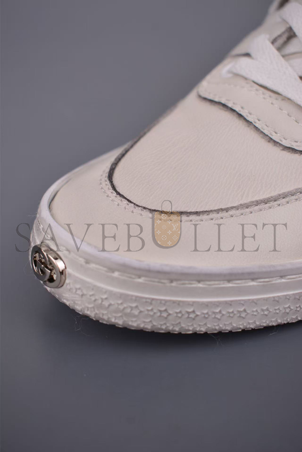Interlocking G metal detail on the tip of the toe, and leather patch on the tongue