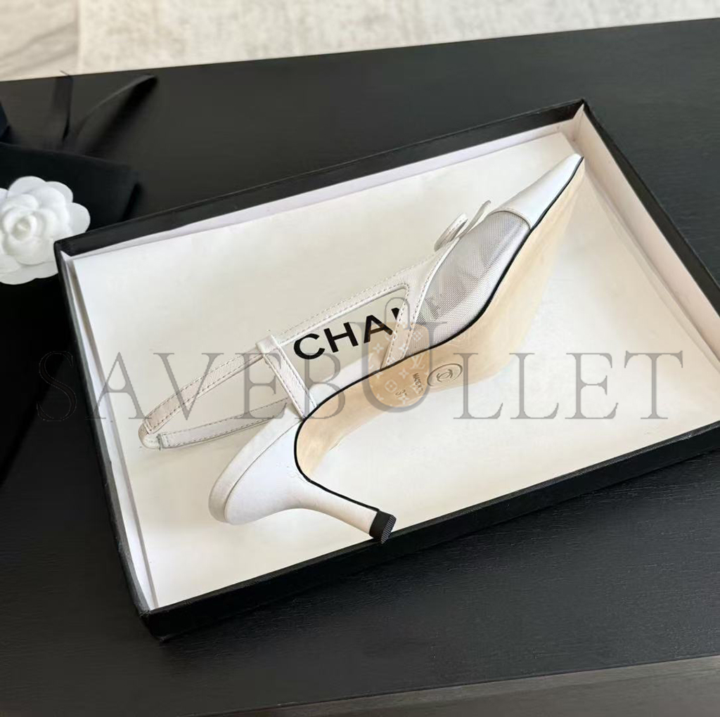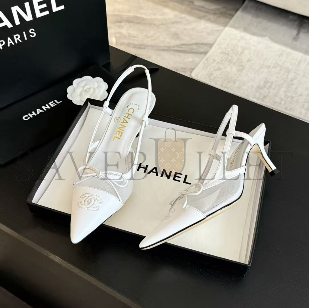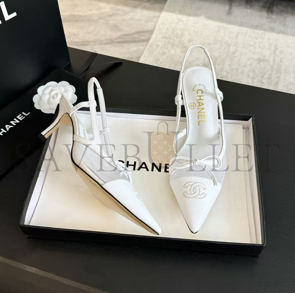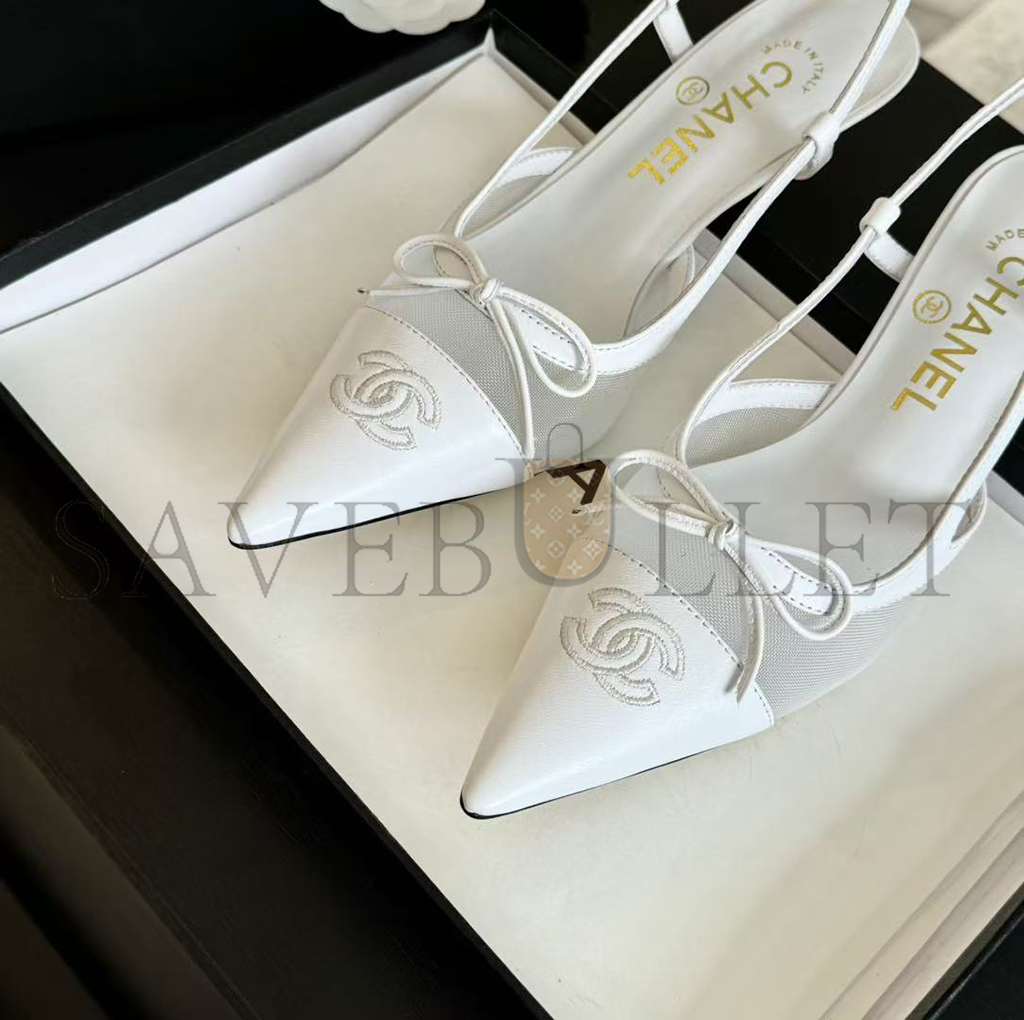 CHANEL WHITE MESH BOW SLINGBACK HEELS