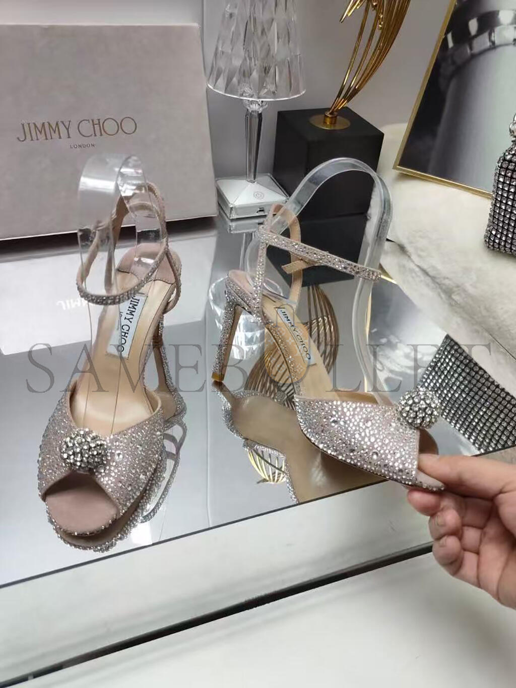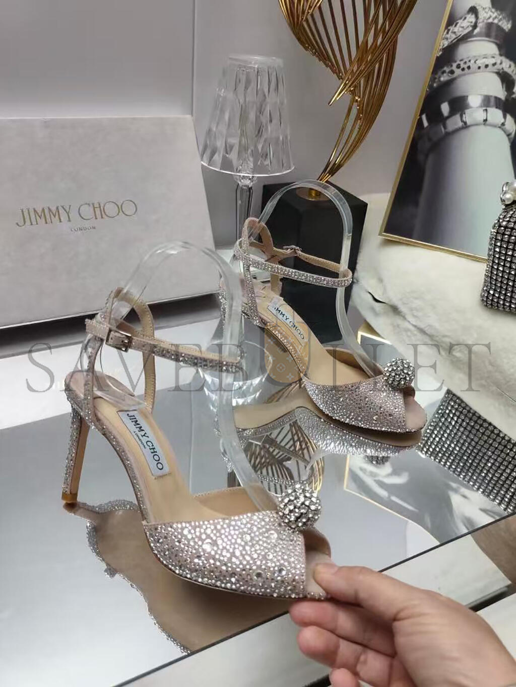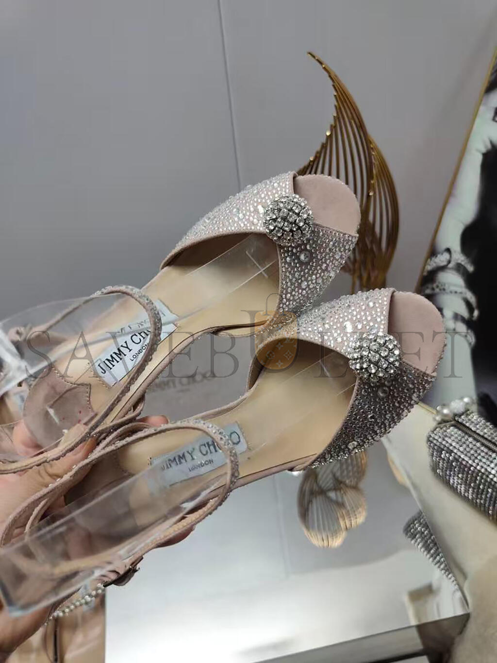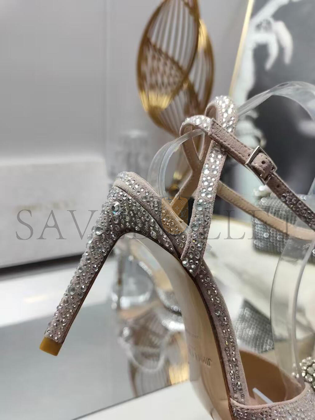 JIMMY CHOO NUDE SUEDE SANDALS WITH HOTFIX CRYSTALS AND SPHERE DETAIL SACORA100PHZ