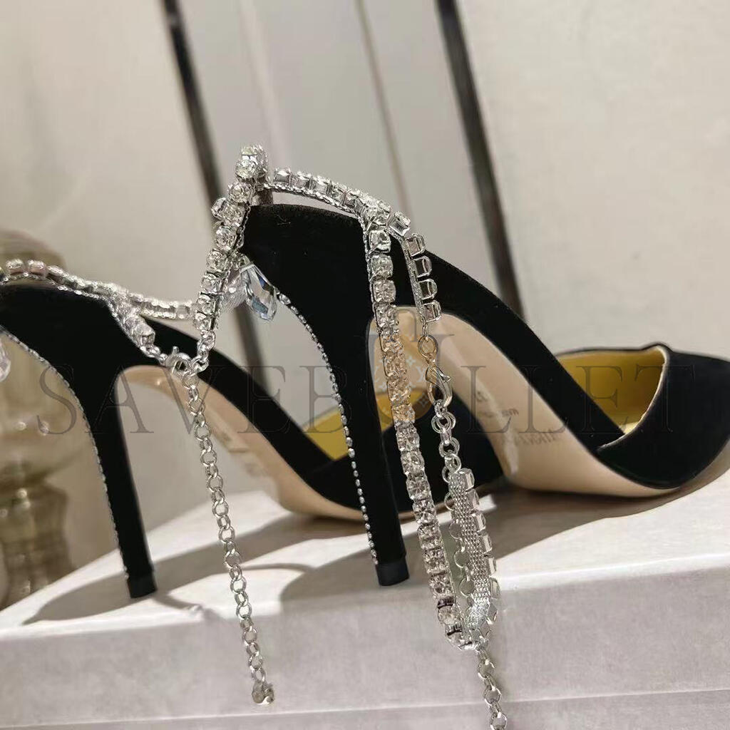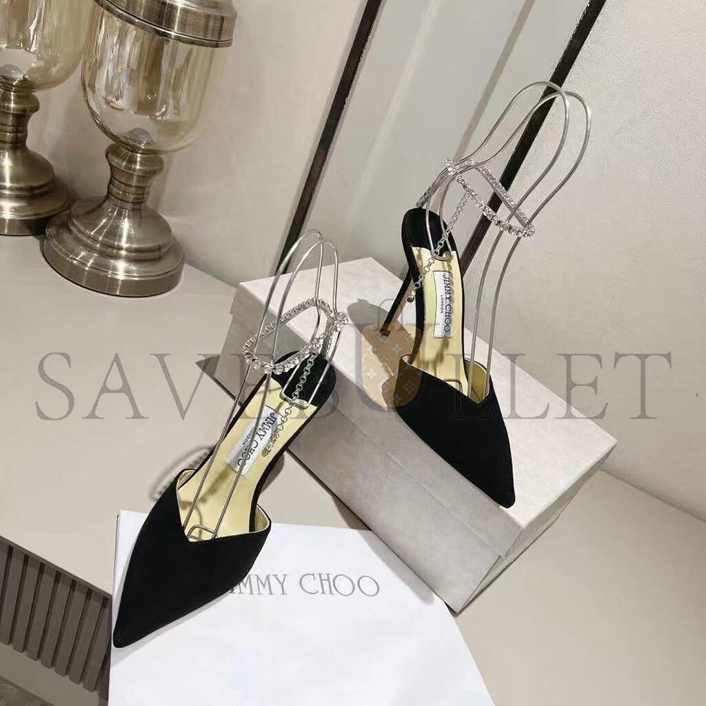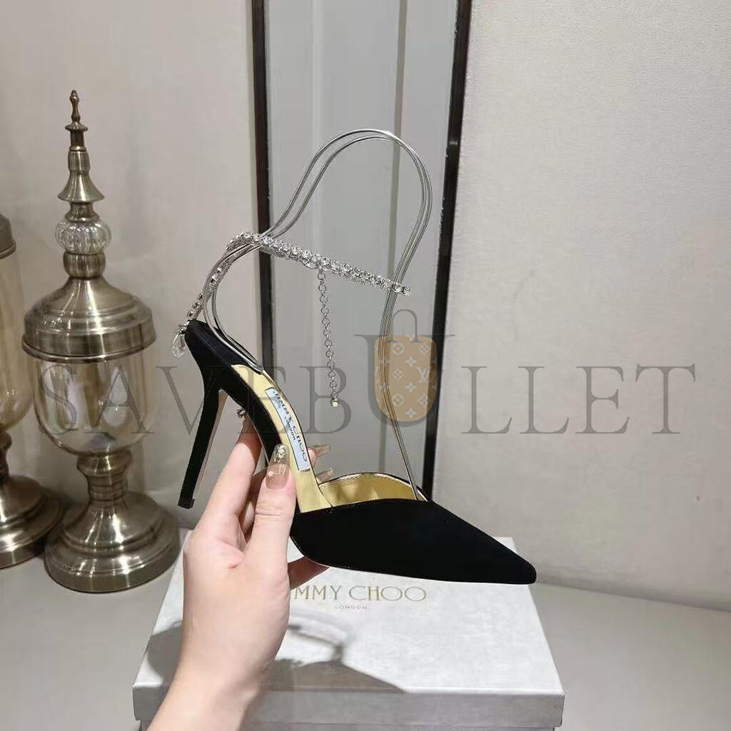 JIMMY CHOO SAEDA 100 BLACK SUEDE PUMPS WITH CRYSTAL EMBELLISHMENT SAEDA100EWA