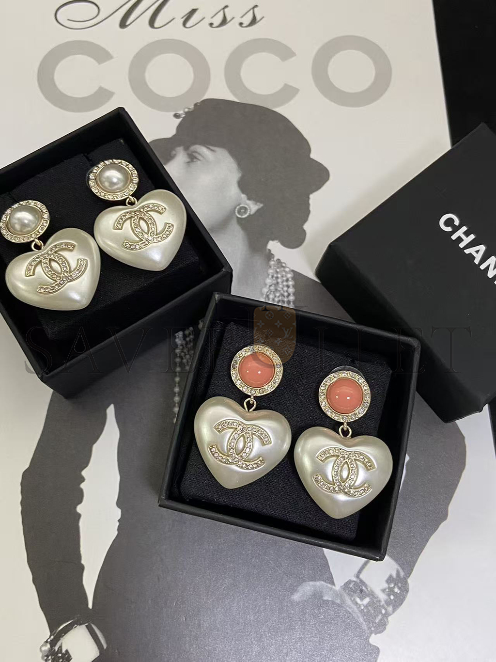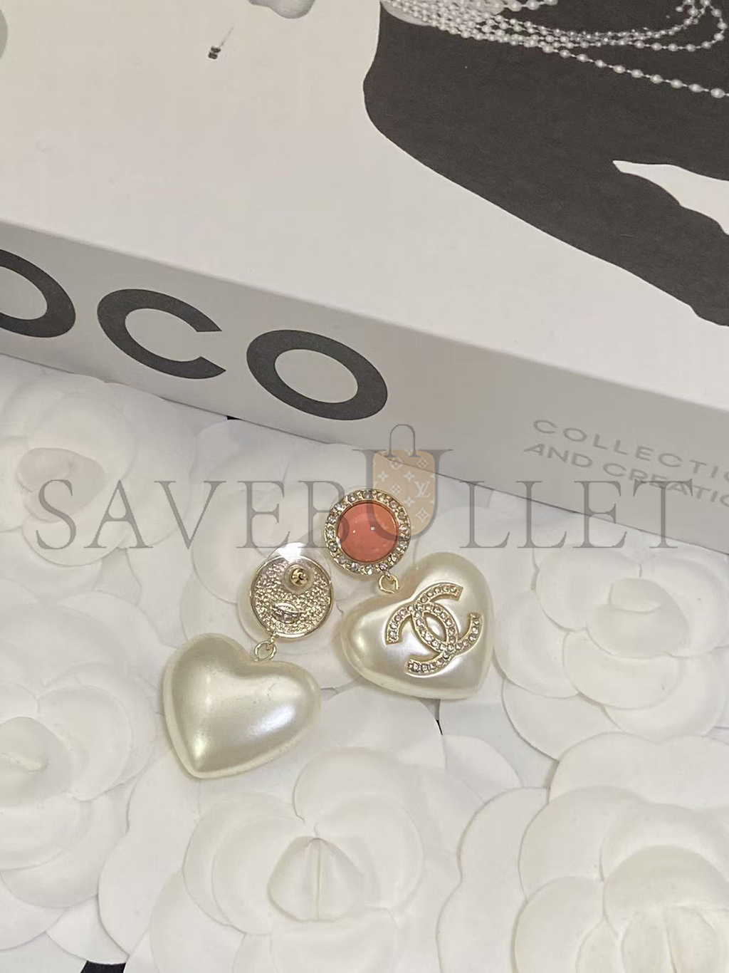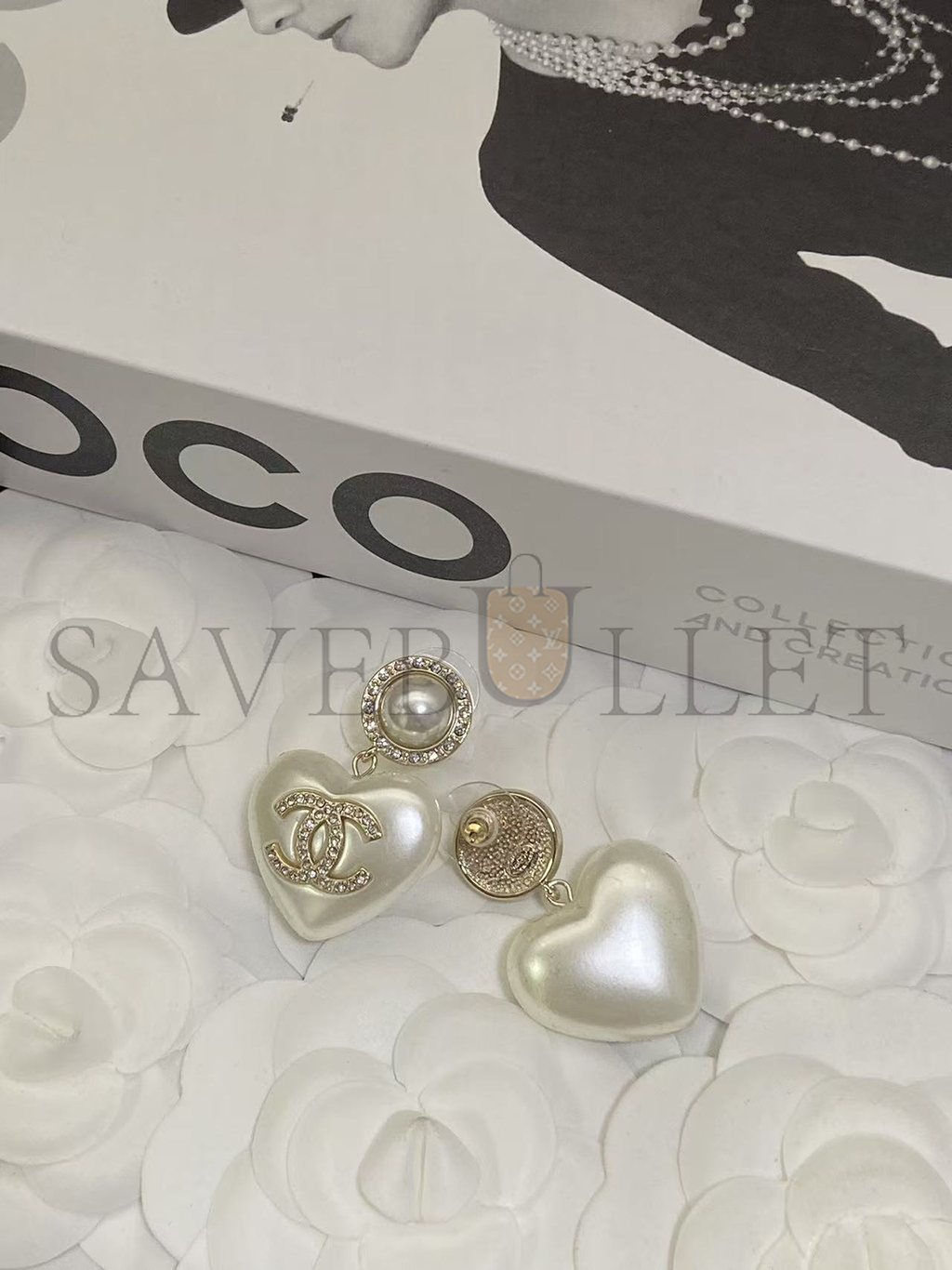 CHANEL GOLD PLATED FAUX PEARL STRASS CC HEART DROP EARRINGS