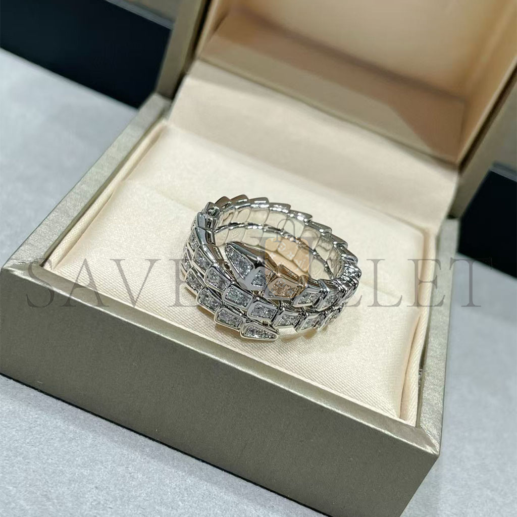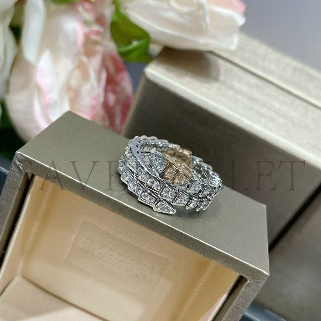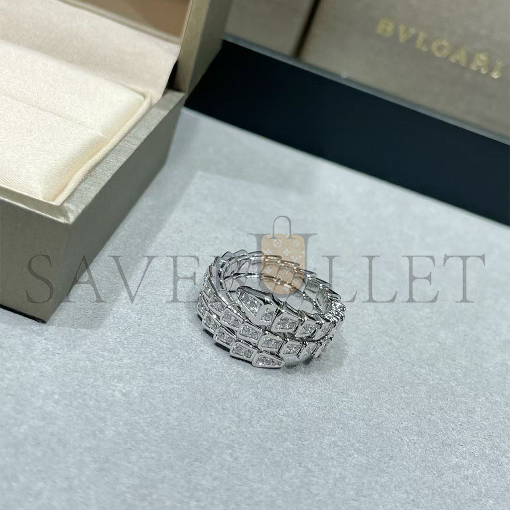 With its signature blend of pure aesthetics, enveloping shapes and charismatic flair, the Serpenti Viper 18 kt white gold ring with full pavé diamonds is an essential interpretation of Bvlgari’s icon of endless metamorphosis.