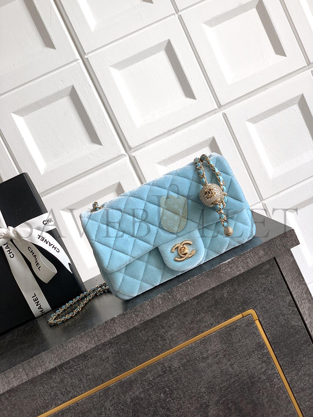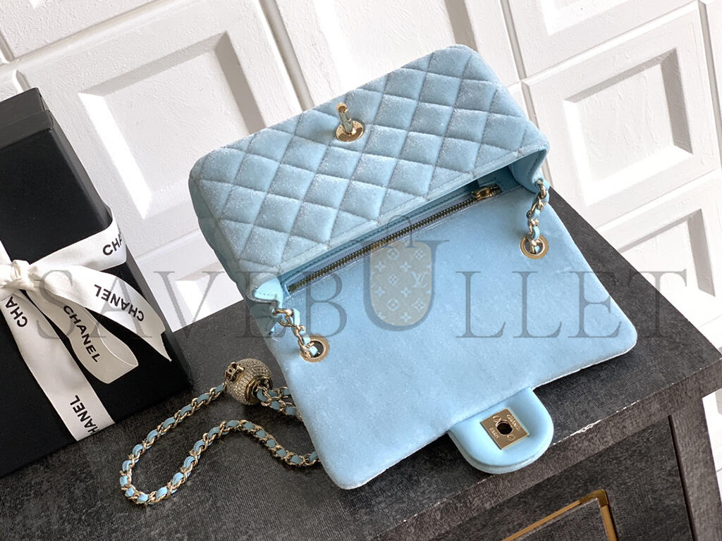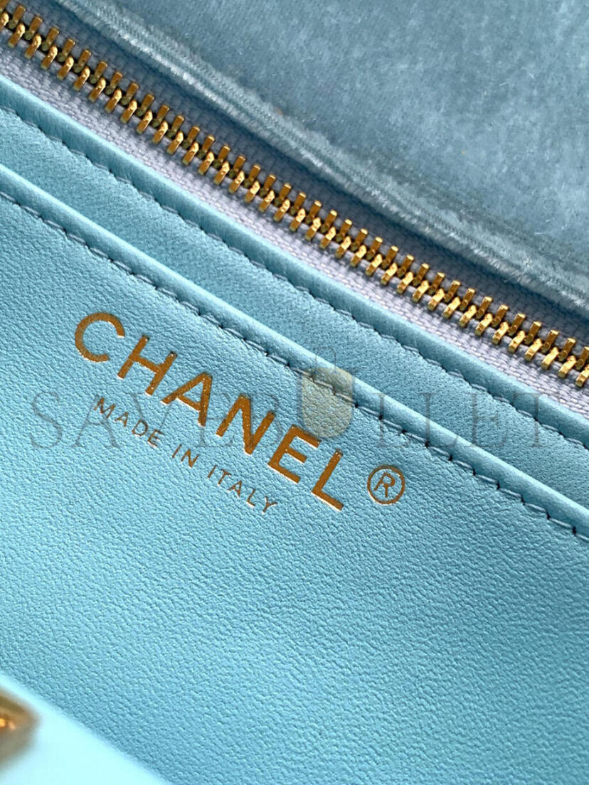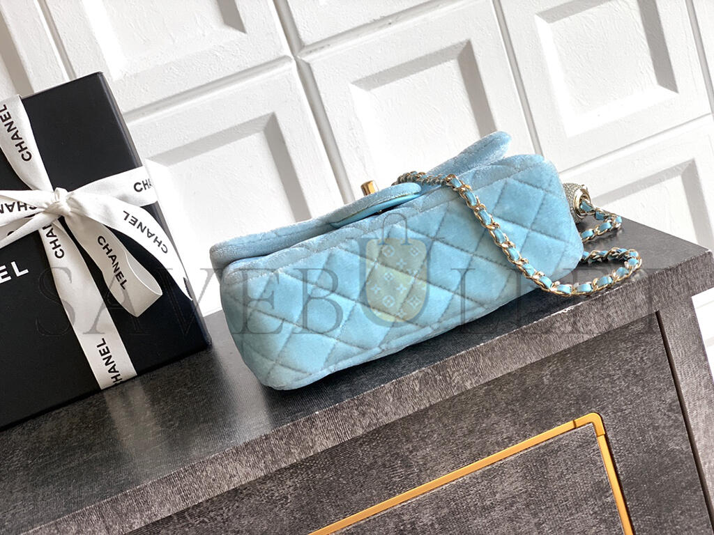 CHANEL MINI FLAP BAG VELVET, DIAMANT  & GOLD-TONE METAL BLUE AS1787 (20*13*7cm)