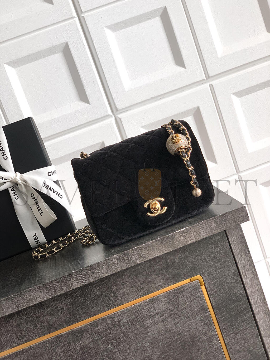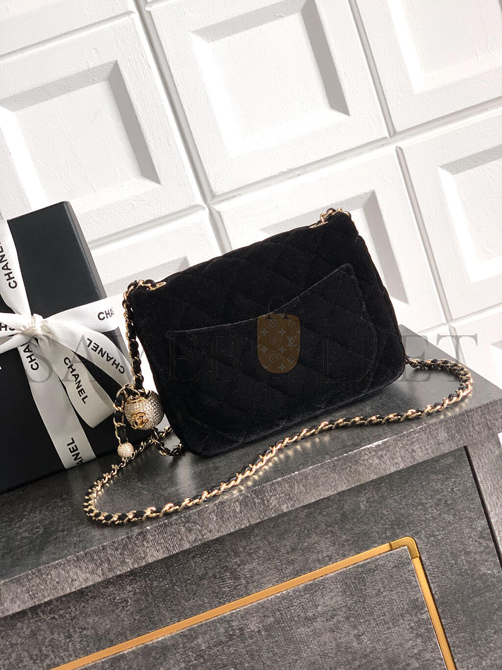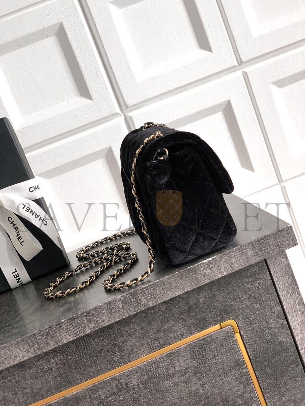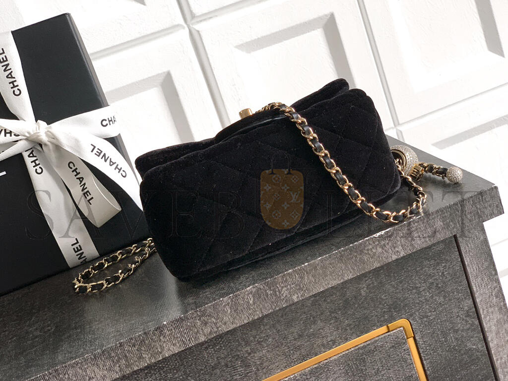 CHANEL MINI FLAP BAG VELVET, DIAMANT & GOLD-TONE METAL BLACK AS1786 (18*13*7cm)