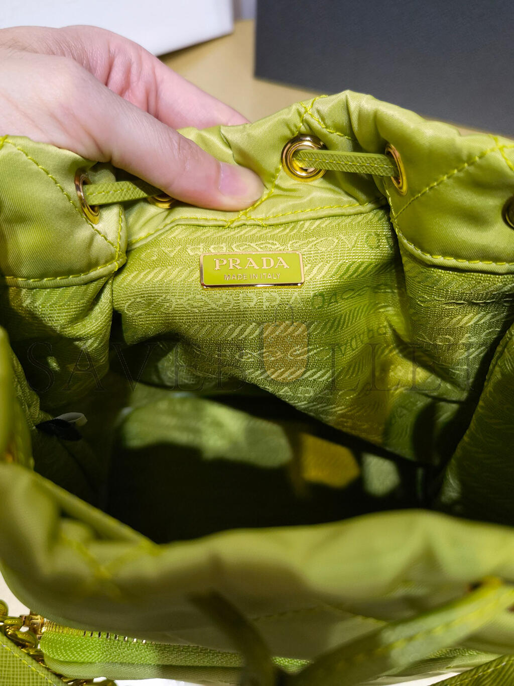 With two compartmentsLeather handleAdjustable woven nylon harnessEnameled metal triangle logo on the frontZipper closureTwo external zipper pocketsPad..