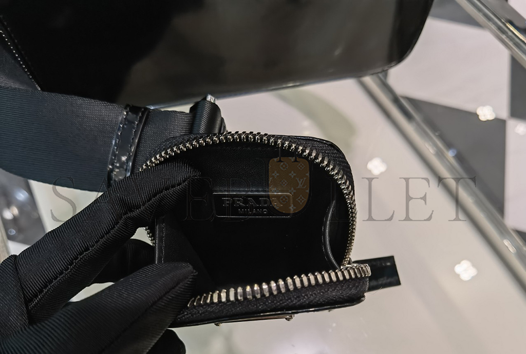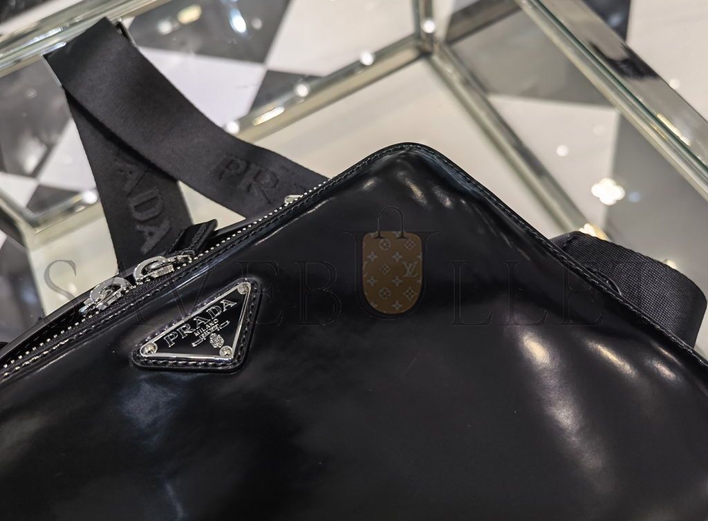 With two compartmentsLeather handleAdjustable woven nylon harnessEnameled metal triangle logo on the frontZipper closureTwo external zipper pocketsPad..