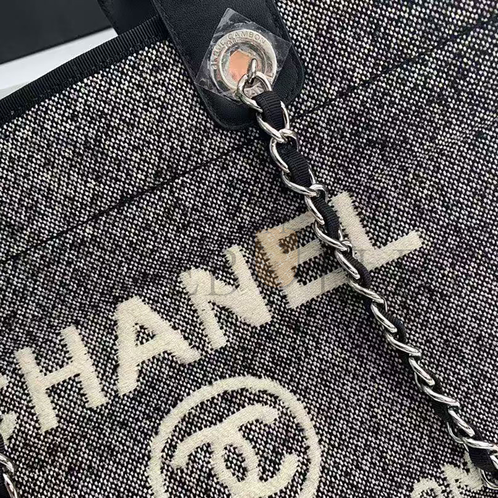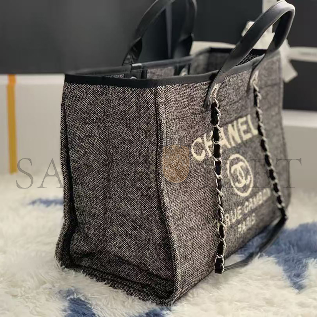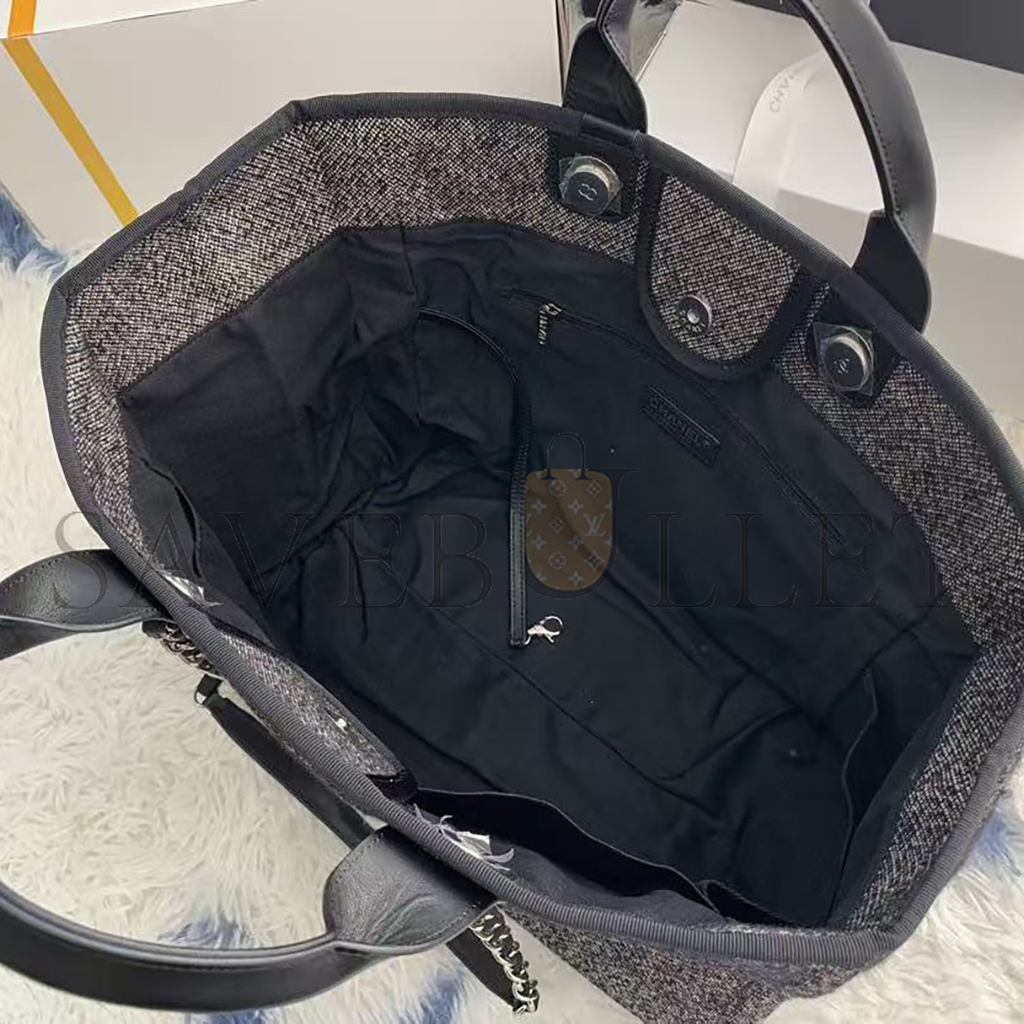 CHANEL SMALL DEAUVILLE SHOPPING BAG BLACK WOOL SILVER HARDWARE (35*27*16cm)