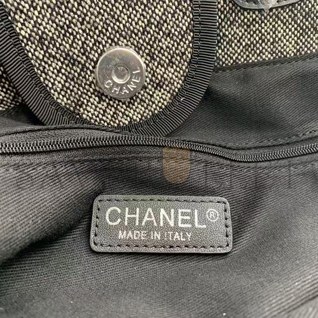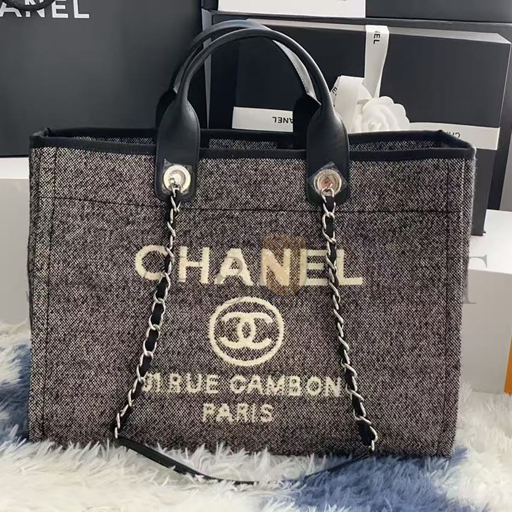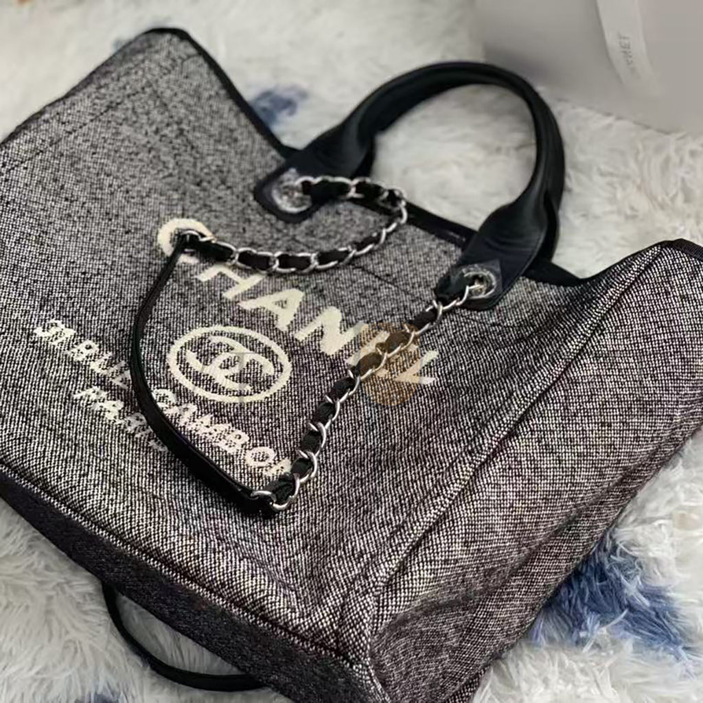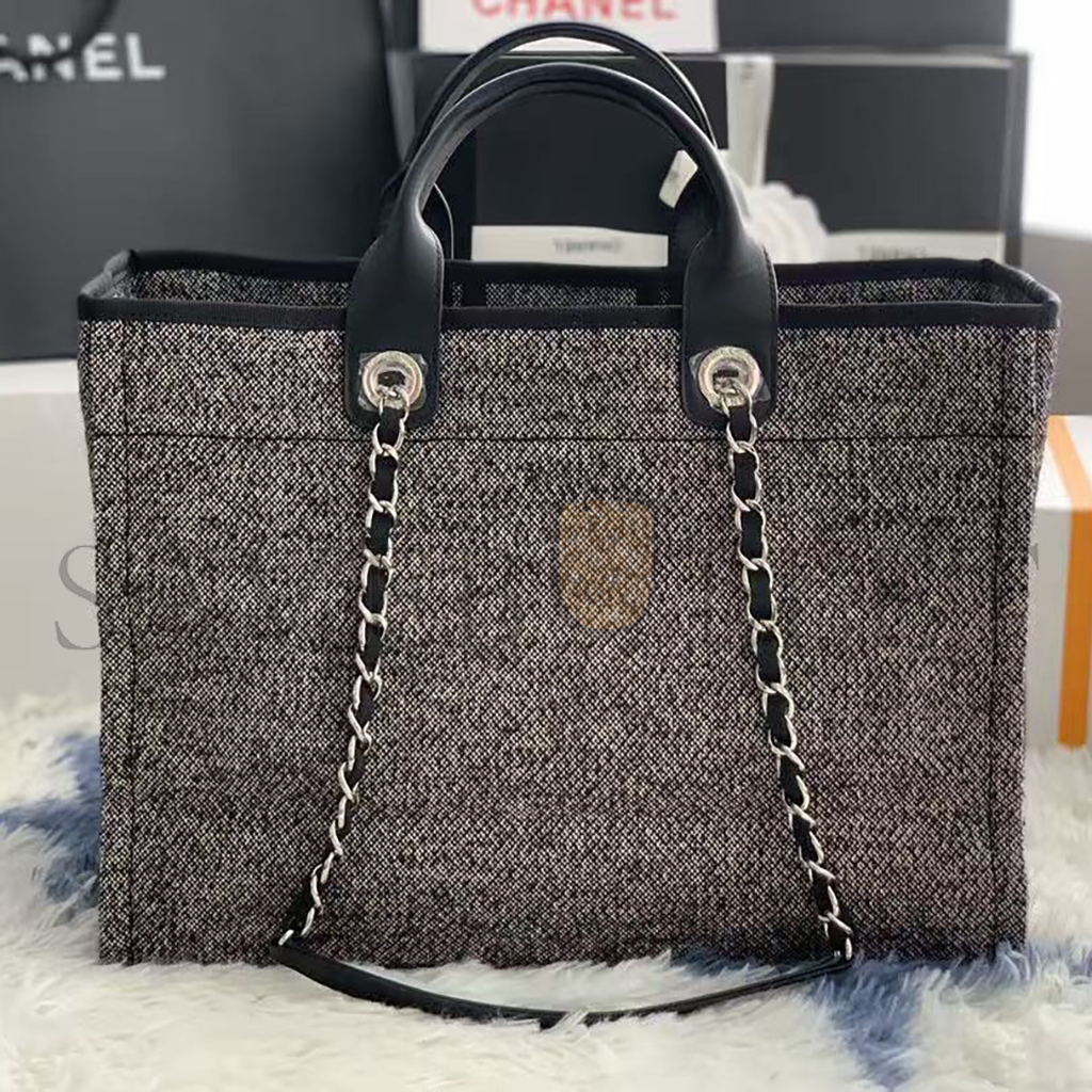 CHANEL SMALL DEAUVILLE SHOPPING BAG BLACK WOOL SILVER HARDWARE (35*27*16cm)