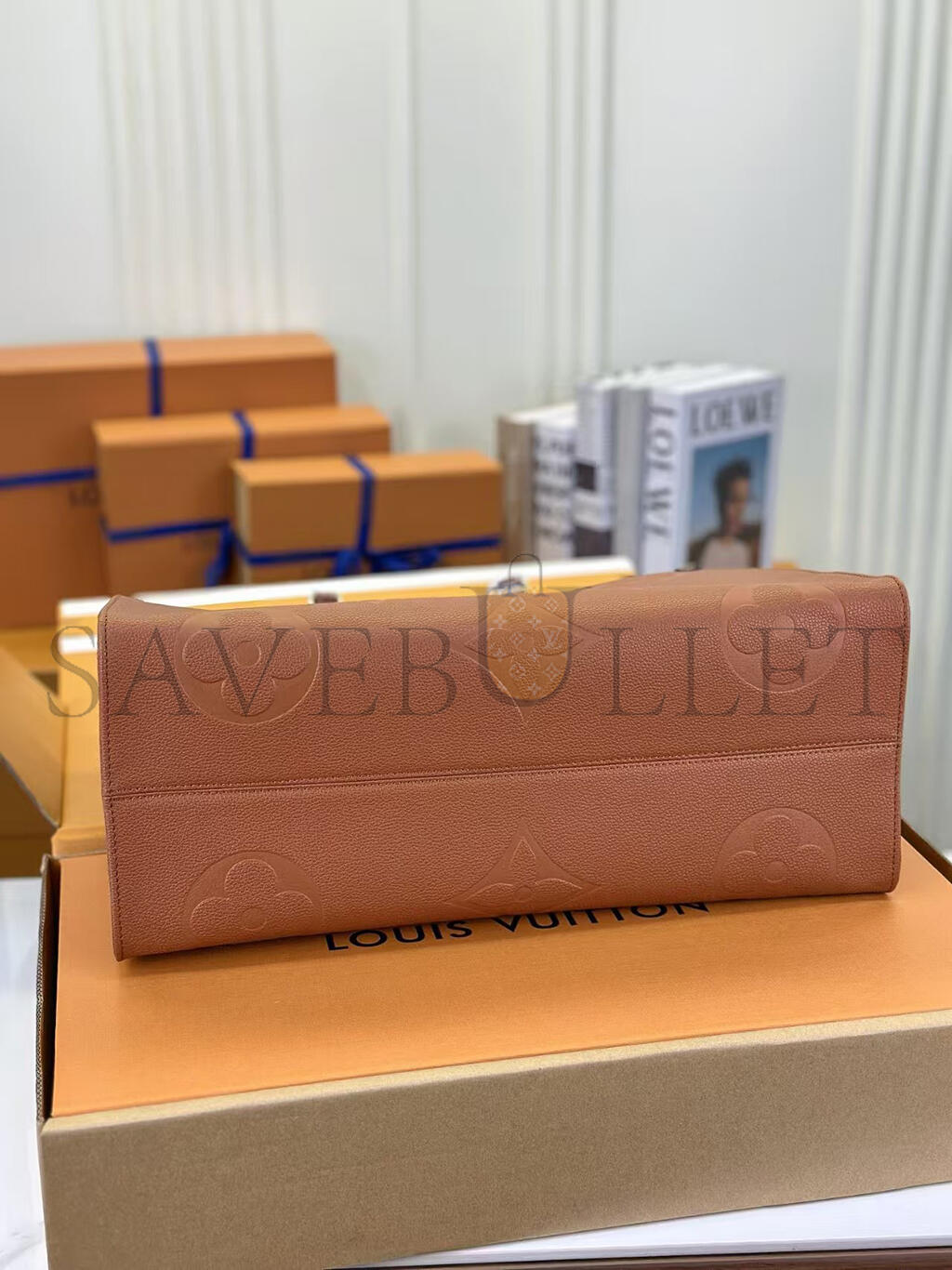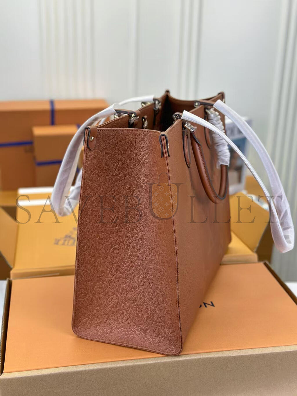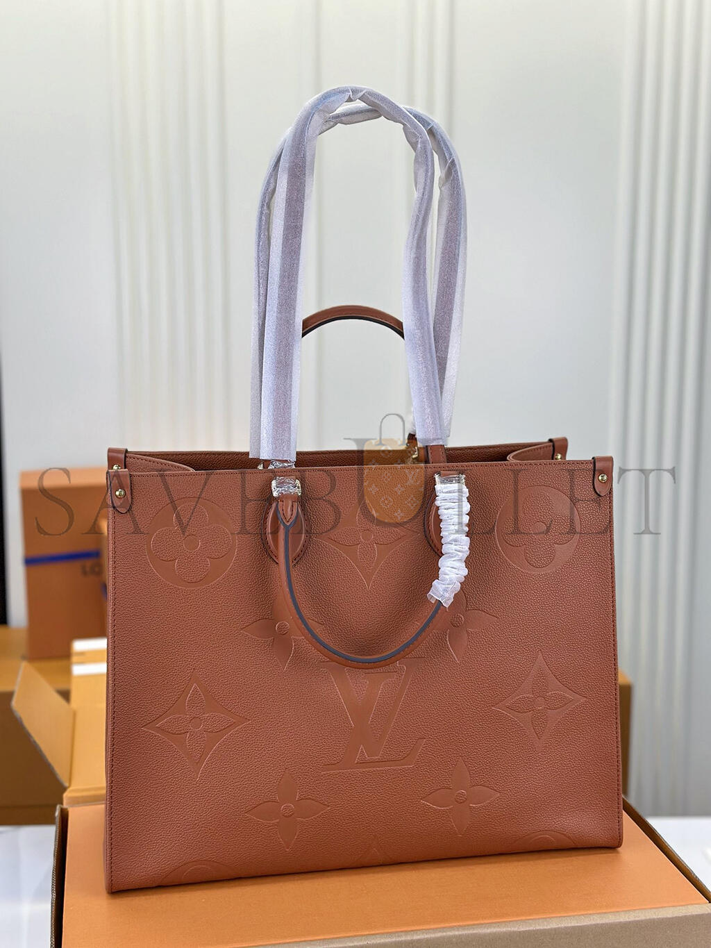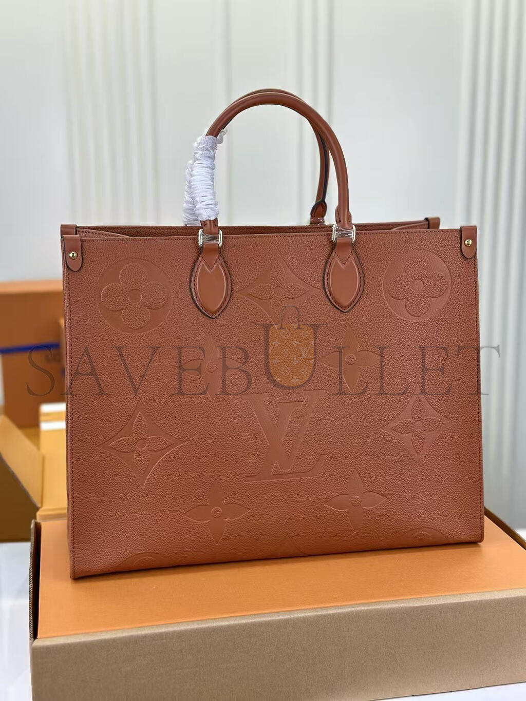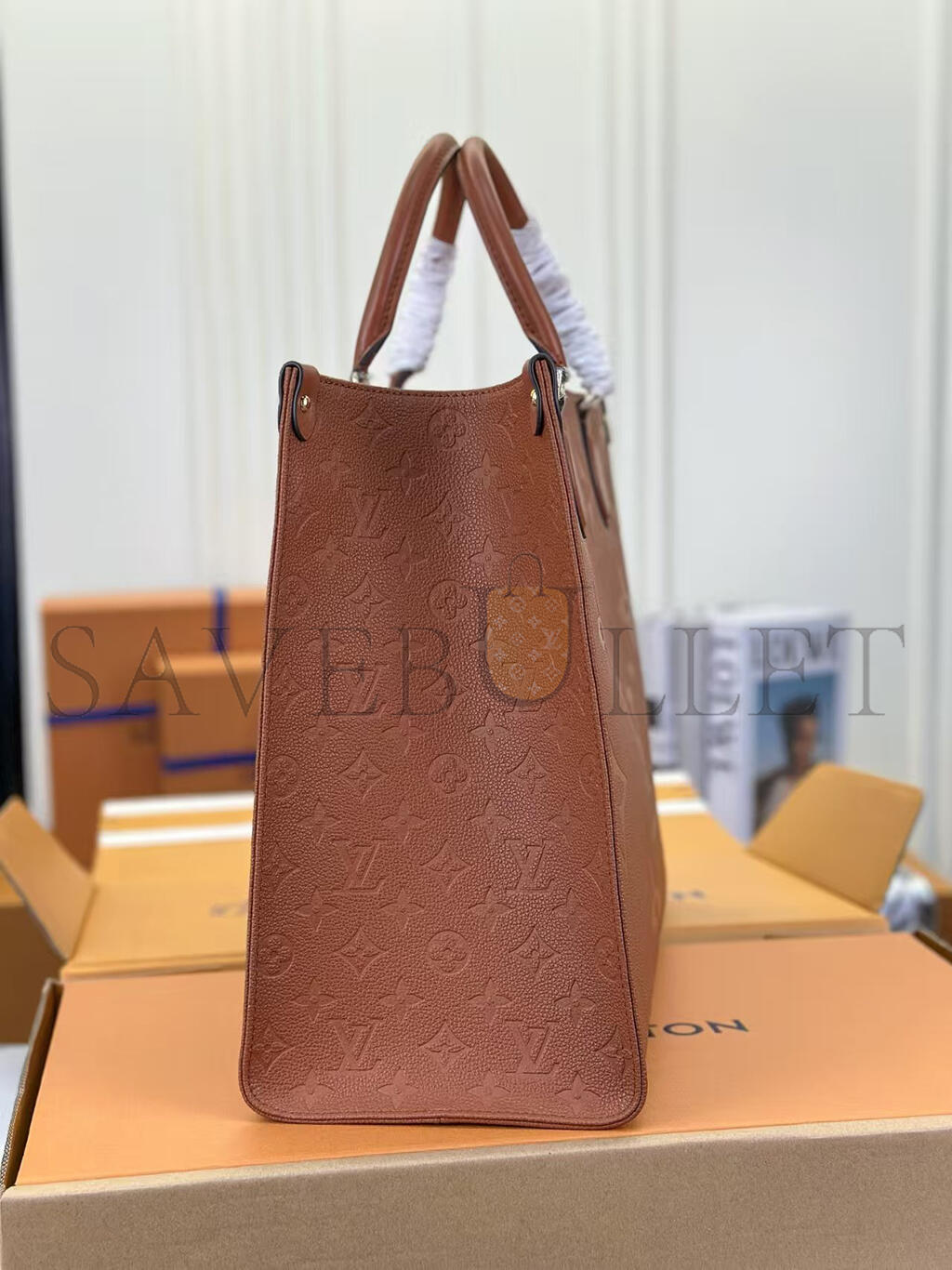 This versatile OnTheGo GM tote bag is made from Monogram-embossed leather, dyed a rich Cognac Brown. Its rectangular design and roomy interior make this carryall great for business, shopping, or travel. It has rolled-leather top handles and long shoulder straps, allowing numerous comfortable carry styles.