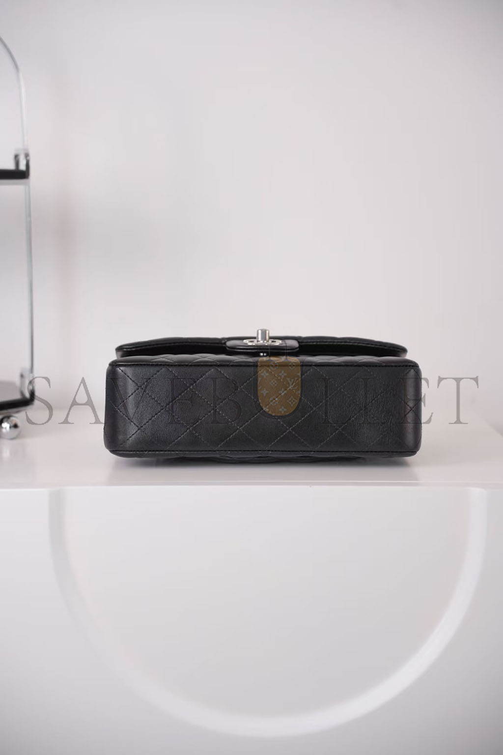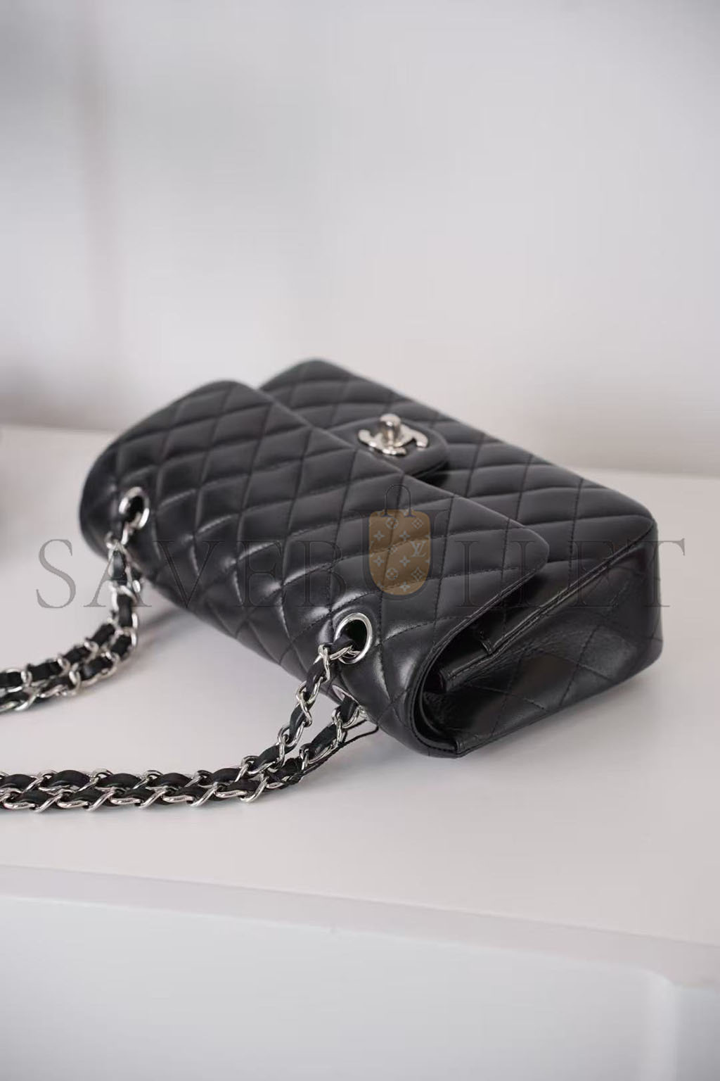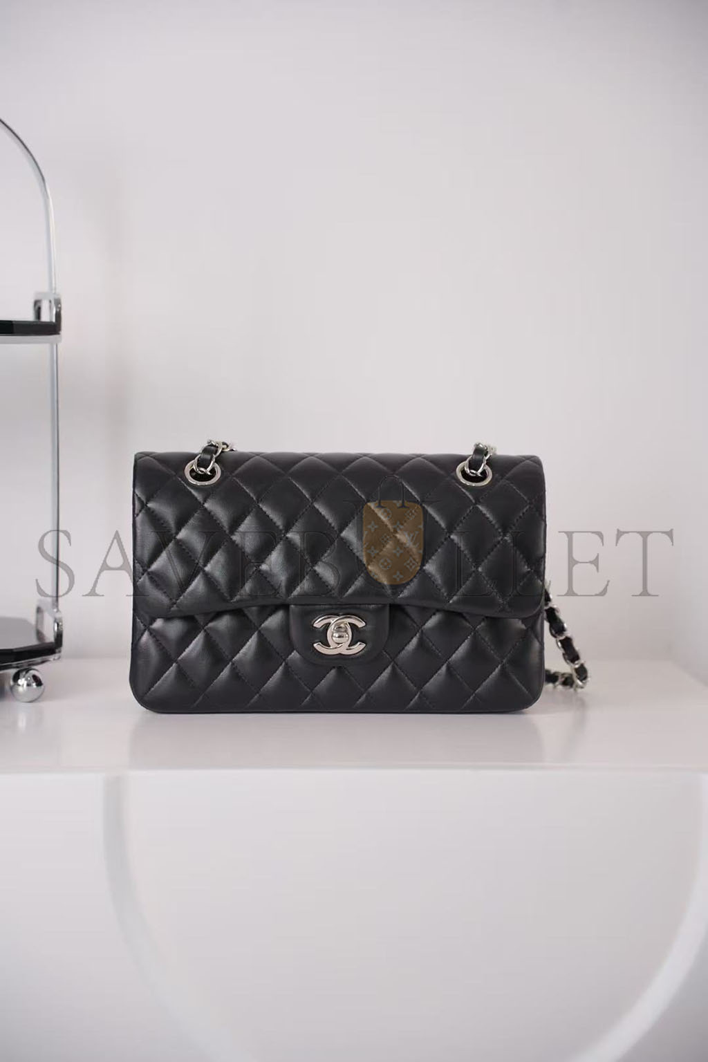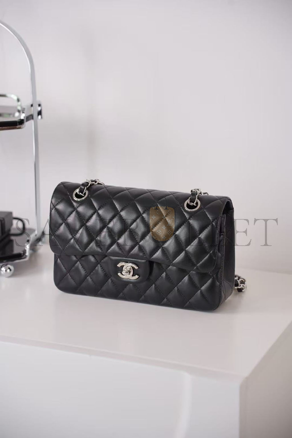 CHANEL MASTER SMALL CLASSIC DOUBLE FLAP BLACK LAMBSKIN SILVER HARDWARE A01113 (23*14.5*6cm)