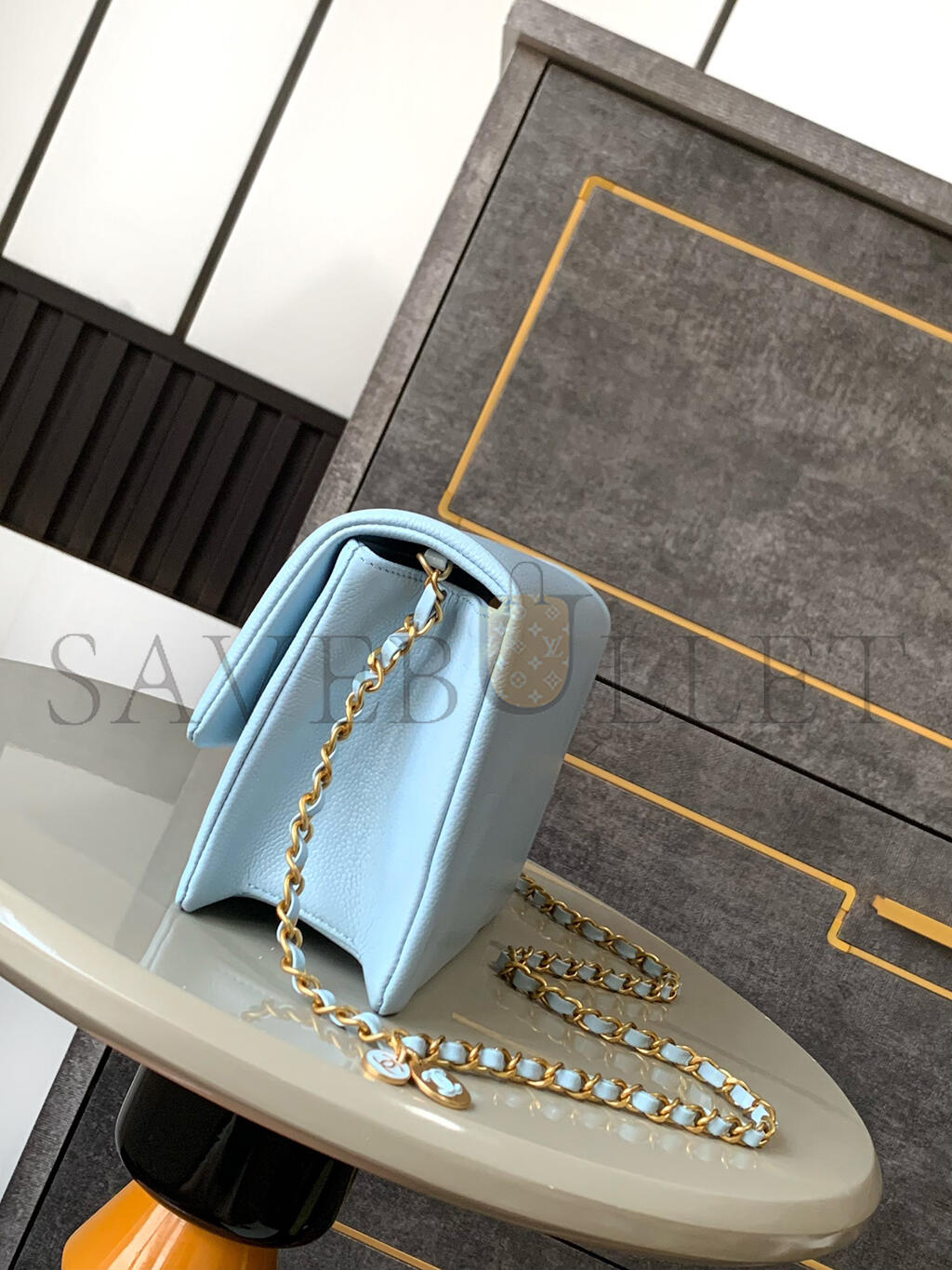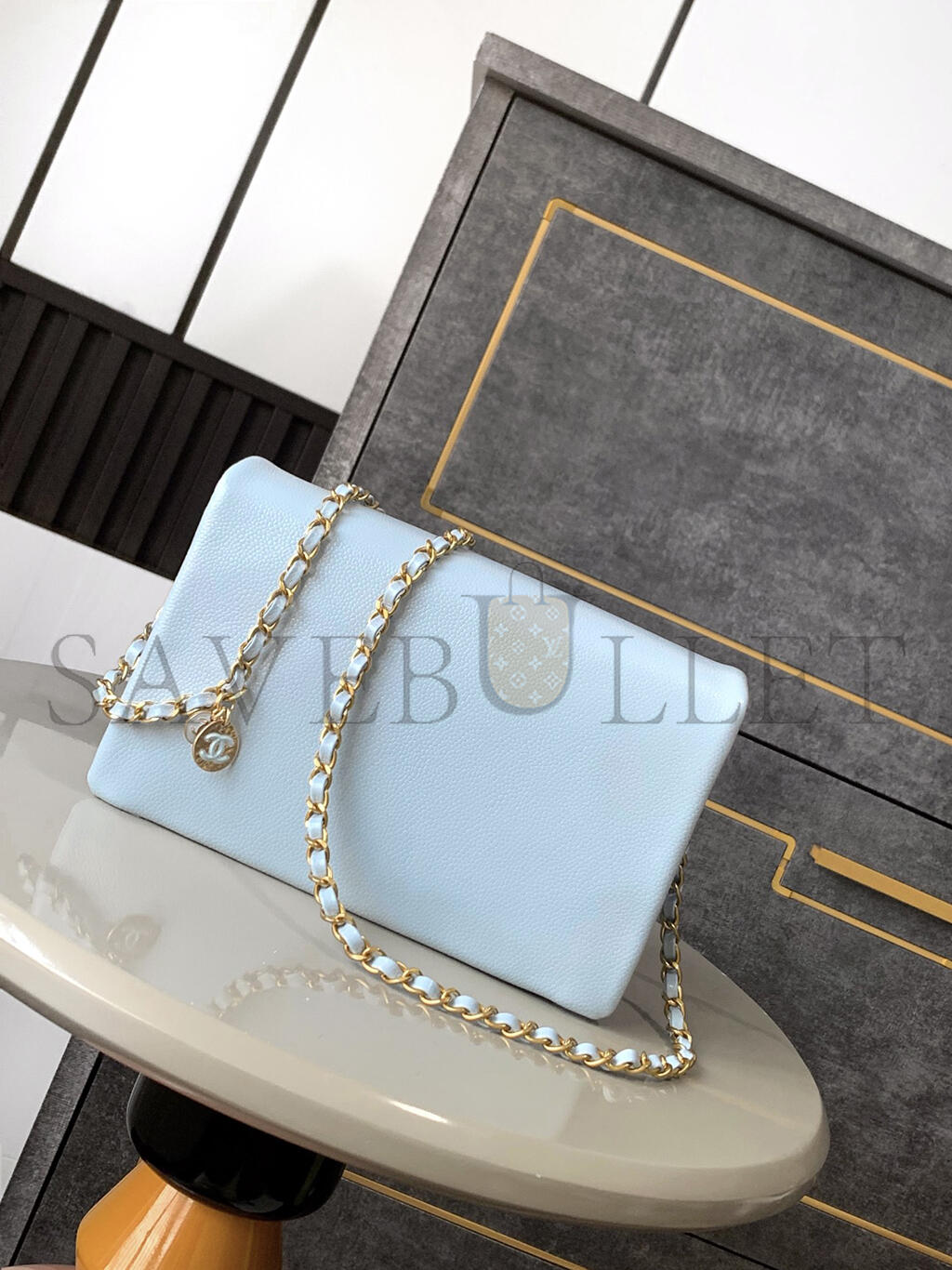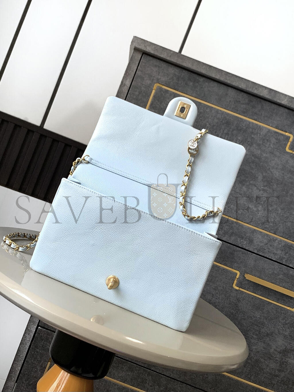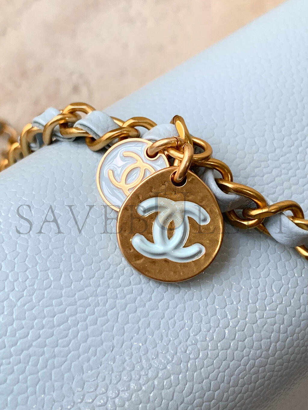 Shoulder, crossbody or hand carryDetachable and adjustable leather strapDetachable donut chain adorned with an Anagram PebbleDiscreet magnetic closure..