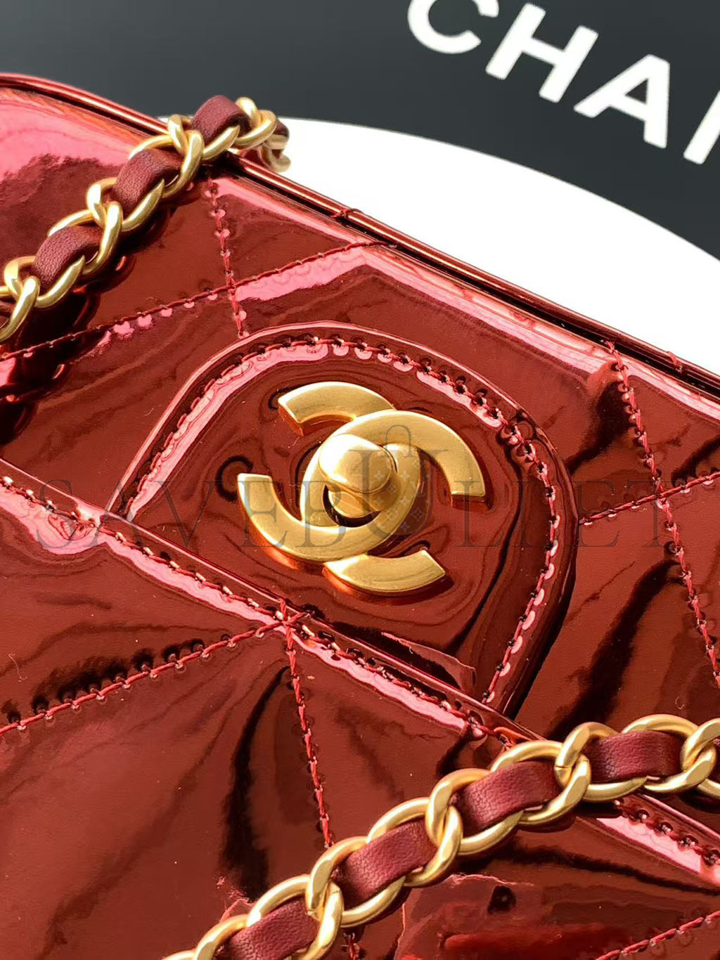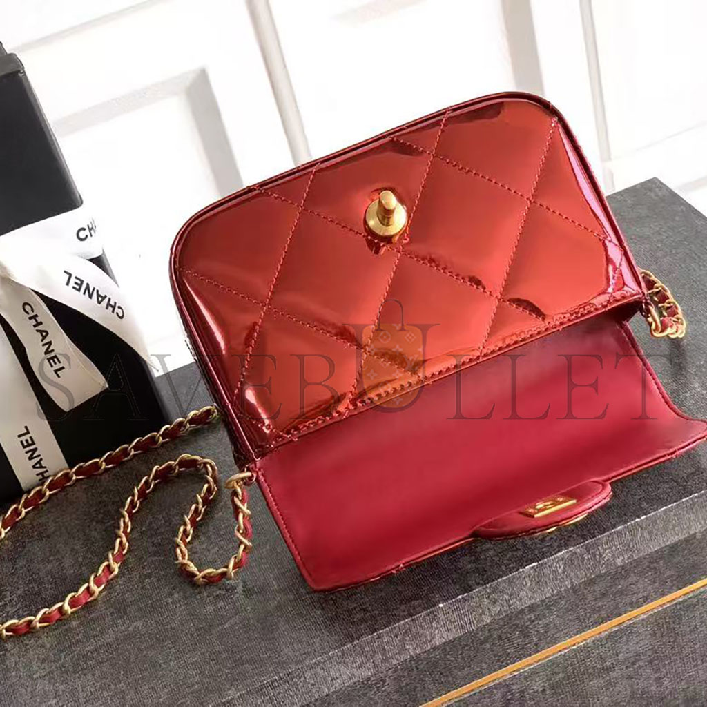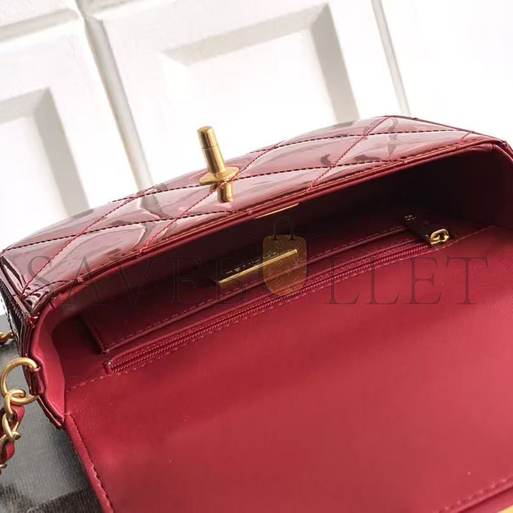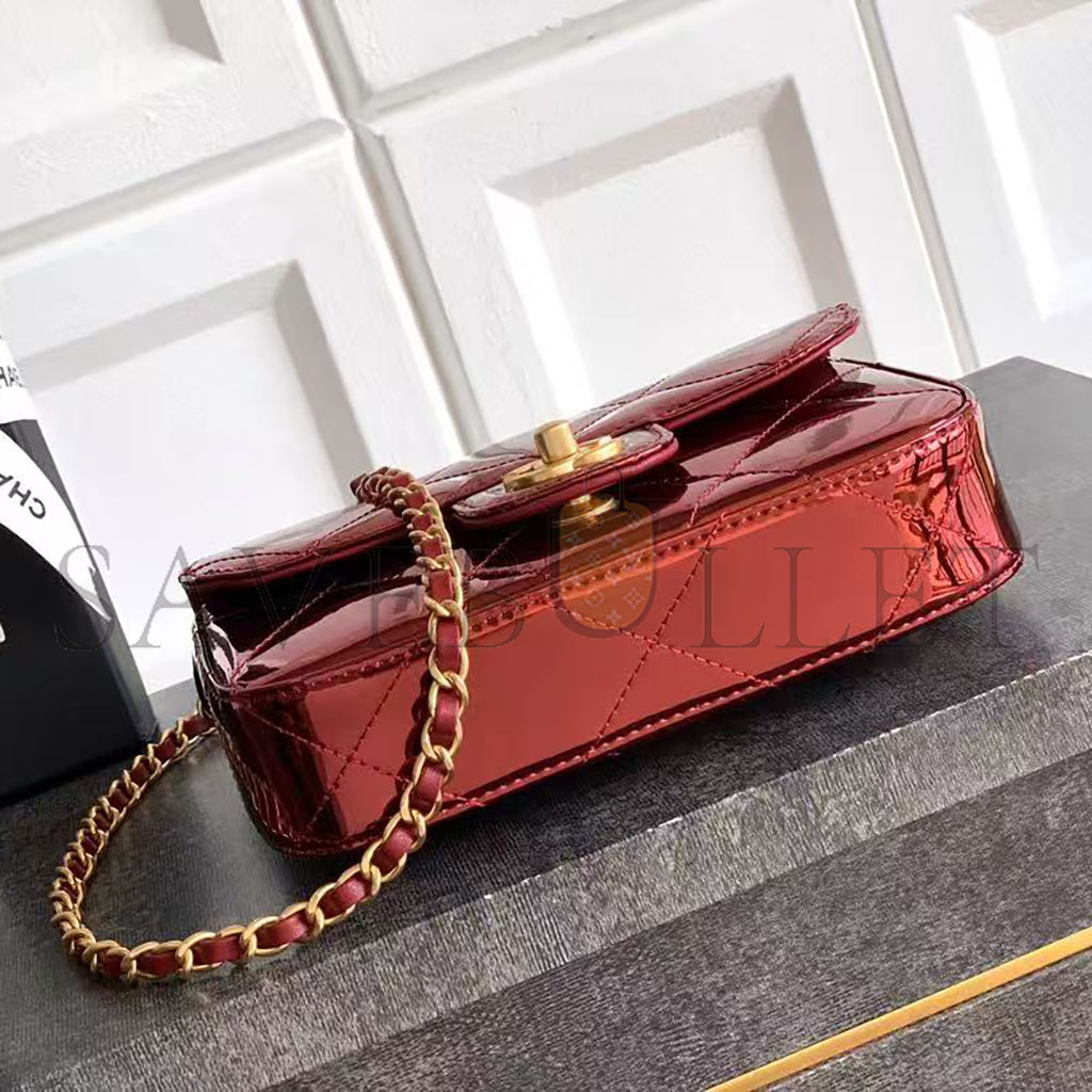 CHANEL FLAP BAG WITH TOP HANDLE METALLIC MIRROR CALFSKIN & GOLD-TONE METAL BURGUNDY AS5850 (18.5*12.9*4.5cm)