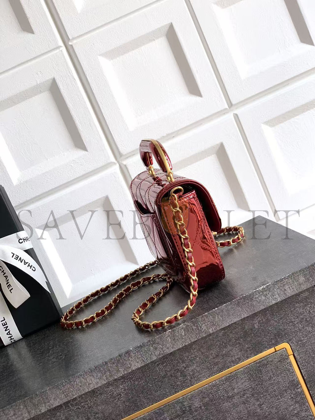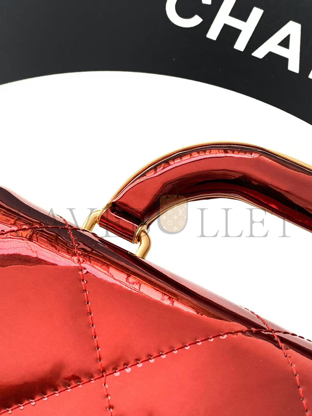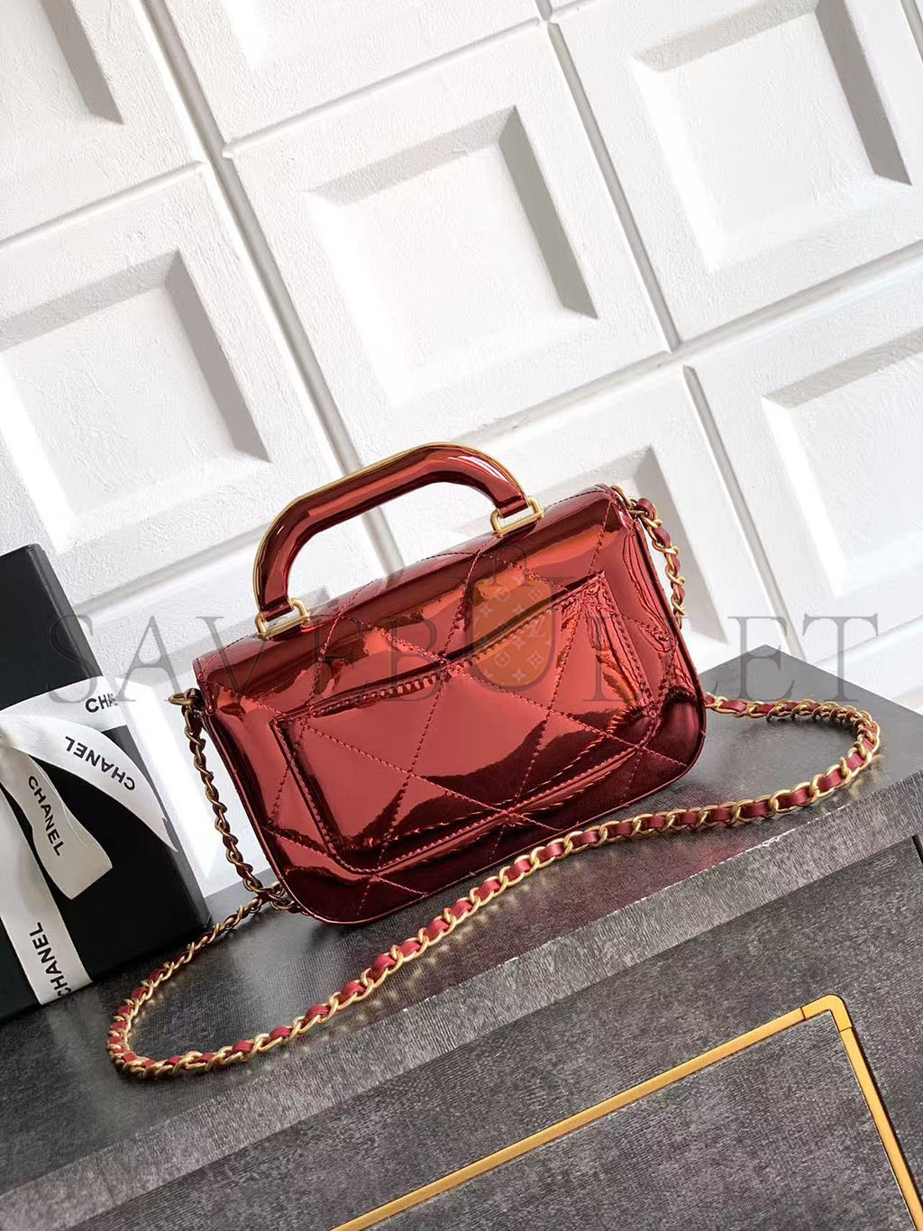 CHANEL FLAP BAG WITH TOP HANDLE METALLIC MIRROR CALFSKIN & GOLD-TONE METAL BURGUNDY AS5850 (18.5*12.9*4.5cm)