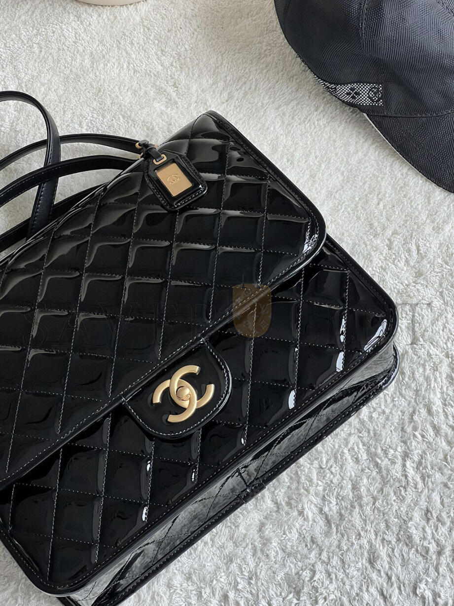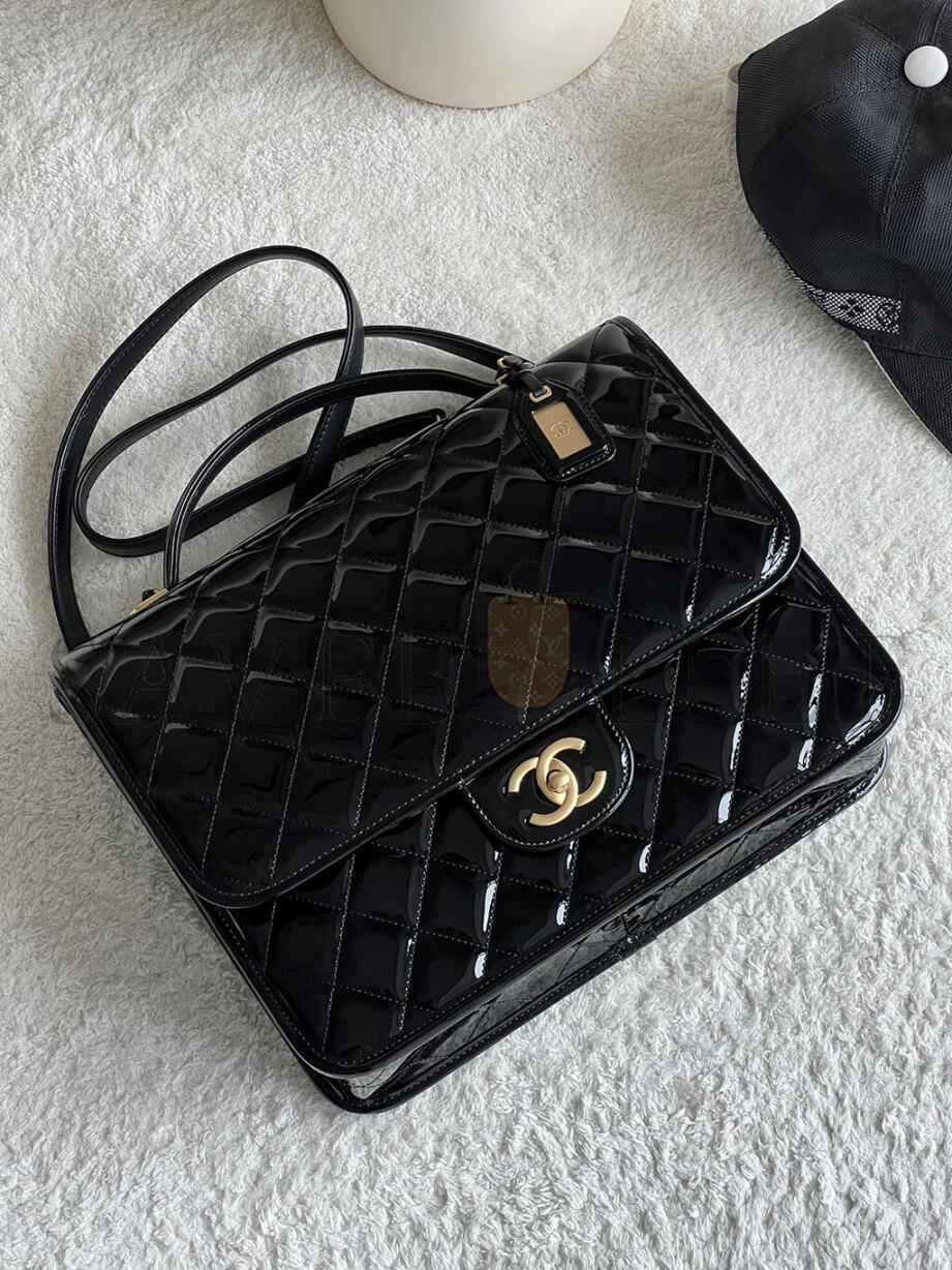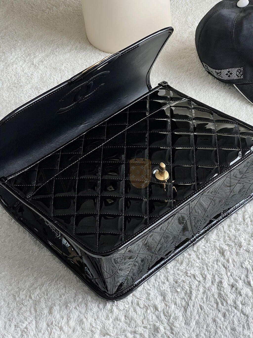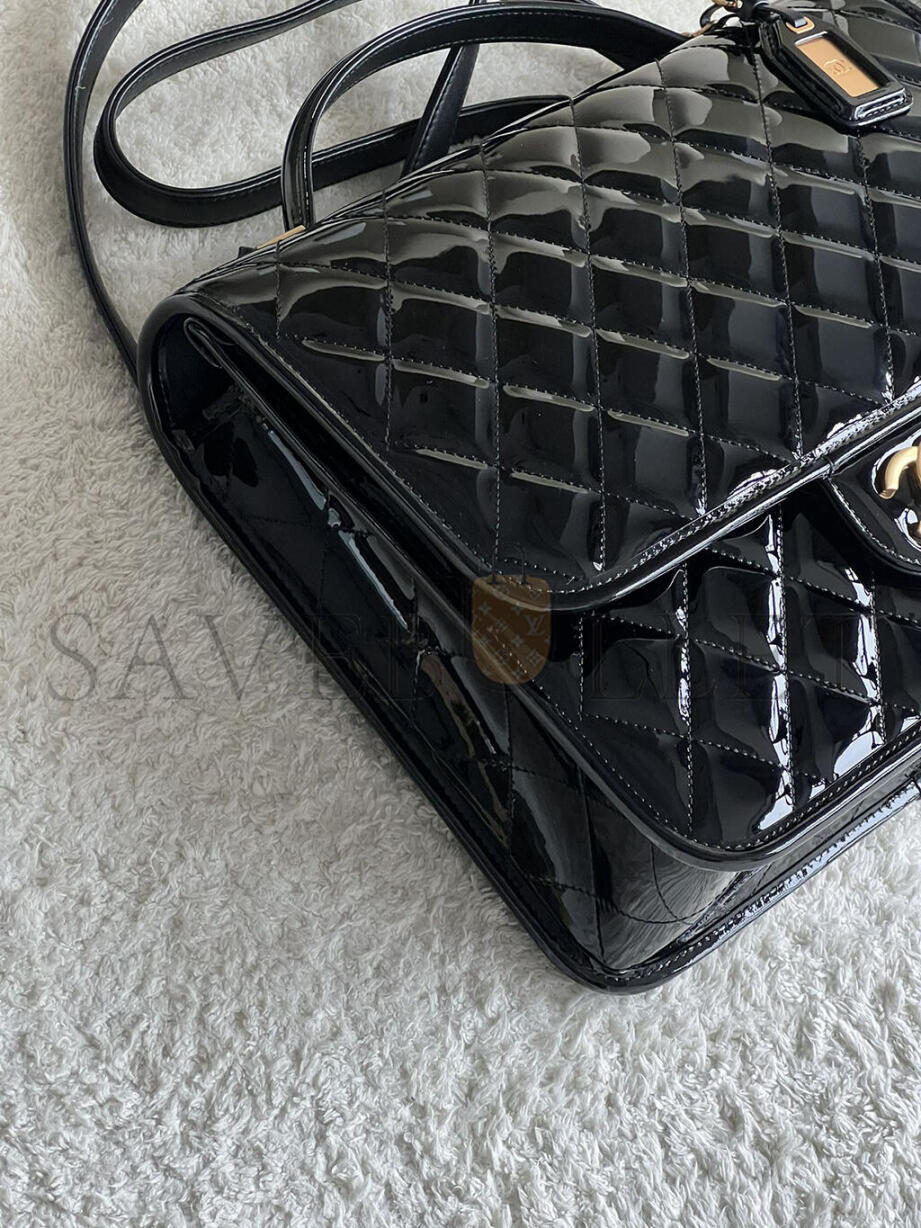 CHANEL LARGE FLAP BACKPACK BLACK PATENT ANTIQUE GOLD HARDWARE (30*23*10cm)