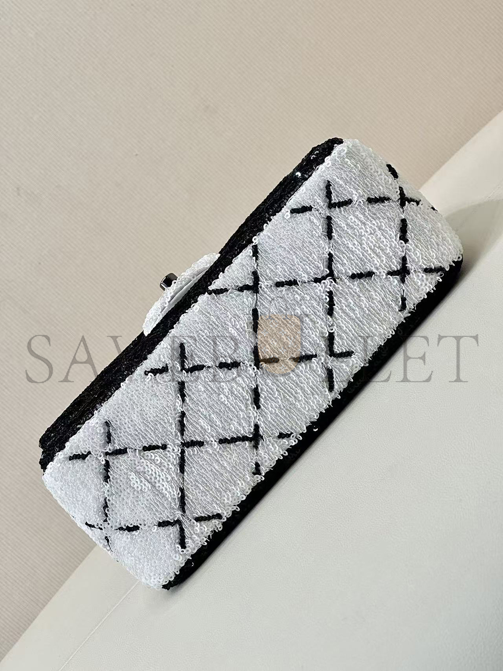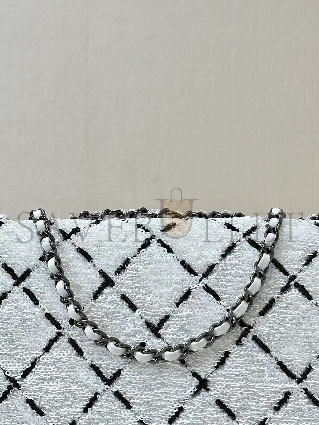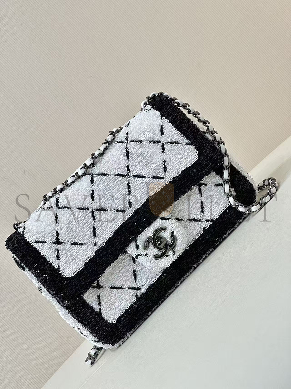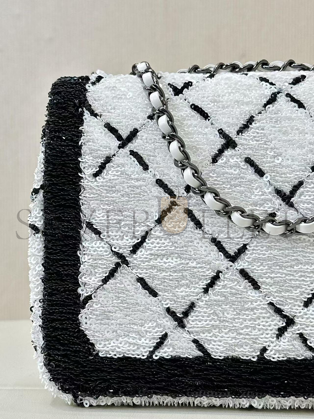 CHANEL SEQUIN CC SMALL SINGLE FLAP WHITE BLACK 1468914 (20*13*6cm)