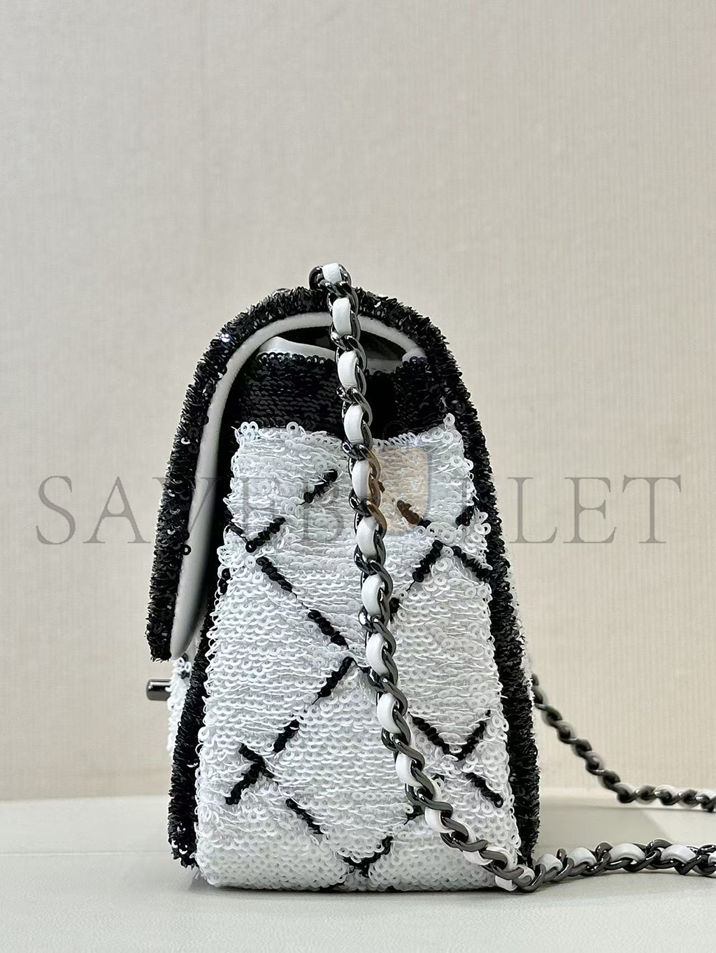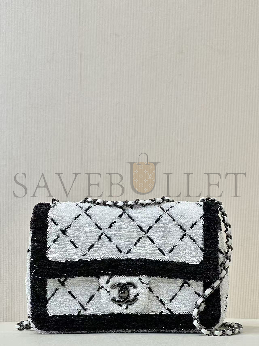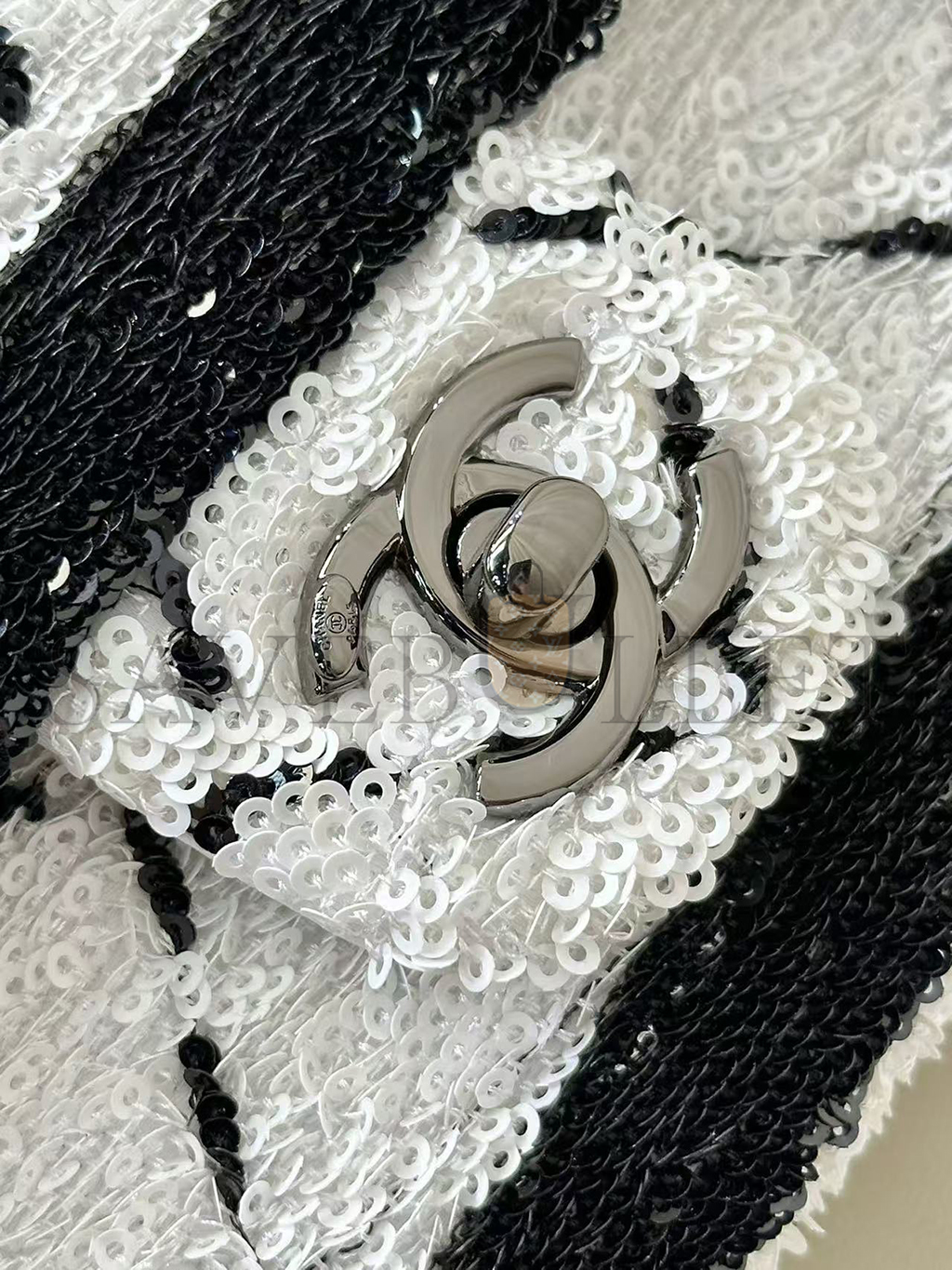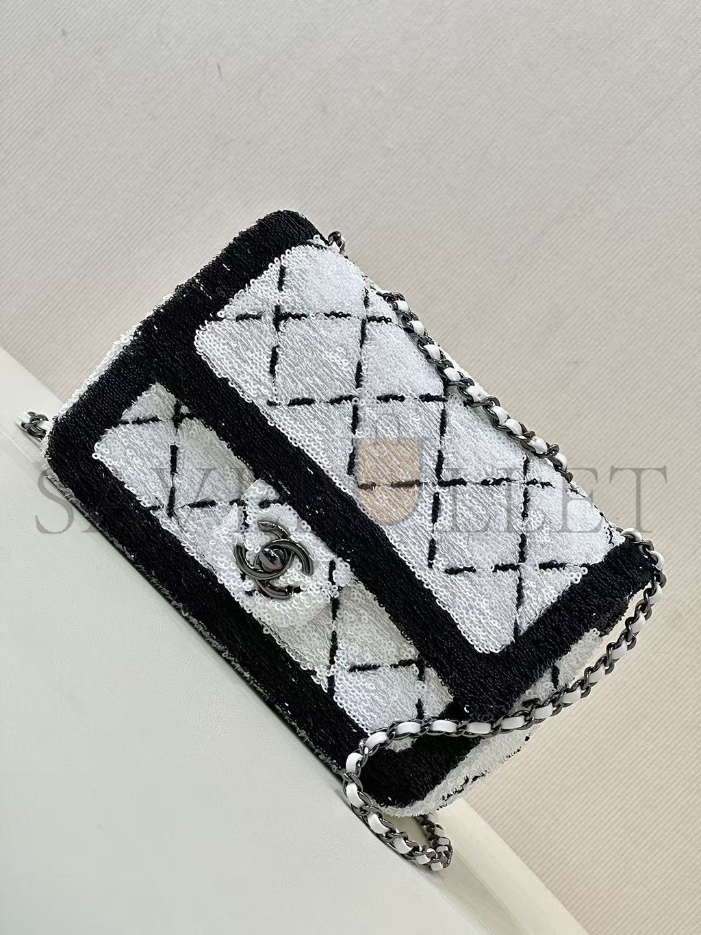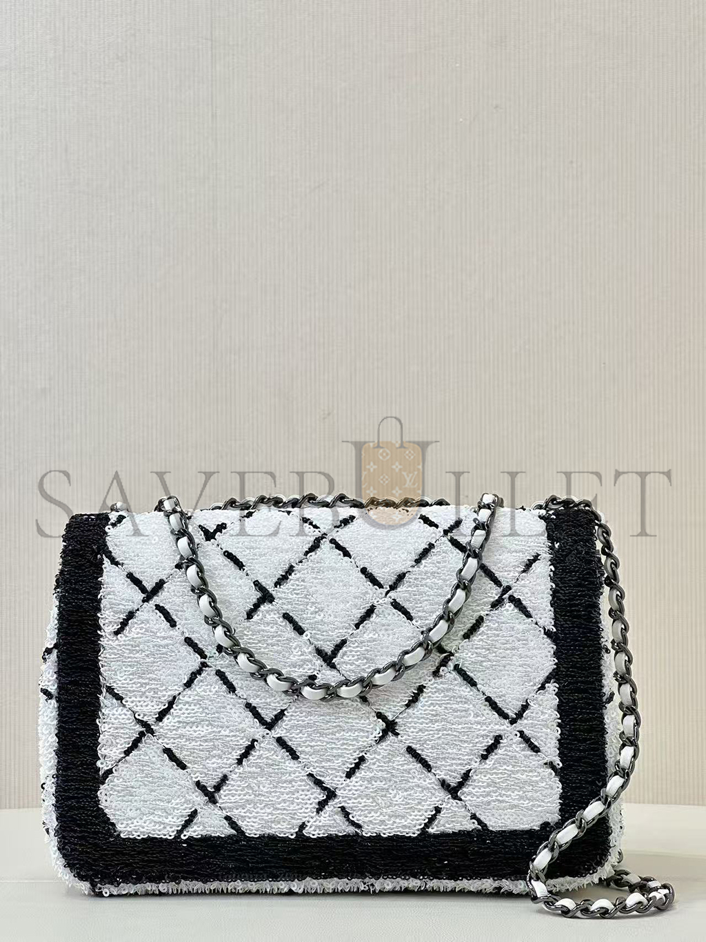 CHANEL SEQUIN CC SMALL SINGLE FLAP WHITE BLACK 1468914 (20*13*6cm)