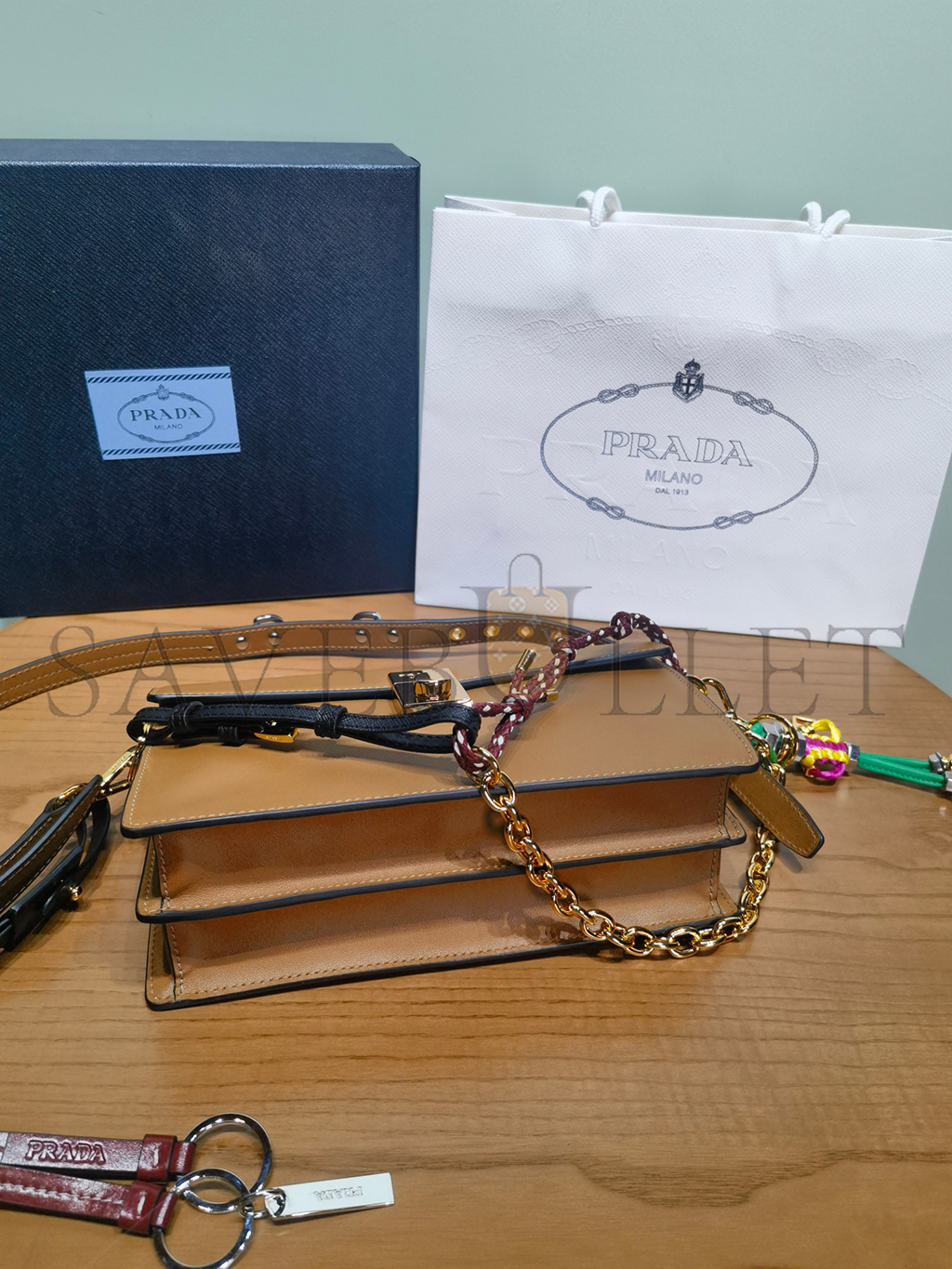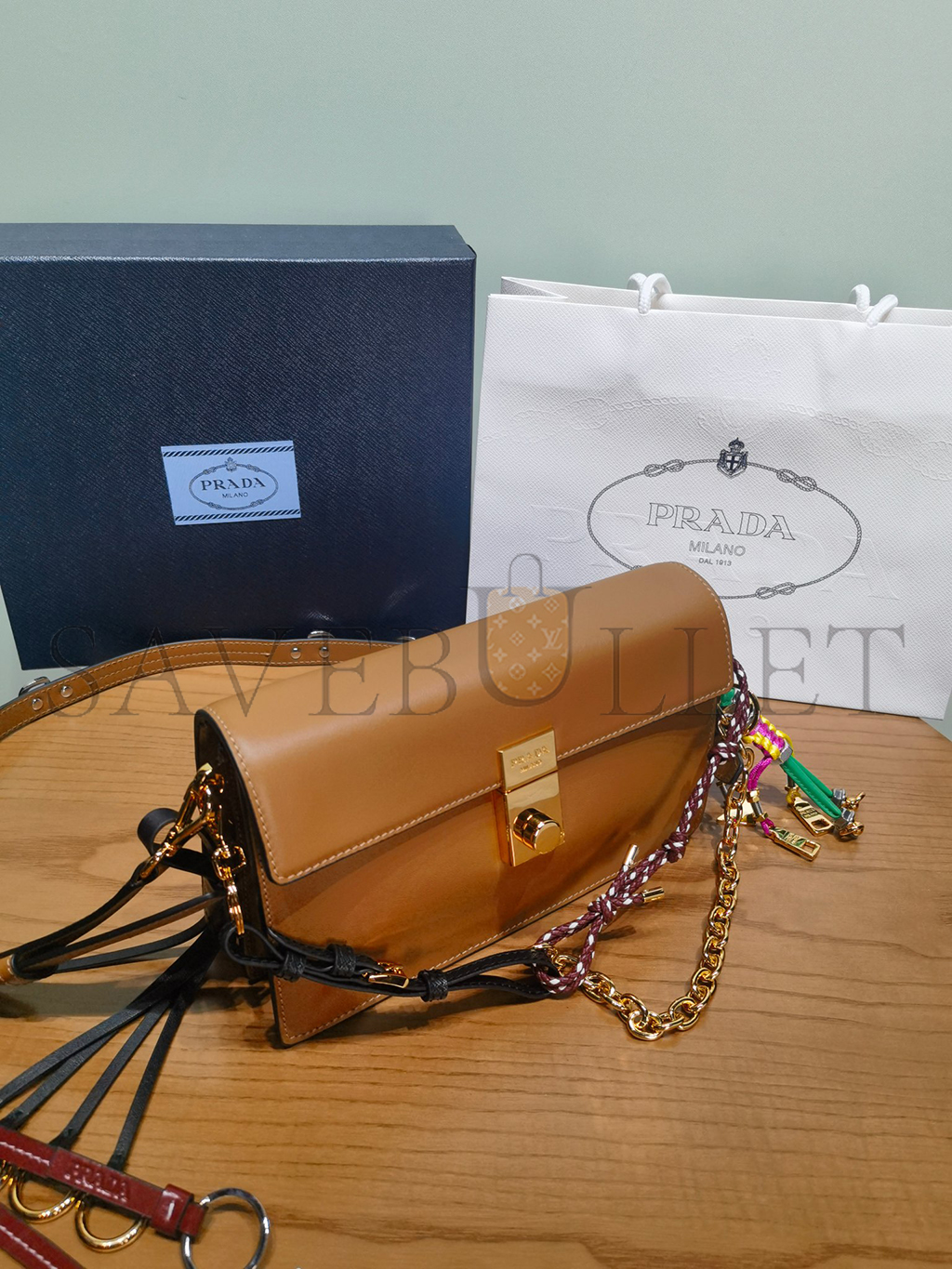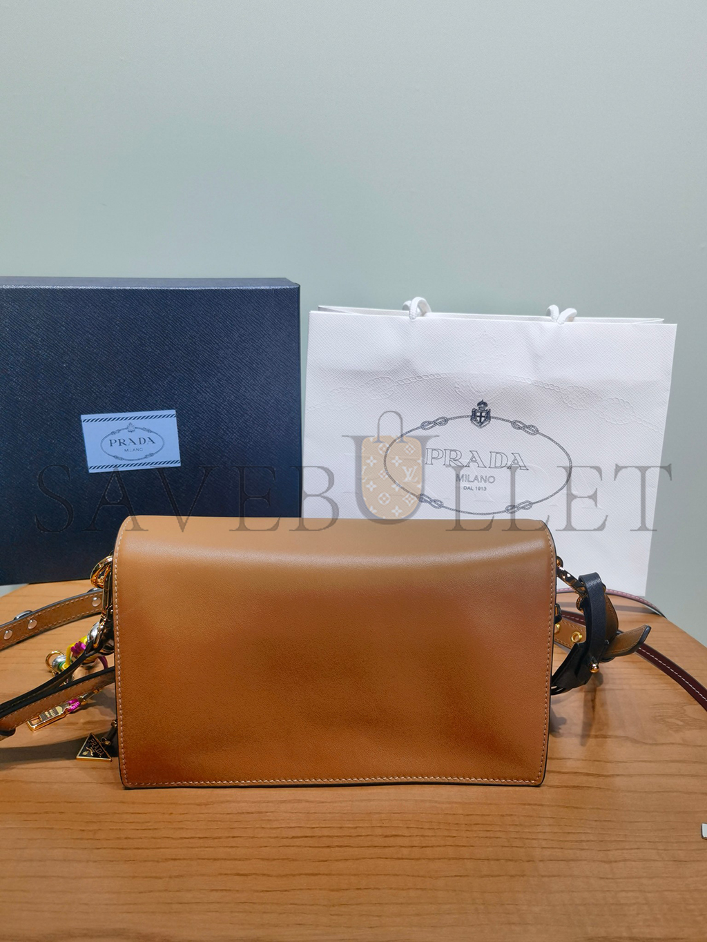 PRADA SOFT SOUND SMALL LEATHER SHOULDER BAG WITH CHARMS 1BD379 (24*13.5*5cm)
