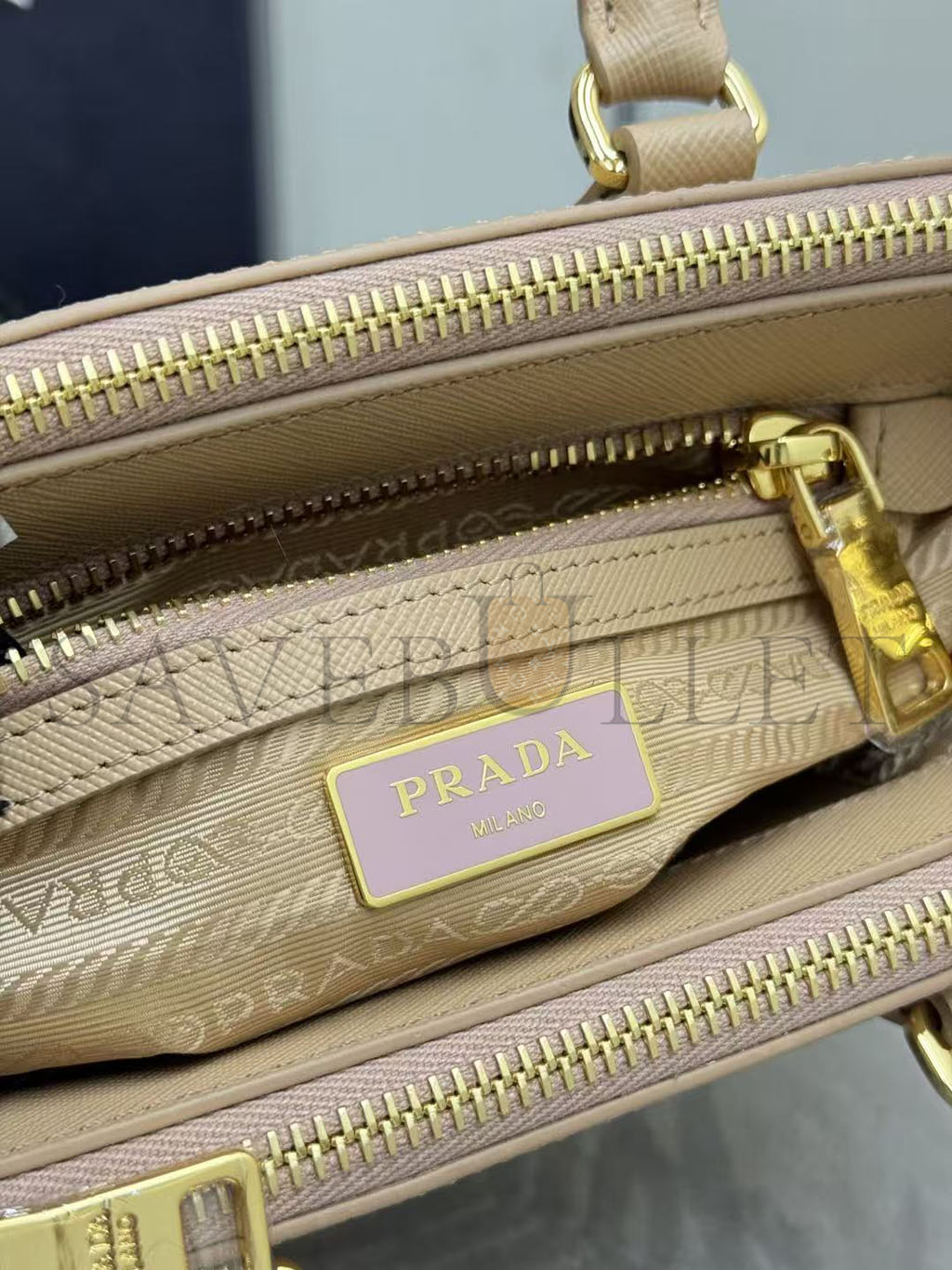 Logo-printed nylon interior with two pockets, including one with zipper