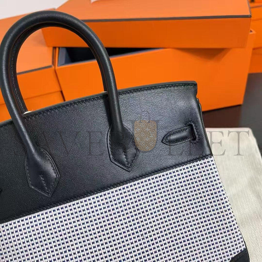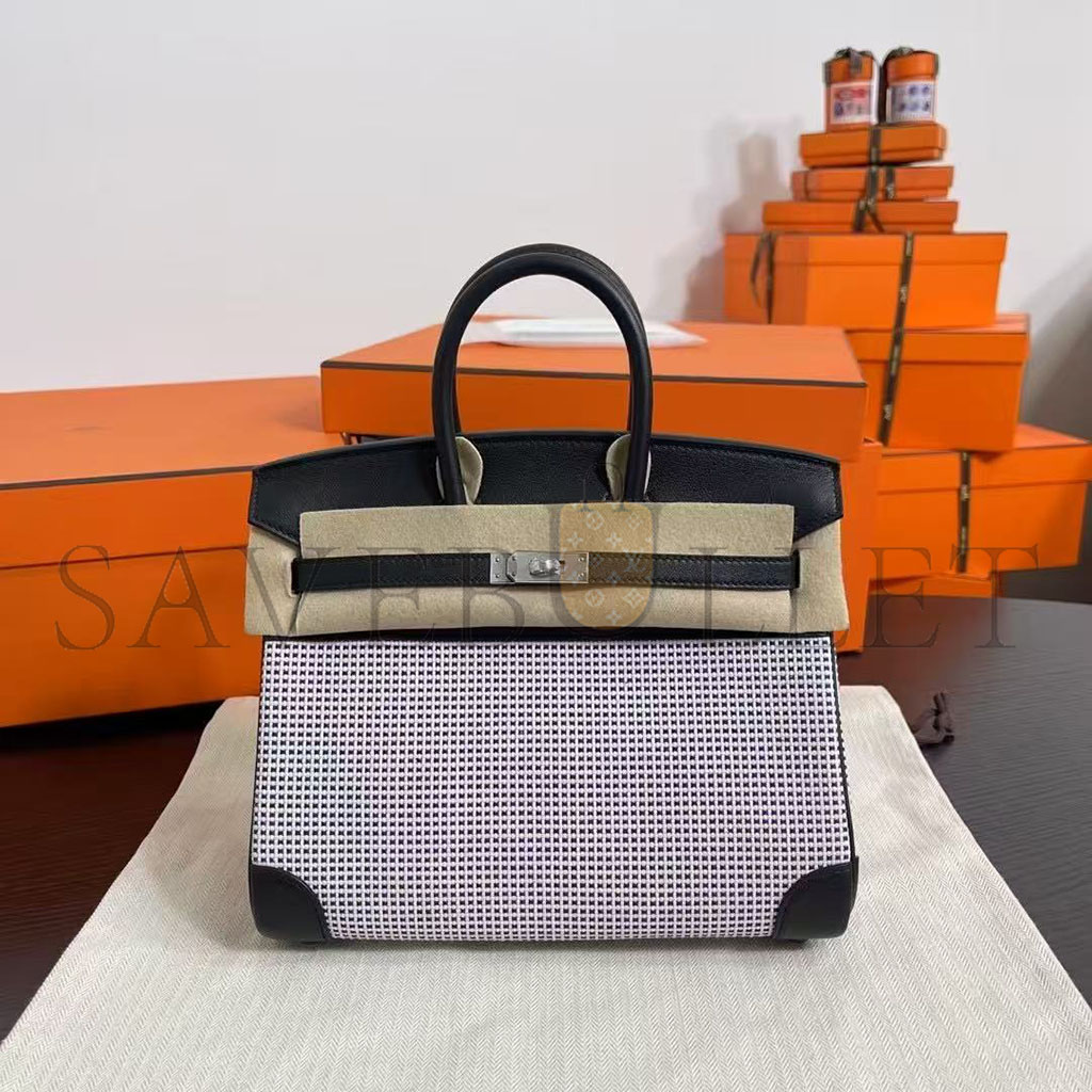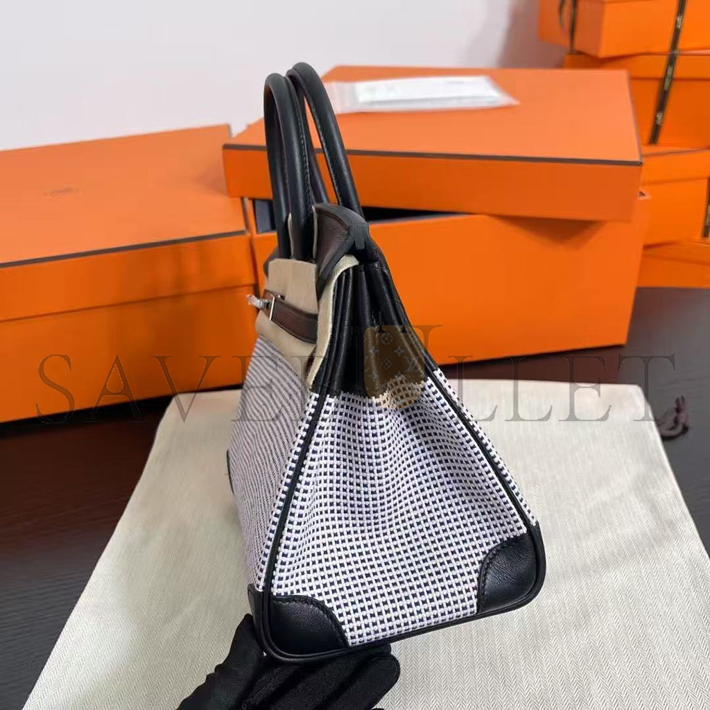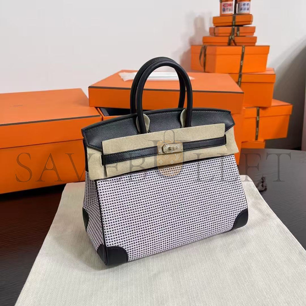 HERMÈS MASTER QUADRILLE BIRKIN 25 BLACK SWIFT AND ECRU TOILE PALLADIUM HARDWARE (25*20*13cm)