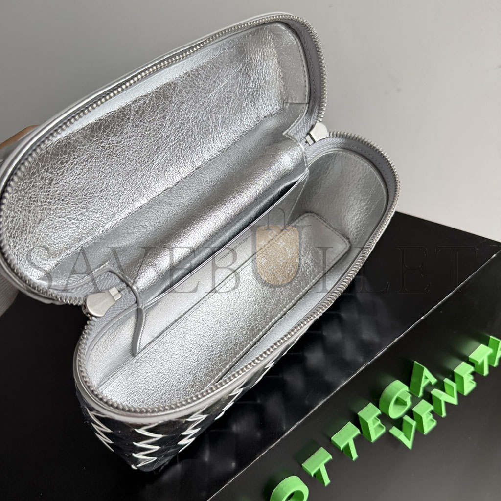 Vanity case in Intrecciato laminated leather with satin finish, featuring a detachable strap.