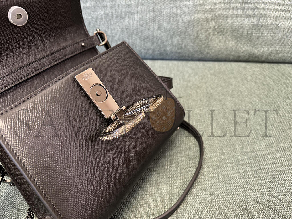 East West curved bag that hugs the bodyHinge opening system wrapped with leatherSignature folding detail on the bottom of the bagDecorative ties with ..