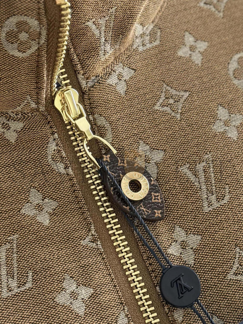 This jacket makes a chic signature statement in the House’s iconic double-face wool-silk blend featuring an allover Monogram motif in soft seasonal tones. It is cut with clean lines in a casual, hip-length straight shape with a high neckline. The front is fastened with an exposed zipper, while the cuffs can be adjusted with tonal leather tabs.