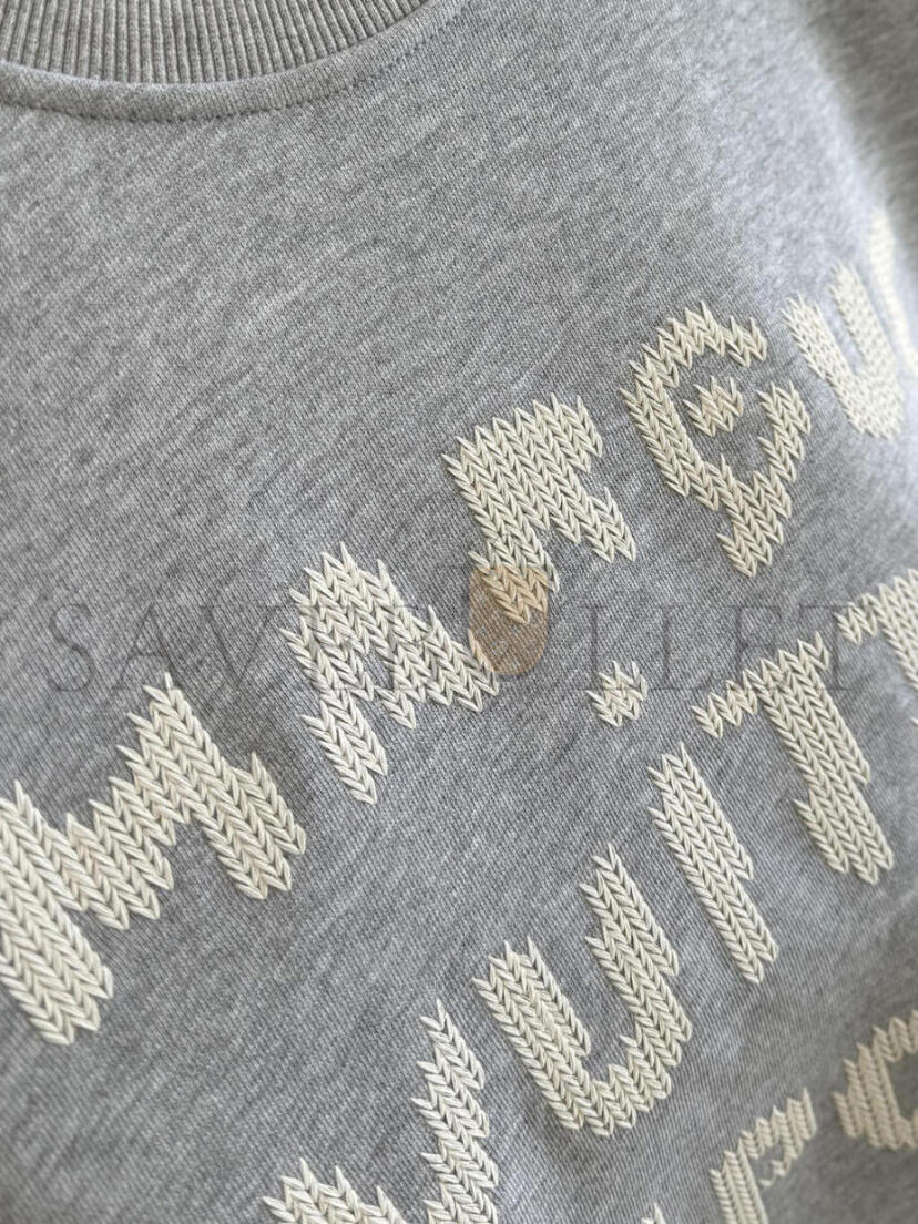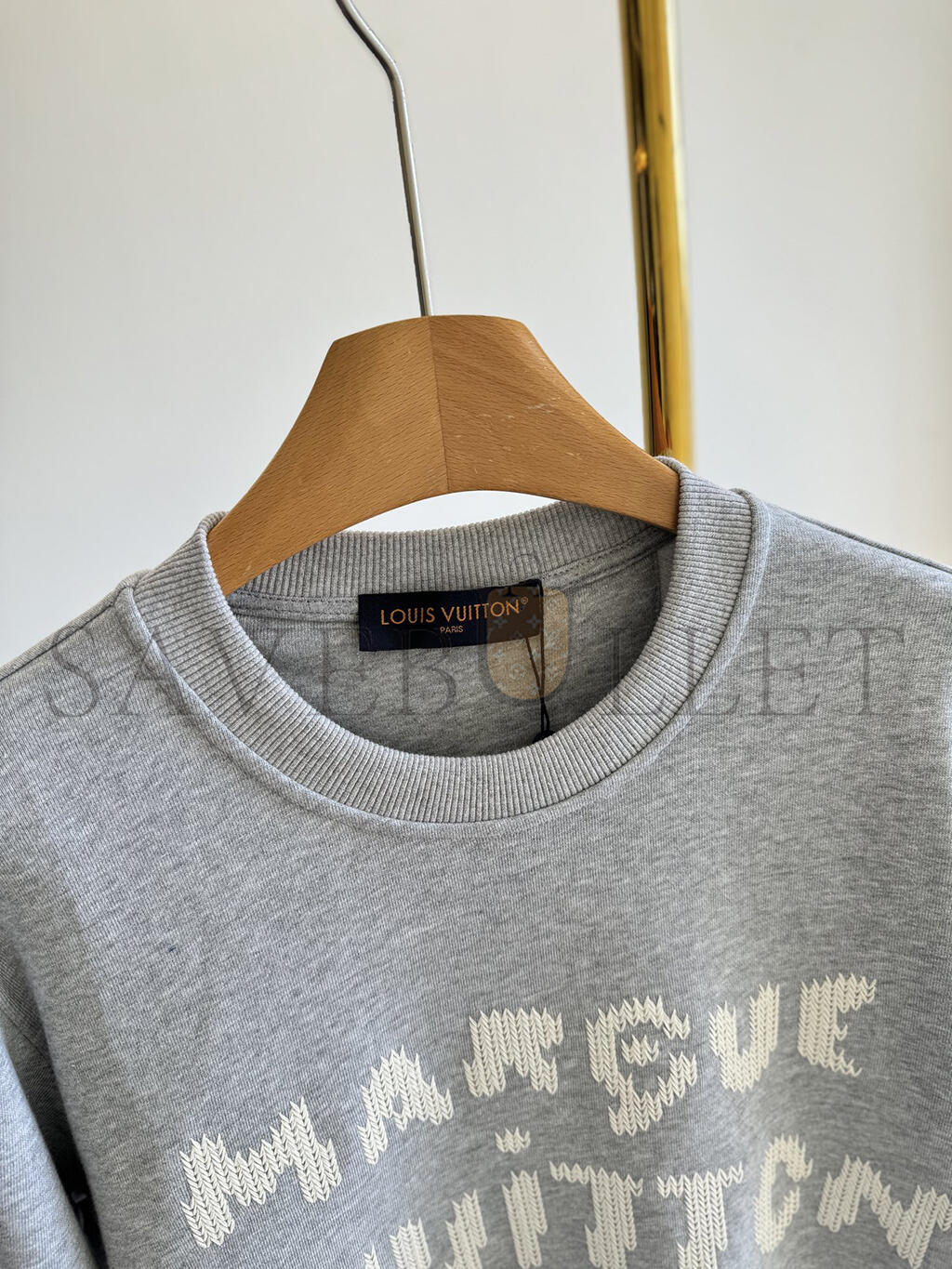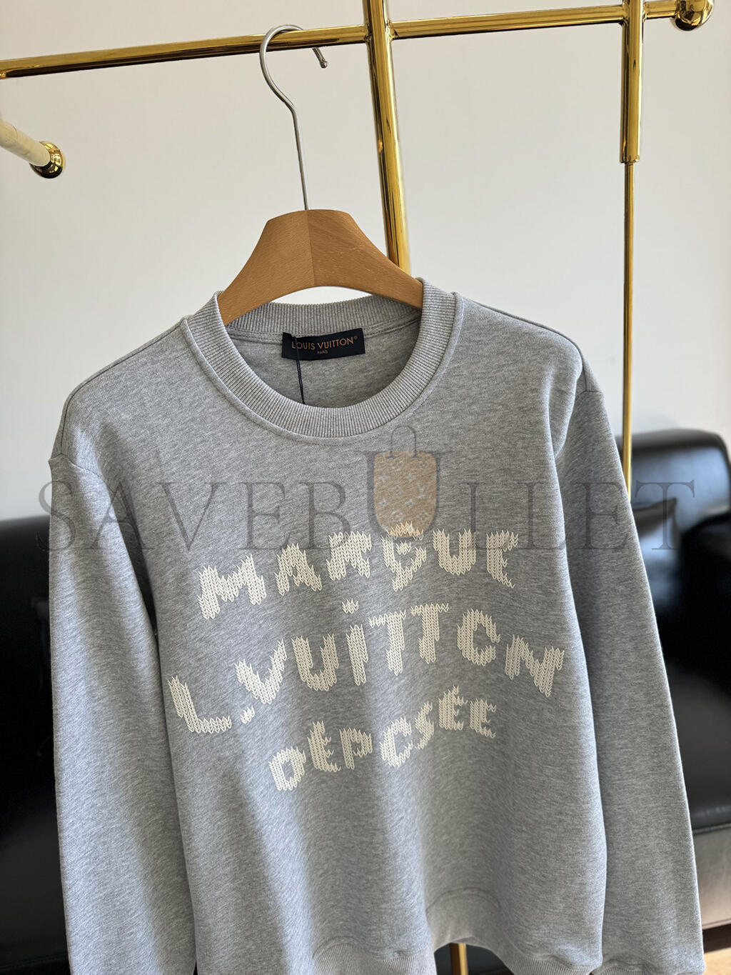 This soft gray cotton sweatshirt is a timeless casual piece elevated with graphic signature embroidery. It is adorned with a contrasting white Marque L.Vuitton Déposée signature on the front, which has been playfully embroidered with large stitches creating a trompe loeil hand-knitted effect. An LV signature in the same technique signs the back.
