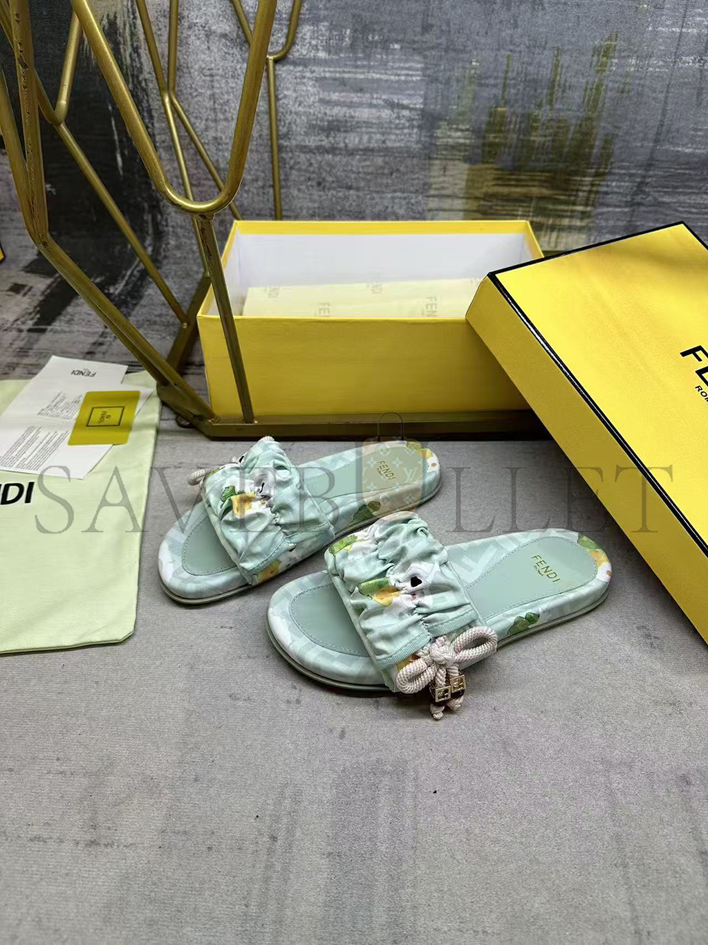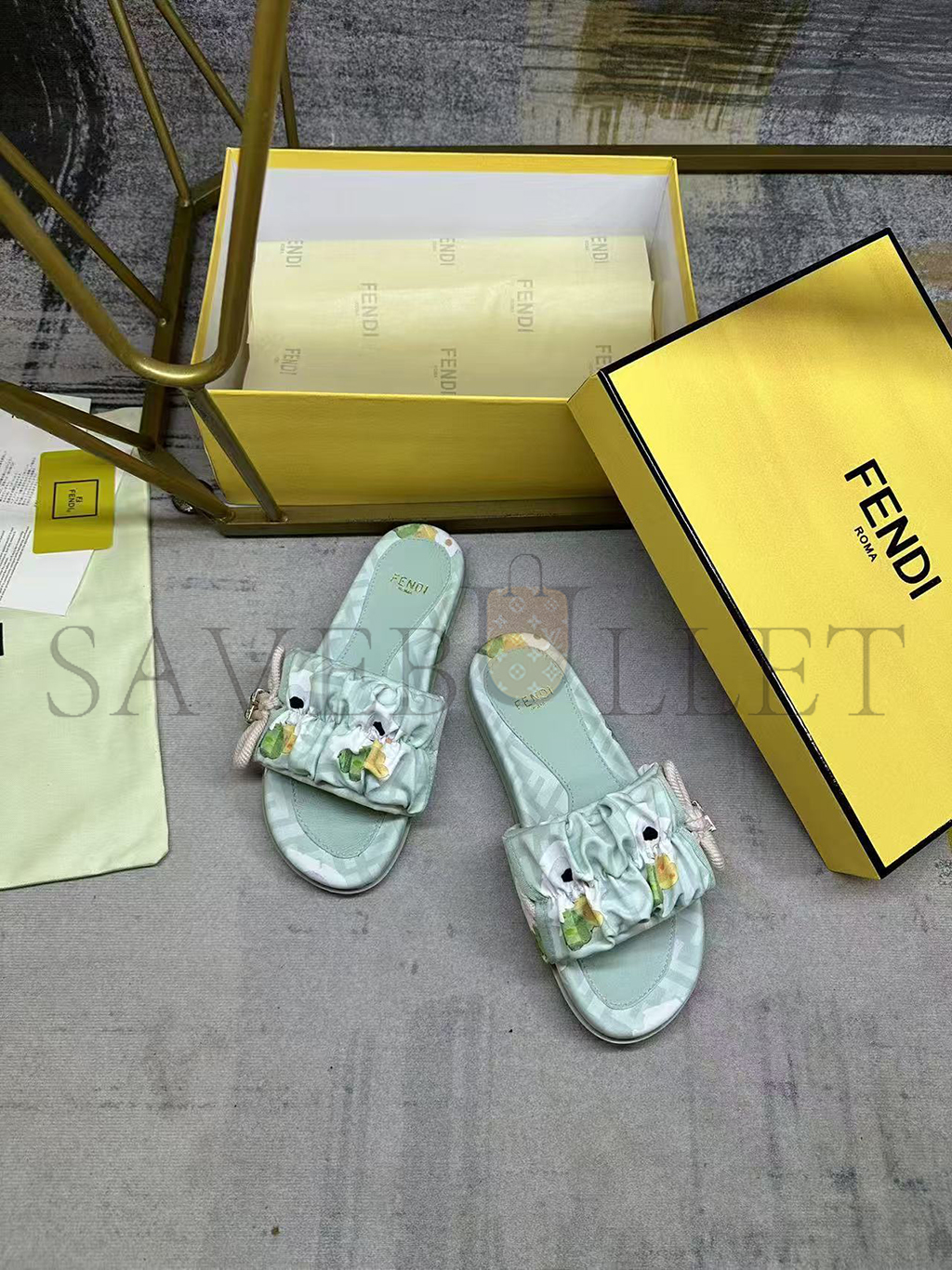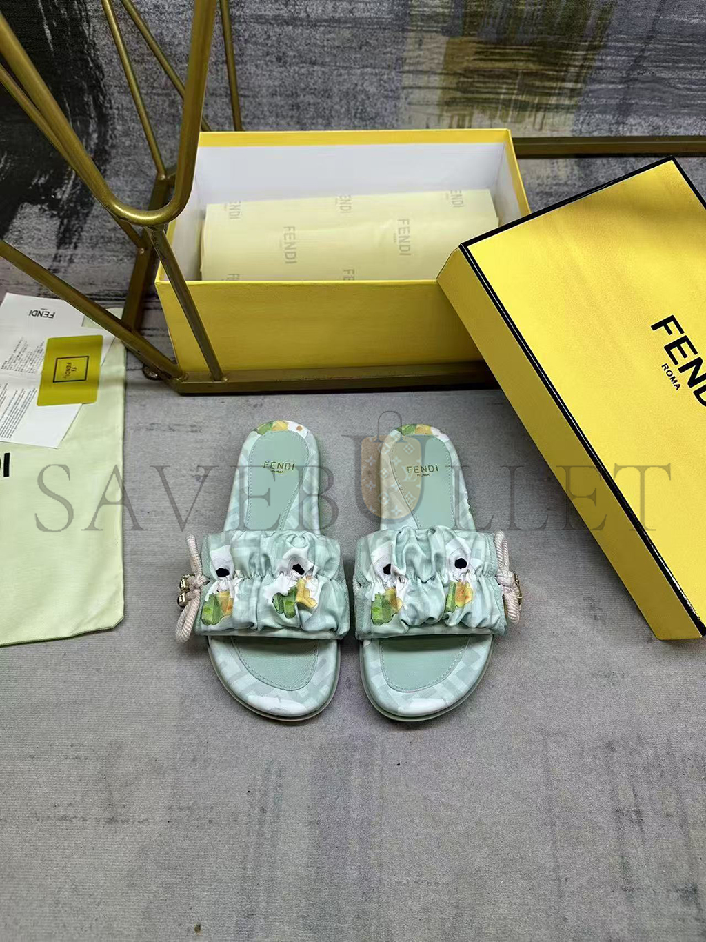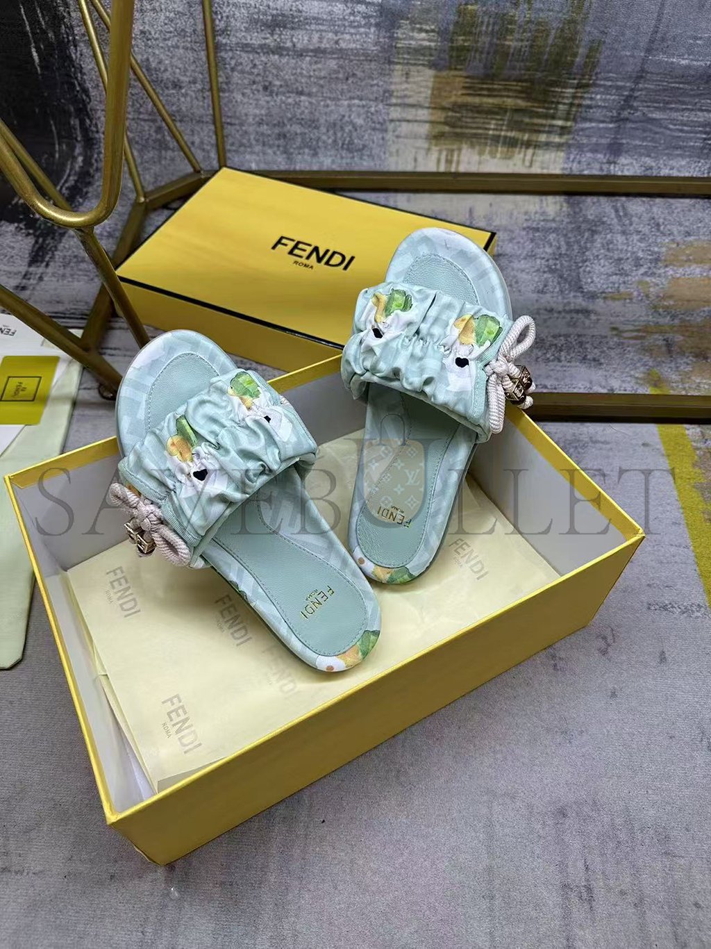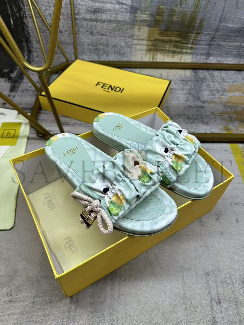 Wide-band flat slides. Made of FF jacquard satin with Fendi Bouquet print in light green and pink. Decorated with a gathered bow with pink braided ribbon drawstring. Brown resin-effect beads and square gold-coloured metal element with FF motif.