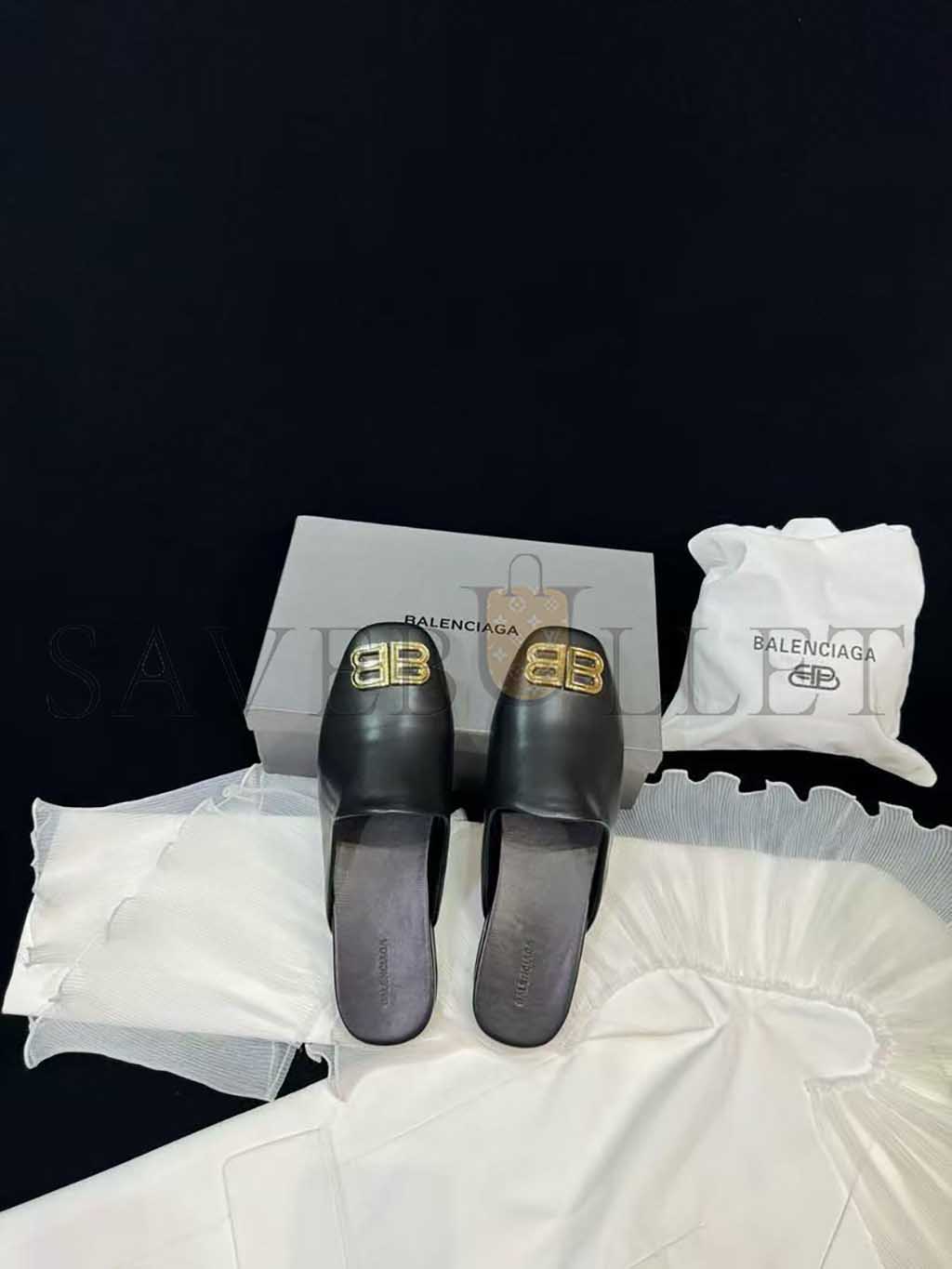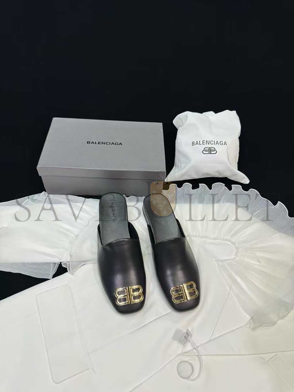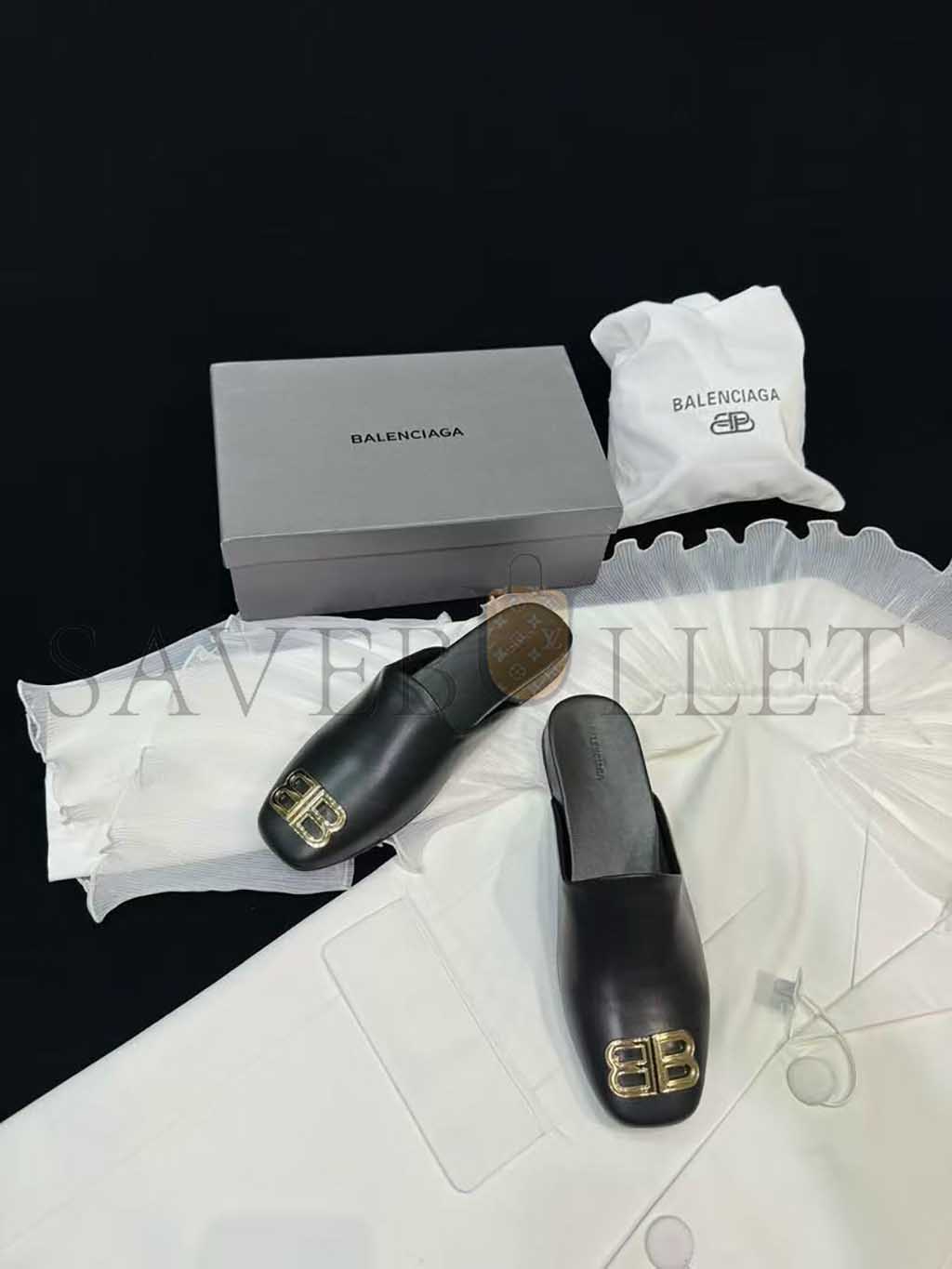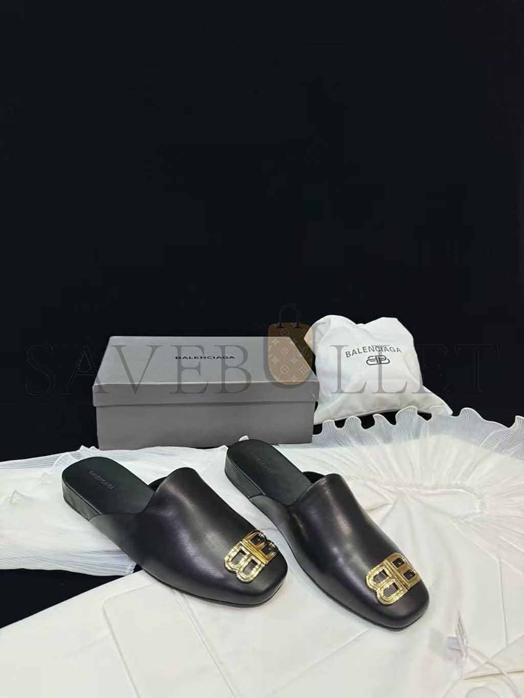 BALENCIAGA LEATHER COSY BB MULES BLACK