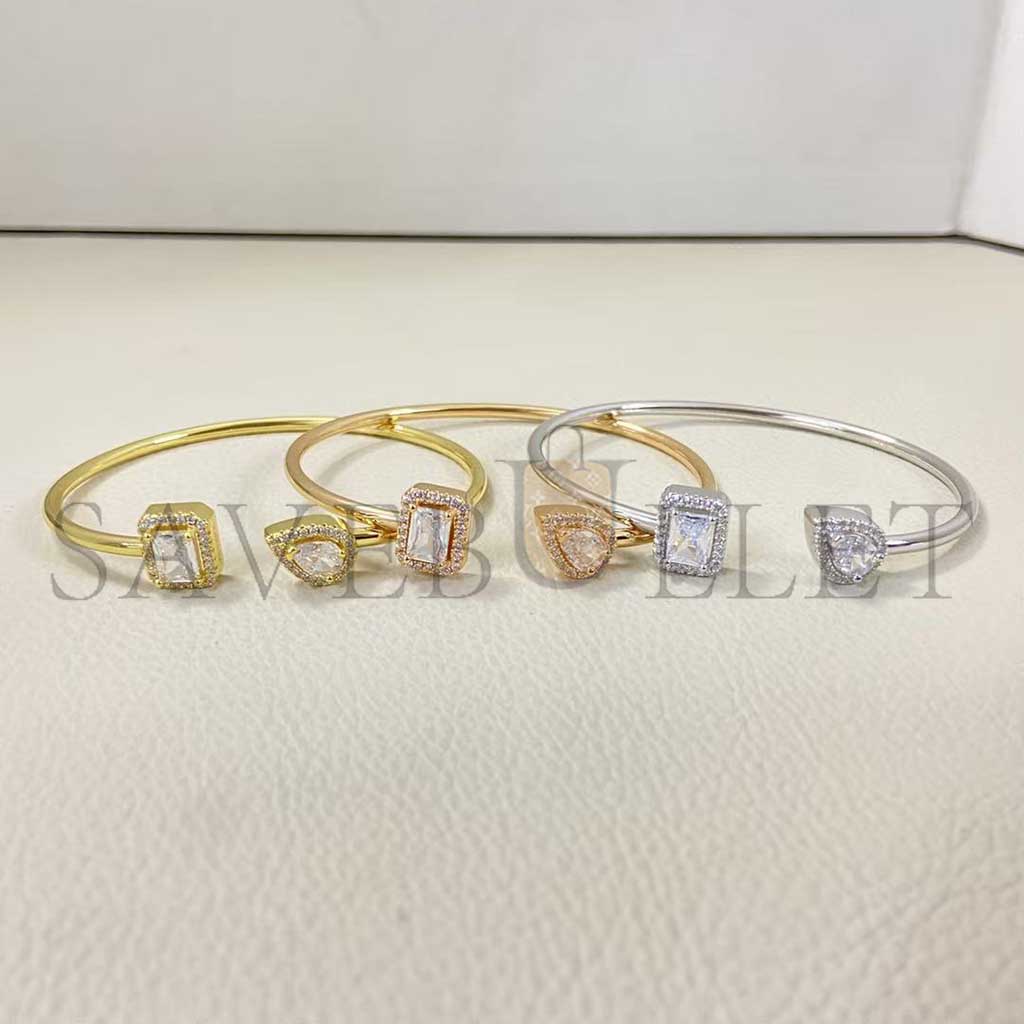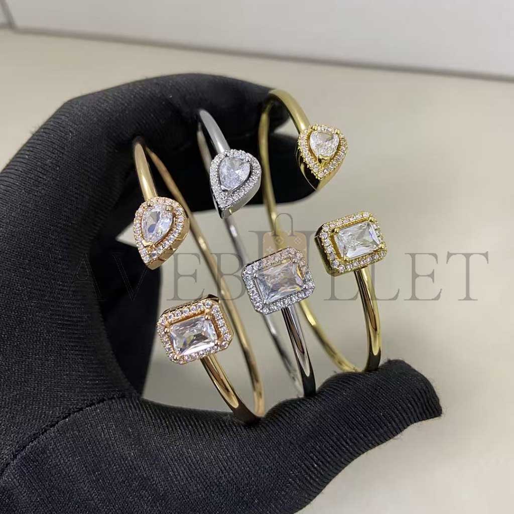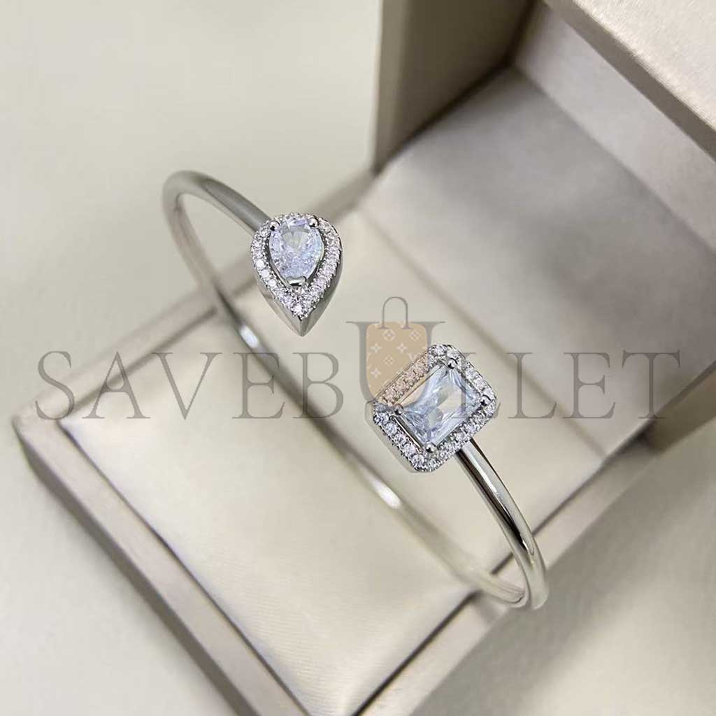 Ce bracelet jonc diamant en or blanc 18 carats My Twin s'adaptera avec souplesse à votre tour de poignet. Tout en finesse, discret et élégant, ce jonc d'or ouvert sur le dessus du poignet met en face à face un diamant taille poire de 0,15ct et un diamant taille émeraude de 0,15ct, pierres signatures de la collection My Twin. On craque pour le design très graphique de ce bracelet jonc diamant en or blanc My Twin : entre sensualité et éclat, les deux pierres semblent vouloir se toucher sans y parvenir. L'or blanc qui s'accorde merveilleusement aux précieuses gemmes renforce cette sensation de diamant en apesanteur. Effet garanti.A porter en toute occasion, il se mariera avec les autres bracelets femme Messika ou avec vos bracelets porte-bonheur. Découvrez tous les bracelets en diamant My Twin et nos collections de joaillerie et Haute Joaillerie.
