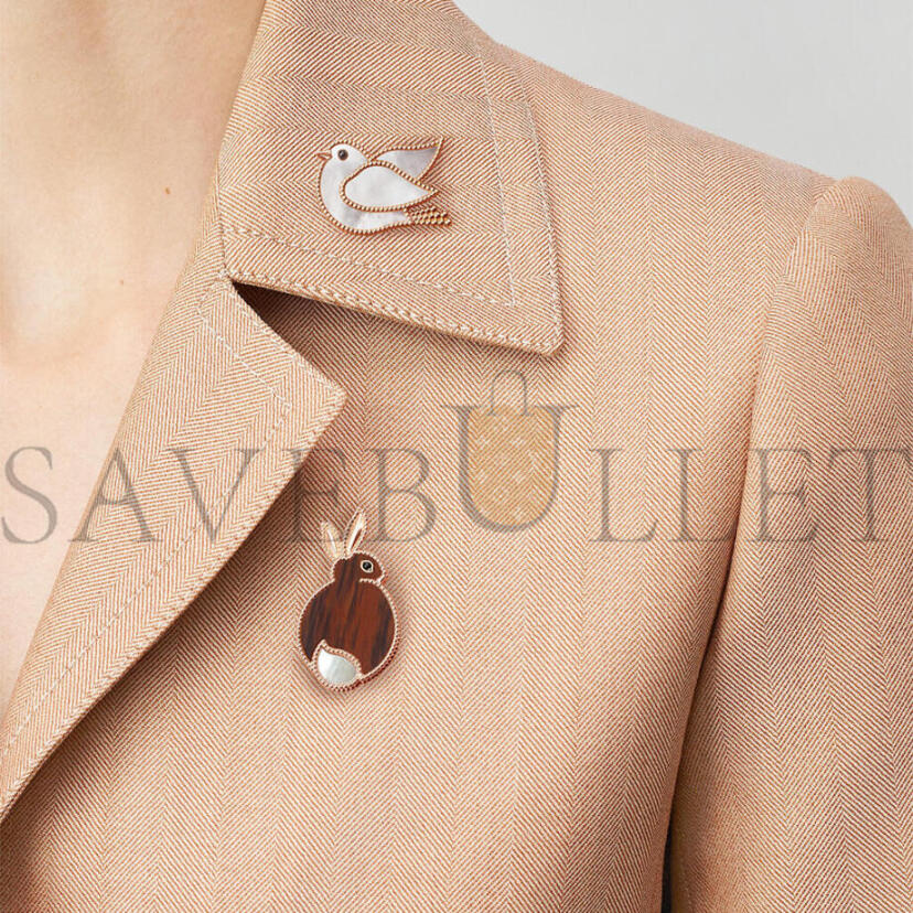 Lucky Animals Rabbit Clip, rose gold, mahogany obsidian, white mother-of-pearl, onyx. REFERENCE VCARP7UN00 STONE STONE Mother-of-pearl: 1 stone STONE Obsidian: 1 stone STONE Onyx: 1 stone CLASP Pin back for clip in rose gold