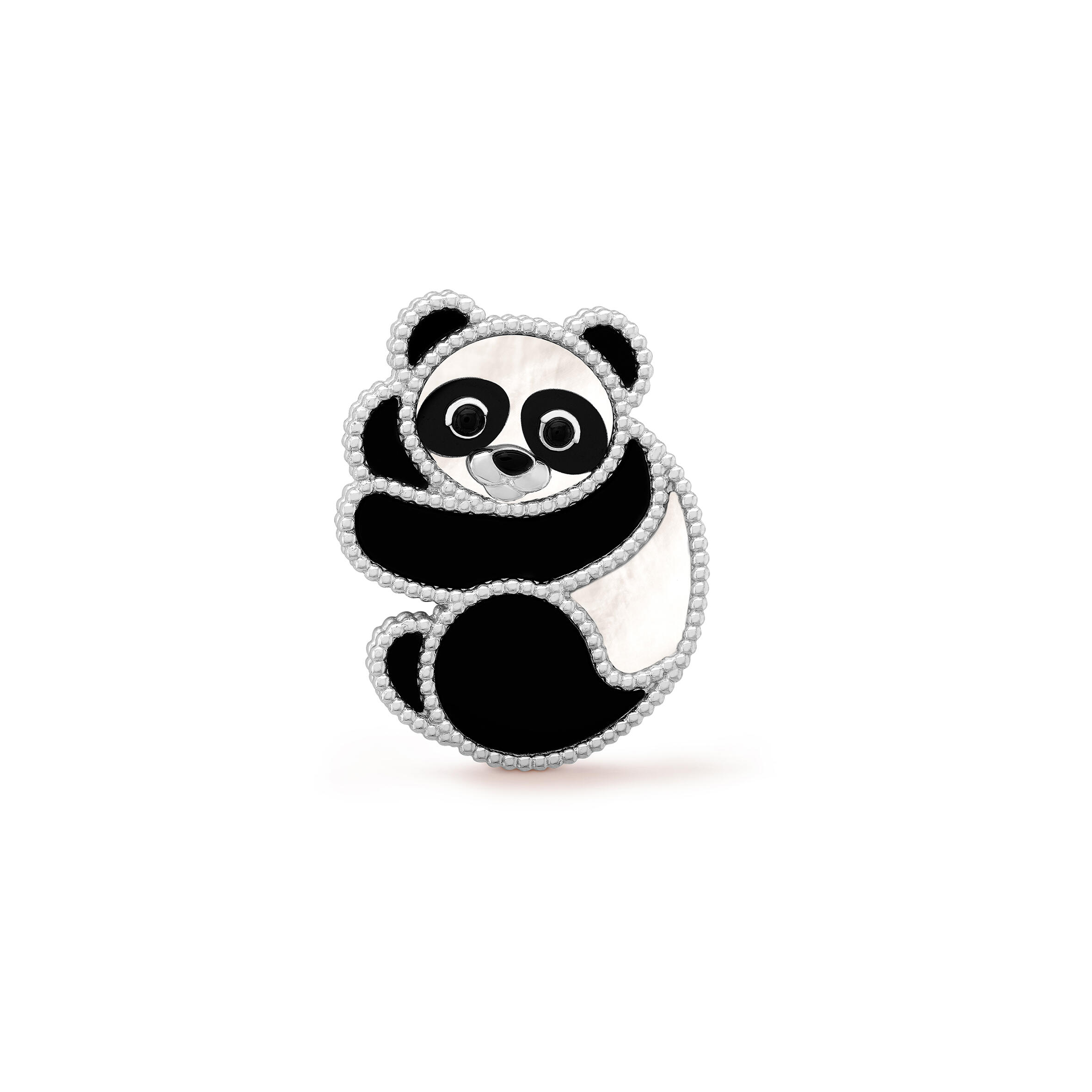 Lucky Animals Panda clip, white gold, white mother-of-pearl, onyx. REFERENCE VCARP5LI00 STONE STONE Mother-of-pearl: 2 stones STONE Onyx: 11 stones CLASP Pin back for clip in white gold