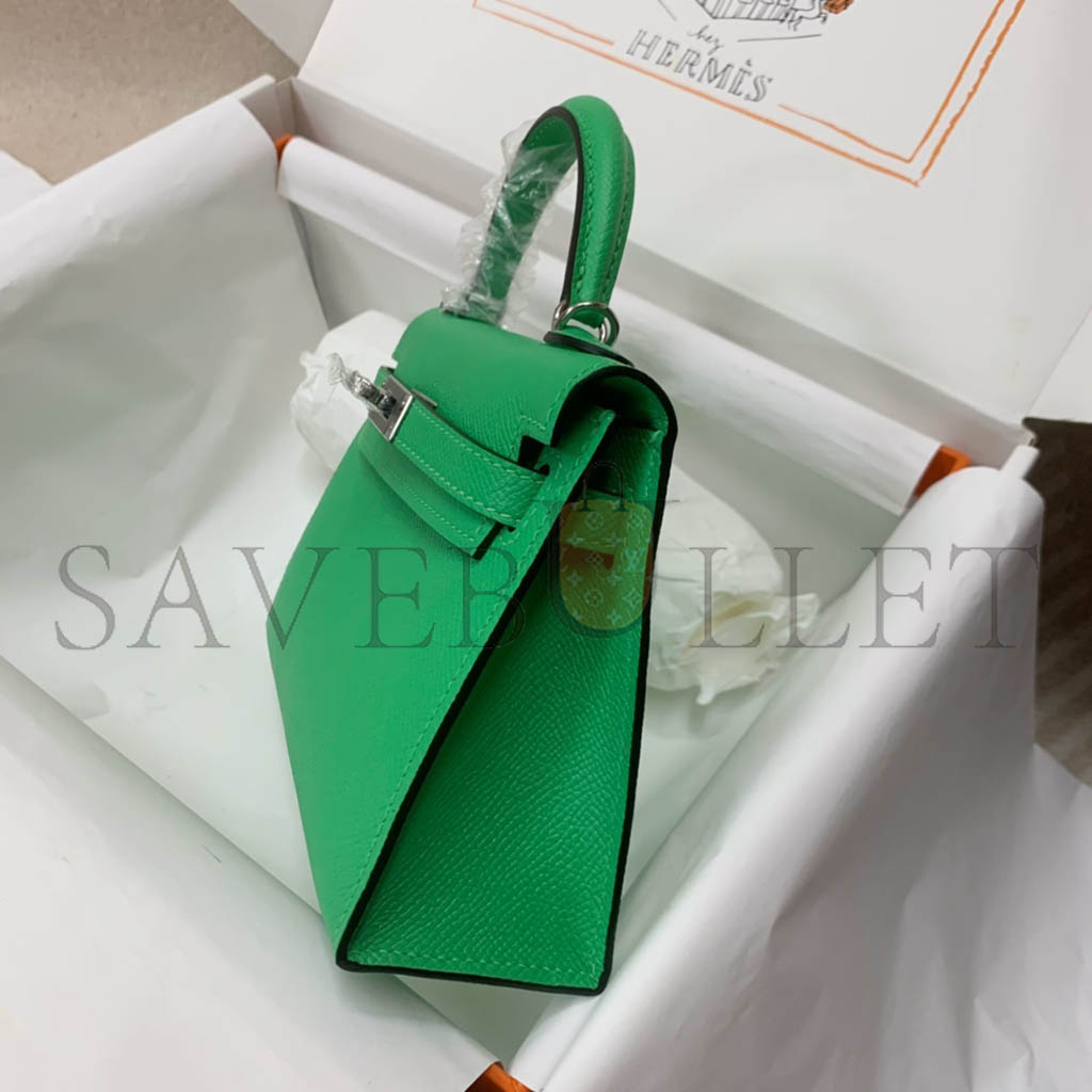 HERMÈS MINI KELLY II EPSOM COMIC GREEN SILVER BUCKLE (19*12*5.5cm)
