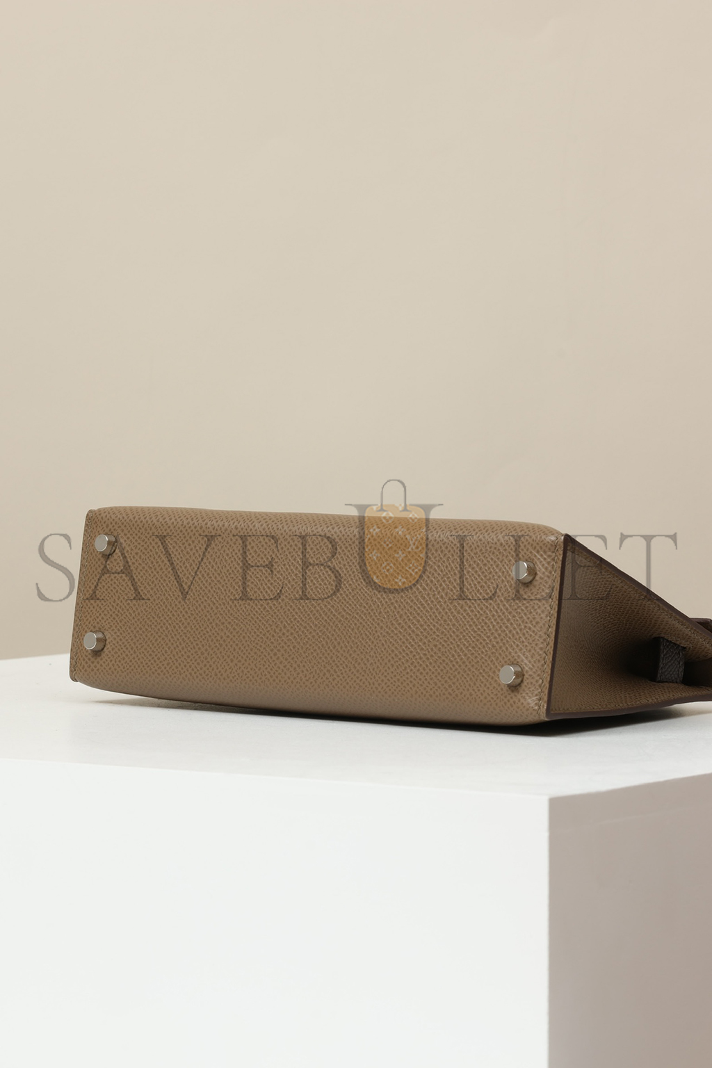 HERMÈS MINI KELLY II TRICOLOR ETOUPE ECORSE HANDBAG VEAU EPSOM GRAY BROWN BLACK SILVER HARDWARE OUTSIDE (19*12*5.5cm)