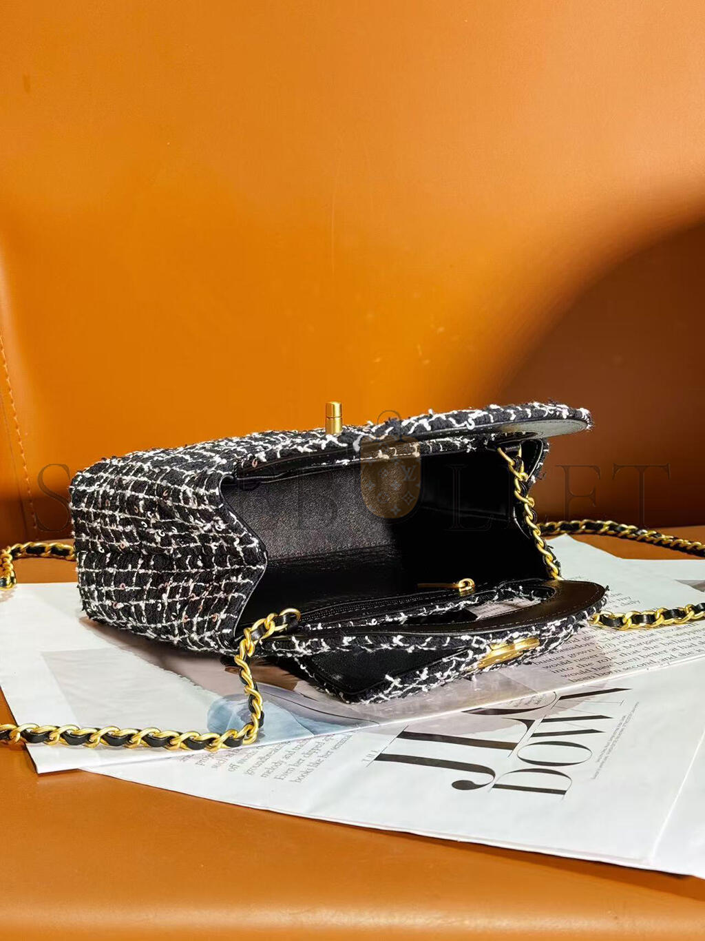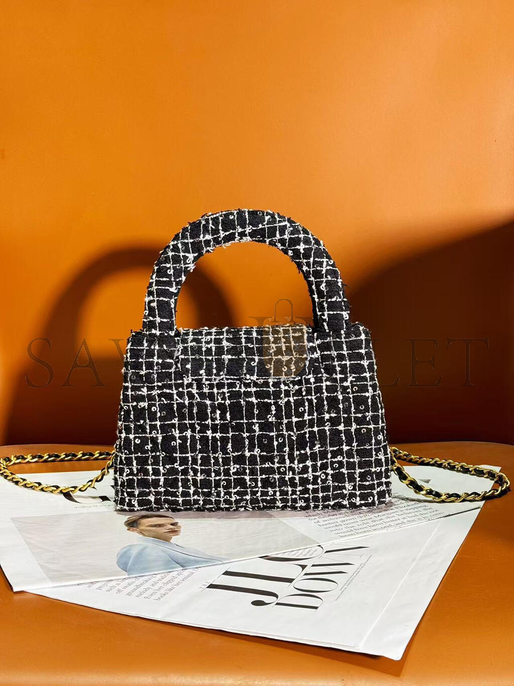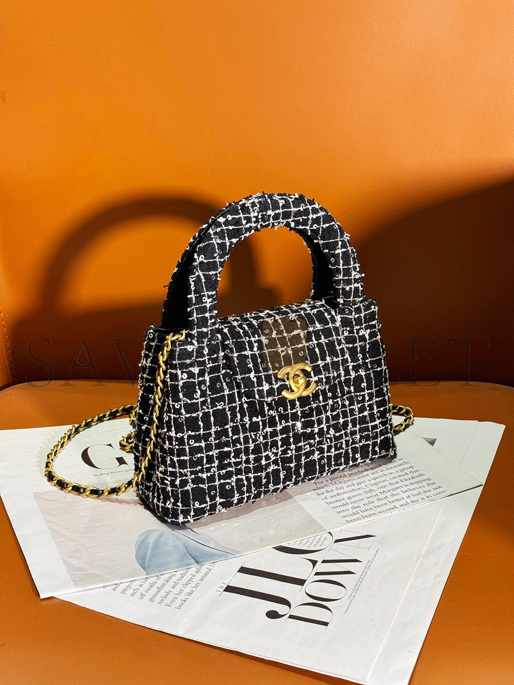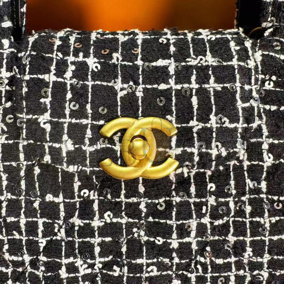 CHANEL SMALL KELLY SHOPPER BLACK, WHITE & SILVER SEQUIN TWEED BRUSHED GOLD HARDWARE AS4416 (19*13*7cm)