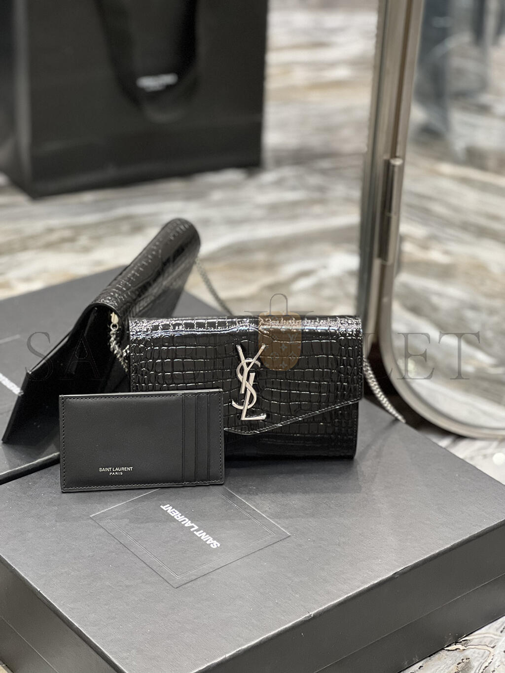 YSL UPTOWN CHAIN WALLET IN SHINY CROCODILE-EMBOSSED LEATHER 607788822045 (19*12*3cm)
