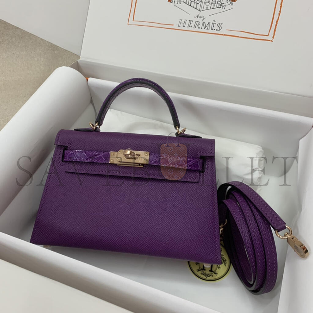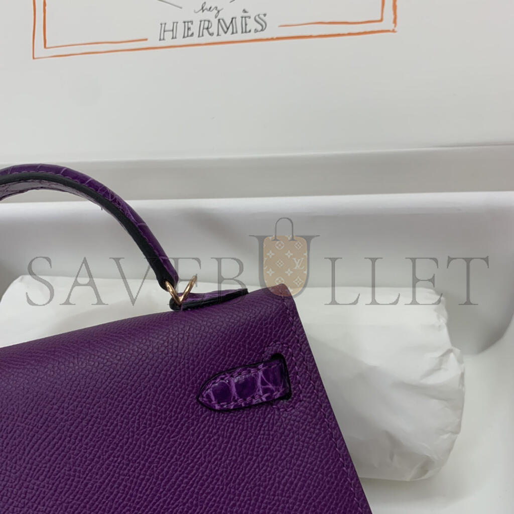 HERMÈS MINI KELLY II EPSOM LEATHER ANEMONE PURPLE AMERICAN ALLIGATOR CRYSTAL PURPLE GOLD BUCKLE HARDWARE (19*12*5.5cm)