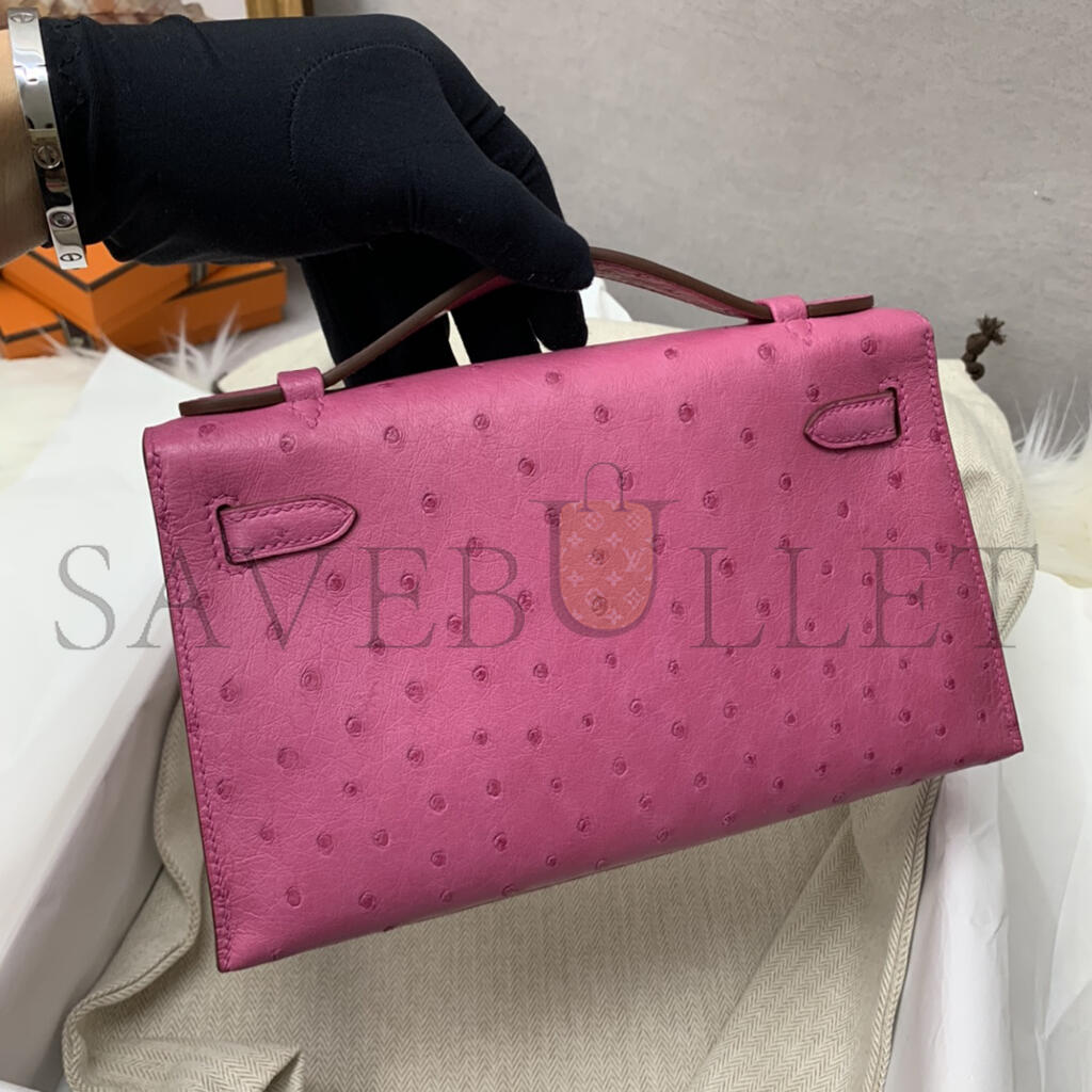 HERMÈS MASTER FUCHSIA OSTRICH KELLY POCHETTE PALLADIUM HARDWARE (22*14*7cm)