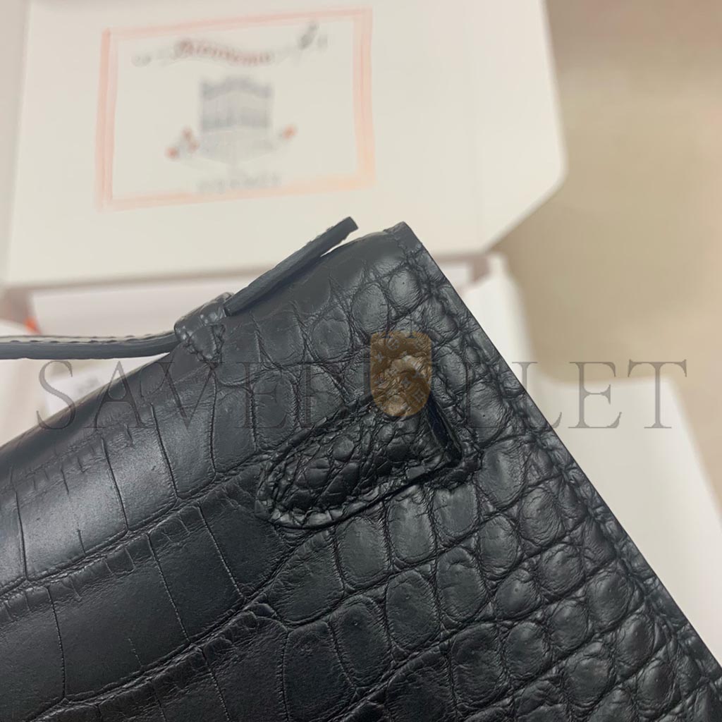 HERMÈS MASTER KELLY POCHETTE BAG MATTE BLACK CROCODILE CLUTCH PALLADIUM (22*14*7cm)