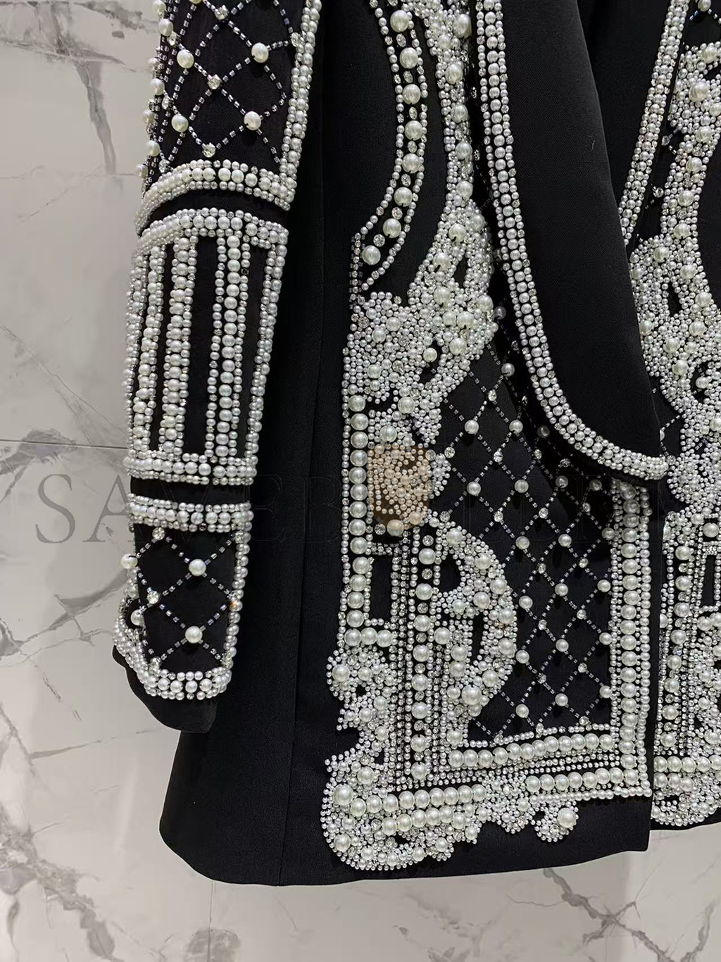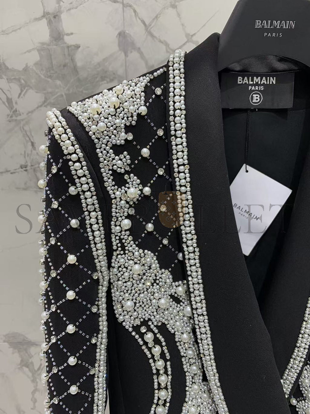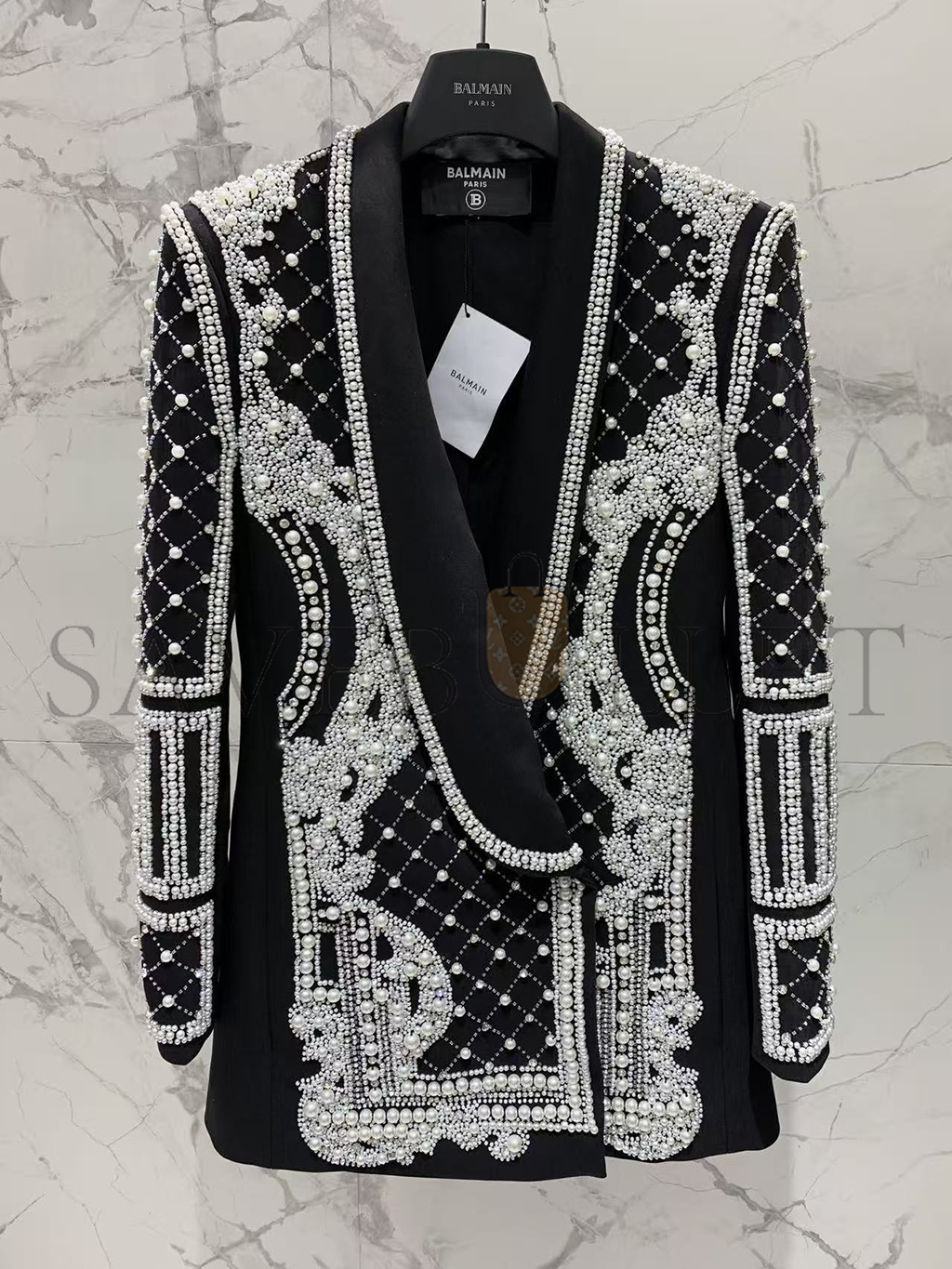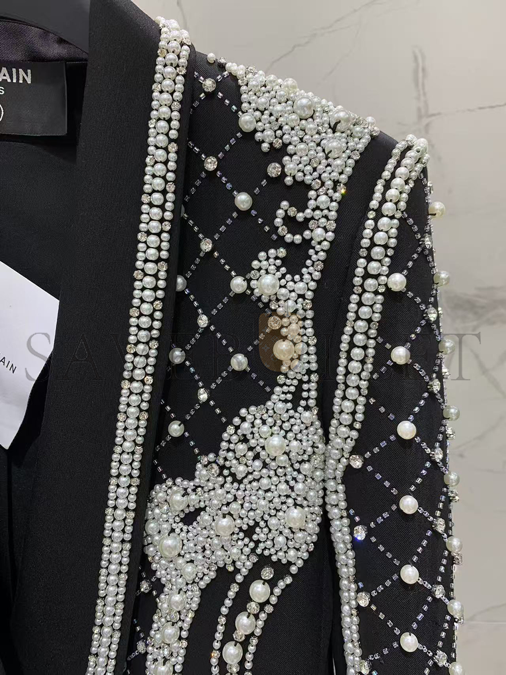 BALMAIN CRYSTALS & PEARLS EMBELLISHED LAPEL BLAZER