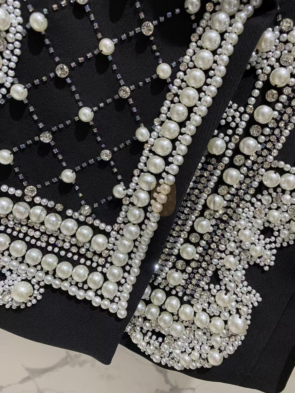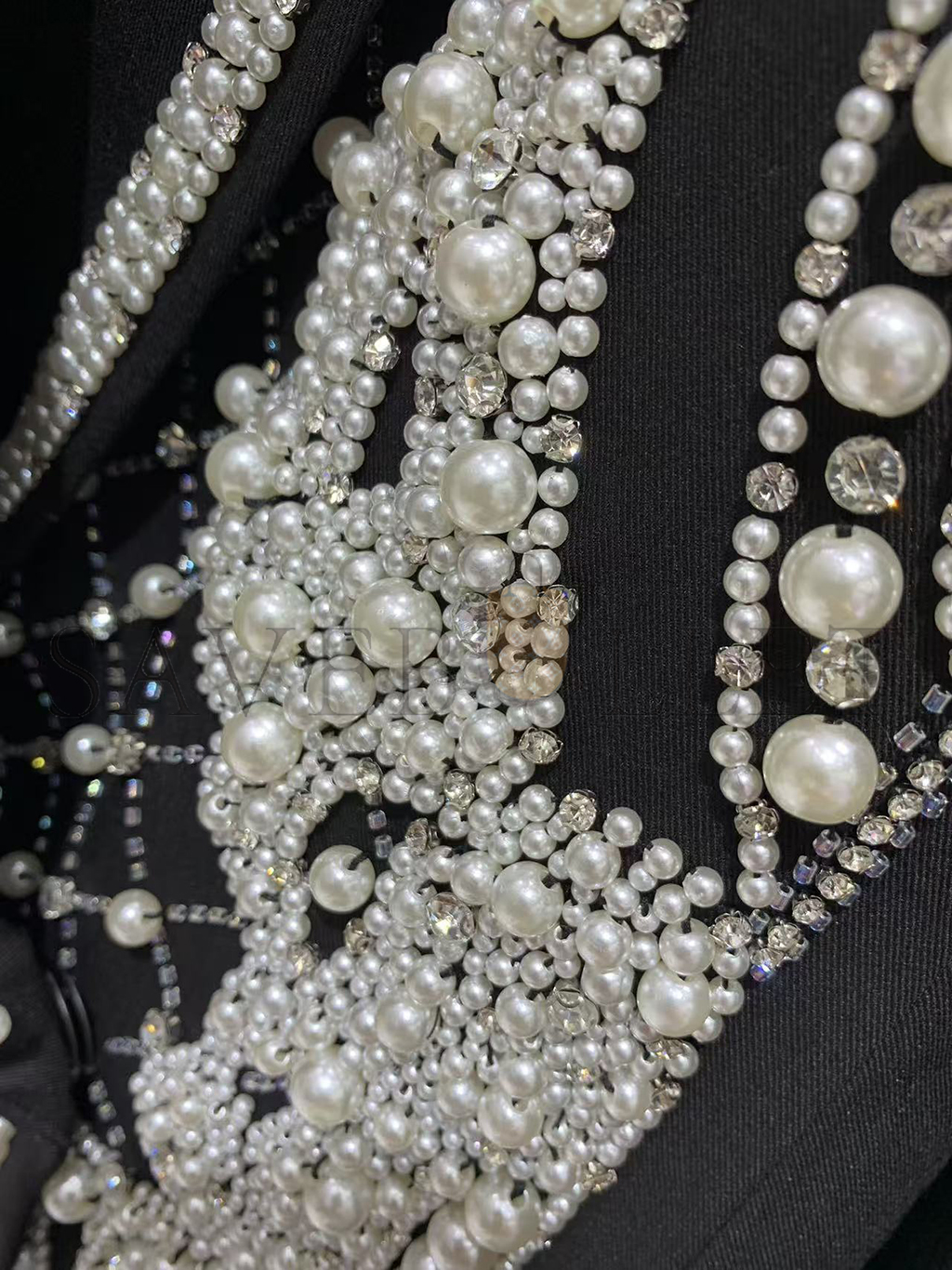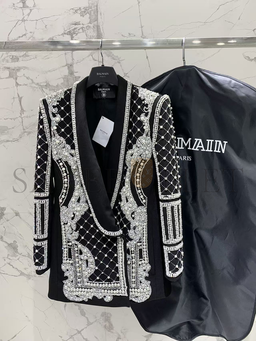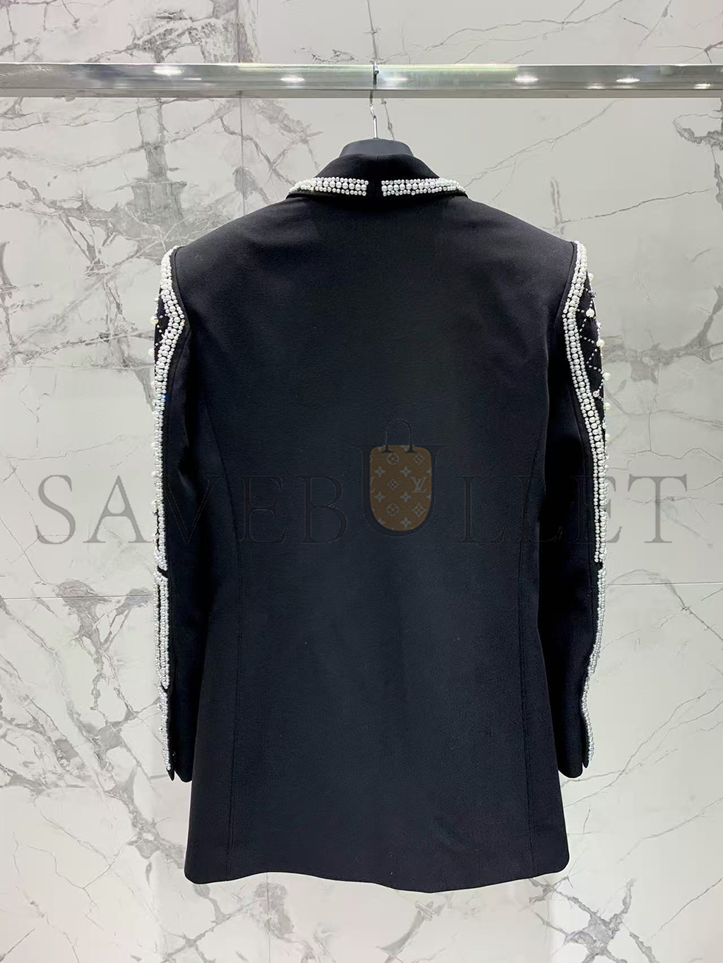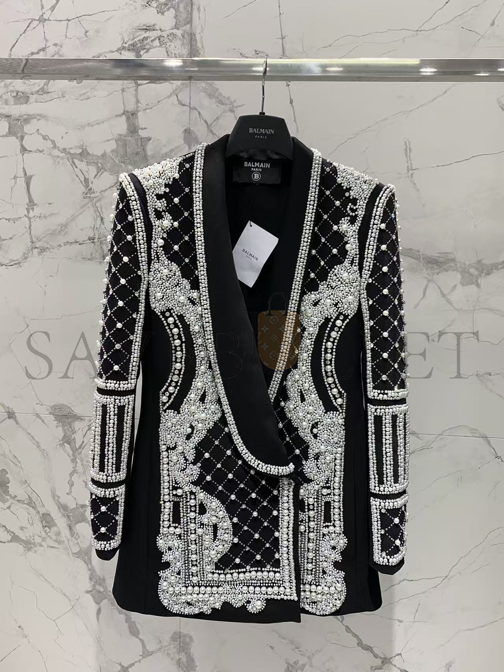 BALMAIN CRYSTALS & PEARLS EMBELLISHED LAPEL BLAZER